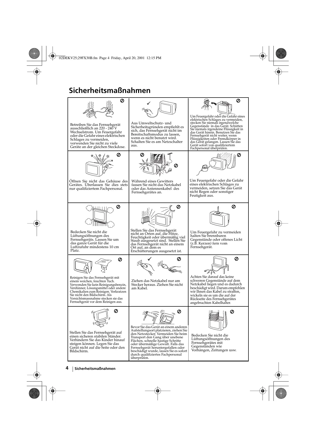 02DEKV25;29FX30B.fm Page 4 Friday, April 20, 2001 12:15 PM Sicherheitsmaßnahmen Betreiben Sie das Fernsehgerät ausschließlich an 220 - 240 V Wechselstrom. Um Feuergefahr oder die Gefahr eines elektrischen Schlages zu vermeiden, verwenden Sie nicht zu viele Geräte an der gleichen Steckdose. Aus Umweltschutz- und Sicherheitsgründen empfiehlt es sich, das Fernsehgerät nicht im Bereitschaftsmodus zu lassen, wenn es nicht benutzt wird. Schalten Sie es am Netzschalter aus. Öffnen Sie nicht das Gehäuse des Während eines Gewitters Gerätes. Überlassen Sie dies stets fassen Sie nicht das Netzkabel oder das Antennenkabel des nur qualifiziertem Fachpersonal. Fernsehgerätes an. Bedecken Sie nicht die Lüftungsöffnungen des Fernsehgeräts. Lassen Sie um das ganze Gerät für die Luftzufuhr mindestens 10 cm Platz. Reinigen Sie das Fernsehgerät mit einem weichen, feuchten Tuch. Verwenden Sie kein Reinigungsbenzin, Verdünner, Lösungsmittel oder andere Chemikalien zum Reinigen. Verkratzen Sie nicht den Bildschirm. Als Vorsichtsmassnahme stecken sie das Fernsehgerät vor dem Reinigen aus. Stellen Sie das Fernsehgerät auf einen sicheren stabilen Ständer. Verhindern Sie das Kinder hinauf steigen können. Legen Sie das Gerät nicht auf die Seite oder den Bildschirm.