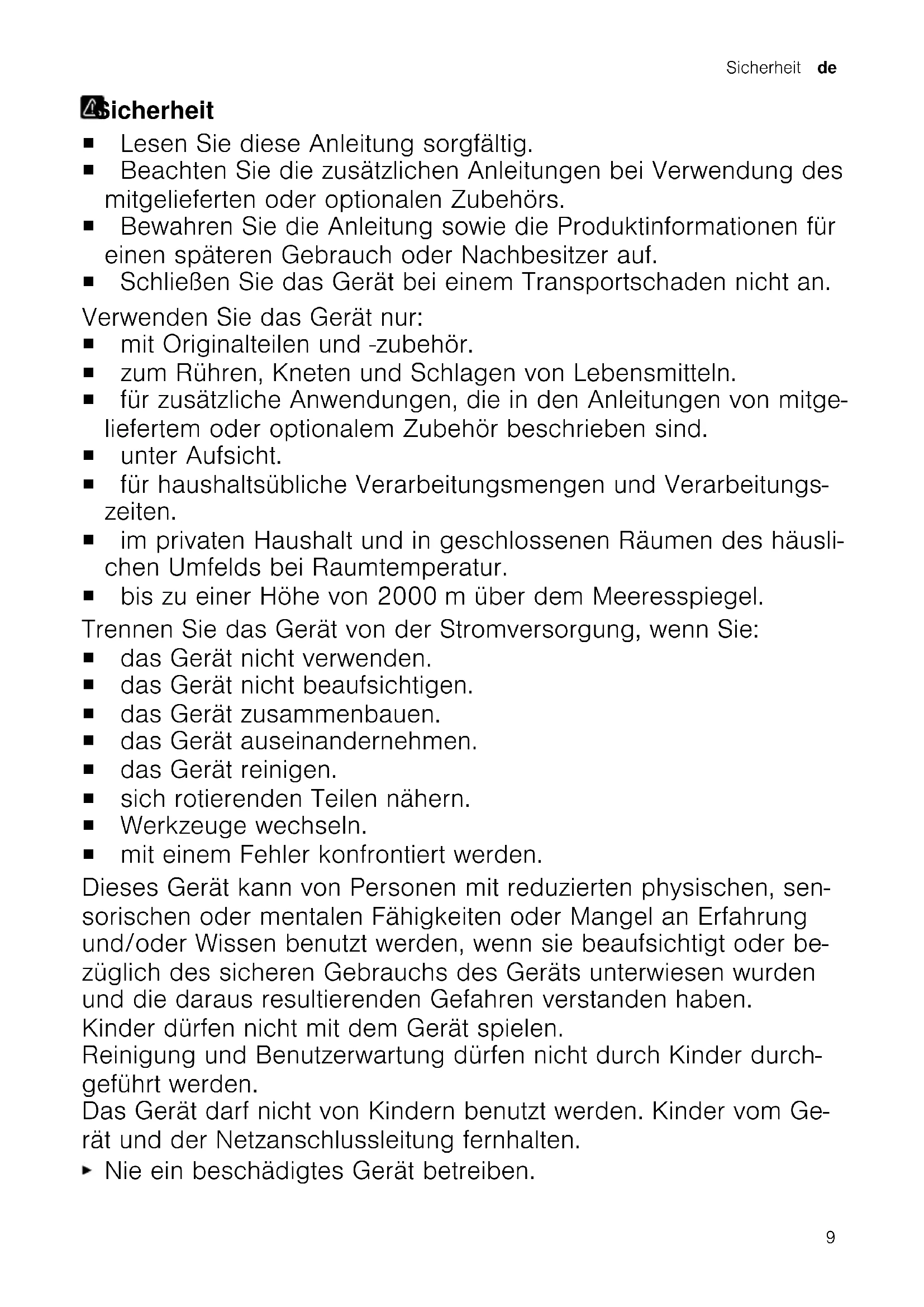 2728Sicherheit de Sicherheit Sicherheit ¡ Lesen Sie diese Anleitung sorgfältig. ¡ Beachten Sie die zusätzlichen Anleitungen bei Verwendung des mitgelieferten oder optionalen Zubehörs. ¡ Bewahren Sie die Anleitung sowie die Produktinformationen für einen späteren Gebrauch oder Nachbesitzer auf. ¡ Schließen Sie das Gerät bei einem Transportschaden nicht an. Verwenden Sie das Gerät nur: ¡ mit Originalteilen und -zubehör. ¡ zum Rühren, Kneten und Schlagen von Lebensmitteln. ¡ für zusätzliche Anwendungen, die in den Anleitungen von mitge- liefertem oder optionalem Zubehör beschrieben sind. ¡ unter Aufsicht. ¡ für haushaltsübliche Verarbeitungsmengen und Verarbeitungs- zeiten. ¡ im privaten Haushalt und in geschlossenen Räumen des häusli- chen Umfelds bei Raumtemperatur. ¡ bis zu einer Höhe von 2000m über dem Meeresspiegel. Trennen Sie das Gerät von der Stromversorgung, wenn Sie: ¡ das Gerät nicht verwenden. ¡ das Gerät nicht beaufsichtigen. ¡ das Gerät zusammenbauen. ¡ das Gerät auseinandernehmen. ¡ das Gerät reinigen. ¡ sich rotierenden Teilen nähern. ¡ Werkzeuge wechseln. ¡ mit einem Fehler konfrontiert werden. Dieses Gerät kann von Personen mit reduzierten physischen, sen- sorischen oder mentalen Fähigkeiten oder Mangel an Erfahrung und/oder Wissen benutzt werden, wenn sie beaufsichtigt oder be- züglich des sicheren Gebrauchs des Geräts unterwiesen wurden und die daraus resultierenden Gefahren verstanden haben. Kinder dürfen nicht mit dem Gerät spielen. Reinigung und Benutzerwartung dürfen nicht durch Kinder durch- geführt werden. Das Gerät darf nicht von Kindern benutzt werden. Kinder vom Ge- rät und der Netzanschlussleitung fernhalten. Nie ein beschädigtes Gerät betreiben. 9de Sicherheit Nie ein Gerät mit gerissener oder gebrochener Oberfläche be- treiben. Nie an der Netzanschlussleitung ziehen, um das Gerät vom Stromnetz zu trennen. Immer am Netzstecker der Netzanschluss- leitung ziehen. Wenn das Gerät oder die Netzanschlussleitung beschädigt ist, sofort den Netzstecker der Netzanschlussleitung ziehen oder die Sicherung im Sicherungskasten ausschalten. Den Kundendienst rufen.
