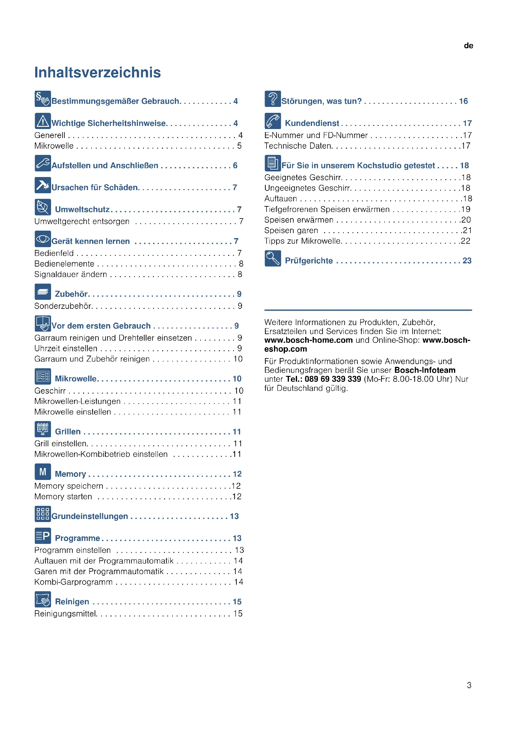 - Gerät kennen lernen . . . . . . . . . . . . . . . . . . . . . . 7 Bedienfeld . . . . . . . . . . . . . . . . . . . . . . . . . . . . . . . . . . 7 Bedienelemente . . . . . . . . . . . . . . . . . . . . . . . . . . . . . . 8 Signaldauer ändern . . . . . . . . . . . . . . . . . . . . . . . . . . . 8 _ Zubehör. . . . . . . . . . . . . . . . . . . . . . . . . . . . . . . . . 9 Sonderzubehör. . . . . . . . . . . . . . . . . . . . . . . . . . . . . . . 9 K Vor dem ersten Gebrauch . . . . . . . . . . . . . . . . . . 9 Garraum reinigen und Drehteller einsetzen . . . . . . . . . 9 Uhrzeit einstellen . . . . . . . . . . . . . . . . . . . . . . . . . . . . . 9 Garraum und Zubehör reinigen . . . . . . . . . . . . . . . . . 10 ^ Mikrowelle. . . . . . . . . . . . . . . . . . . . . . . . . . . . . . 10 Geschirr . . . . . . . . . . . . . . . . . . . . . . . . . . . . . . . . . . . 10 Mikrowellen-Leistungen . . . . . . . . . . . . . . . . . . . . . . . 11 Mikrowelle einstellen . . . . . . . . . . . . . . . . . . . . . . . . . 11 d Grillen . . . . . . . . . . . . . . . . . . . . . . . . . . . . . . . . . 11 Grill einstellen. . . . . . . . . . . . . . . . . . . . . . . . . . . . . . . 11 Mikrowellen-Kombibetrieb einstellen . . . . . . . . . . . . .11 B Memory . . . . . . . . . . . . . . . . . . . . . . . . . . . . . . . . 12 Memory speichern . . . . . . . . . . . . . . . . . . . . . . . . . . .12 Memory starten . . . . . . . . . . . . . . . . . . . . . . . . . . . . .12 Q Grundeinstellungen . . . . . . . . . . . . . . . . . . . . . . 13 P Programme . . . . . . . . . . . . . . . . . . . . . . . . . . . . . 13 Programm einstellen . . . . . . . . . . . . . . . . . . . . . . . . . 13 Auftauen mit der Programmautomatik . . . . . . . . . . . . 14 Garen mit der Programmautomatik . . . . . . . . . . . . . . 14 Kombi-Garprogramm . . . . . . . . . . . . . . . . . . . . . . . . . 14 D Reinigen . . . . . . . . . . . . . . . . . . . . . . . . . . . . . . . 15 Reinigungsmittel. . . . . . . . . . . . . . . . . . . . . . . . . . . . . 15 3 Störungen, was tun? . . . . . . . . . . . . . . . . . . . . . 16 4 Kundendienst . . . . . . . . . . . . . . . . . . . . . . . . . . . 17 E-Nummer und FD-Nummer . . . . . . . . . . . . . . . . . . . .17 Technische Daten. . . . . . . . . . . . . . . . . . . . . . . . . . . .17 J Für Sie in unserem Kochstudio getestet . . . . . 18 Geeignetes Geschirr. . . . . . . . . . . . . . . . . . . . . . . . . .18 Ungeeignetes Geschirr. . . . . . . . . . . . . . . . . . . . . . . .18 Auftauen . . . . . . . . . . . . . . . . . . . . . . . . . . . . . . . . . . .18 Tiefgefrorenen Speisen erwärmen . . . . . . . . . . . . . . .19 Speisen erwärmen . . . . . . . . . . . . . . . . . . . . . . . . . . .20 Speisen garen . . . . . . . . . . . . . . . . . . . . . . . . . . . . . .21 Tipps zur Mikrowelle. . . . . . . . . . . . . . . . . . . . . . . . . .22 E Prüfgerichte . . . . . . . . . . . . . . . . . . . . . . . . . . . . 23 Produktinfo Weitere Informationen zu Produkten, Zubehör, Ersatzteilen und Services finden Sie im Internet: www.bosch-home.com und Online-Shop: www.bosch- eshop.com Für Produktinformationen sowie Anwendungs- und Bedienungsfragen berät Sie unser Bosch-Infoteam unter Tel.: 089 69 339 339 (Mo-Fr: 8.00-18.00 Uhr) Nur für Deutschland gültig.de Bestimmungsgemäßer Gebrauch