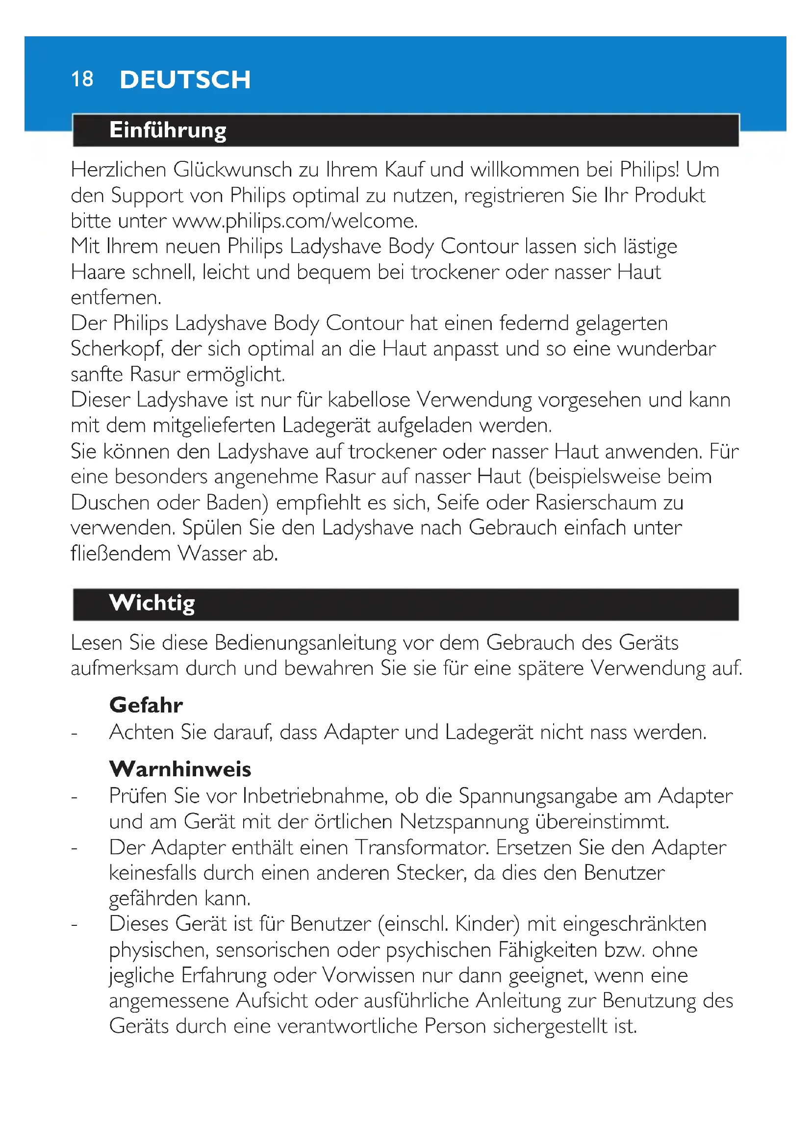 DANSK16Udtagning af batteriet 1 Tag ladyshaveren ud af opladeren. 2 Lad motoren køre, til batteriet er løbet helt tør for strøm. 3 Tag godt fat om ladyshaverens øverste del, og træk den af den nederstedel(g.22). 4 Fjernbatterietmedenskruetrækker(g.23). Reklamationsret og service For alle yderligere oplysninger eller ved eventuelle problemer med apparatet henvises til Philips’ hjemmeside på adressen www.philips.com eller det lokale Philips Kundecenter (telefonnumre ndes i vedlagte “World-Wide Guarantee”-folder). Hvis der ikke ndes et kundecenter i dit land, bedes du venligst kontakte din lokale Philips-forhandler eller Serviceafdelingen i Philips Domestic Appliances and Personal Care BV. DANSK 1718 Einführung Herzlichen Glückwunsch zu Ihrem Kauf und willkommen bei Philips! Um den Support von Philips optimal zu nutzen, registrieren Sie Ihr Produkt bitte unter www.philips.com/welcome. Mit Ihrem neuen Philips Ladyshave Body Contour lassen sich lästige Haare schnell, leicht und bequem bei trockener oder nasser Haut entfernen. Der Philips Ladyshave Body Contour hat einen federnd gelagerten Scherkopf, der sich optimal an die Haut anpasst und so eine wunderbar sanfte Rasur ermöglicht. Dieser Ladyshave ist nur für kabellose Verwendung vorgesehen und kann mit dem mitgelieferten Ladegerät aufgeladen werden. Sie können den Ladyshave auf trockener oder nasser Haut anwenden. Für eine besonders angenehme Rasur auf nasser Haut (beispielsweise beim Duschen oder Baden) empehlt es sich, Seife oder Rasierschaum zu verwenden. Spülen Sie den Ladyshave nach Gebrauch einfach unter ießendem Wasser ab. Wichtig Lesen Sie diese Bedienungsanleitung vor dem Gebrauch des Geräts aufmerksam durch und bewahren Sie sie für eine spätere Verwendung auf. Gefahr Achten Sie darauf, dass Adapter und Ladegerät nicht nass werden. Warnhinweis Prüfen Sie vor Inbetriebnahme, ob die Spannungsangabe am Adapter und am Gerät mit der örtlichen Netzspannung übereinstimmt. Der Adapter enthält einen Transformator. Ersetzen Sie den Adapter keinesfalls durch einen anderen Stecker, da dies den Benutzer gefährden kann. Dieses Gerät ist für Benutzer (einschl. Kinder) mit eingeschränkten physischen, sensorischen oder psychischen Fähigkeiten bzw. ohne jegliche Erfahrung oder Vorwissen nur dann geeignet, wenn eine angemessene Aufsicht oder ausführliche Anleitung zur Benutzung des Geräts durch eine verantwortliche Person sichergestellt ist.