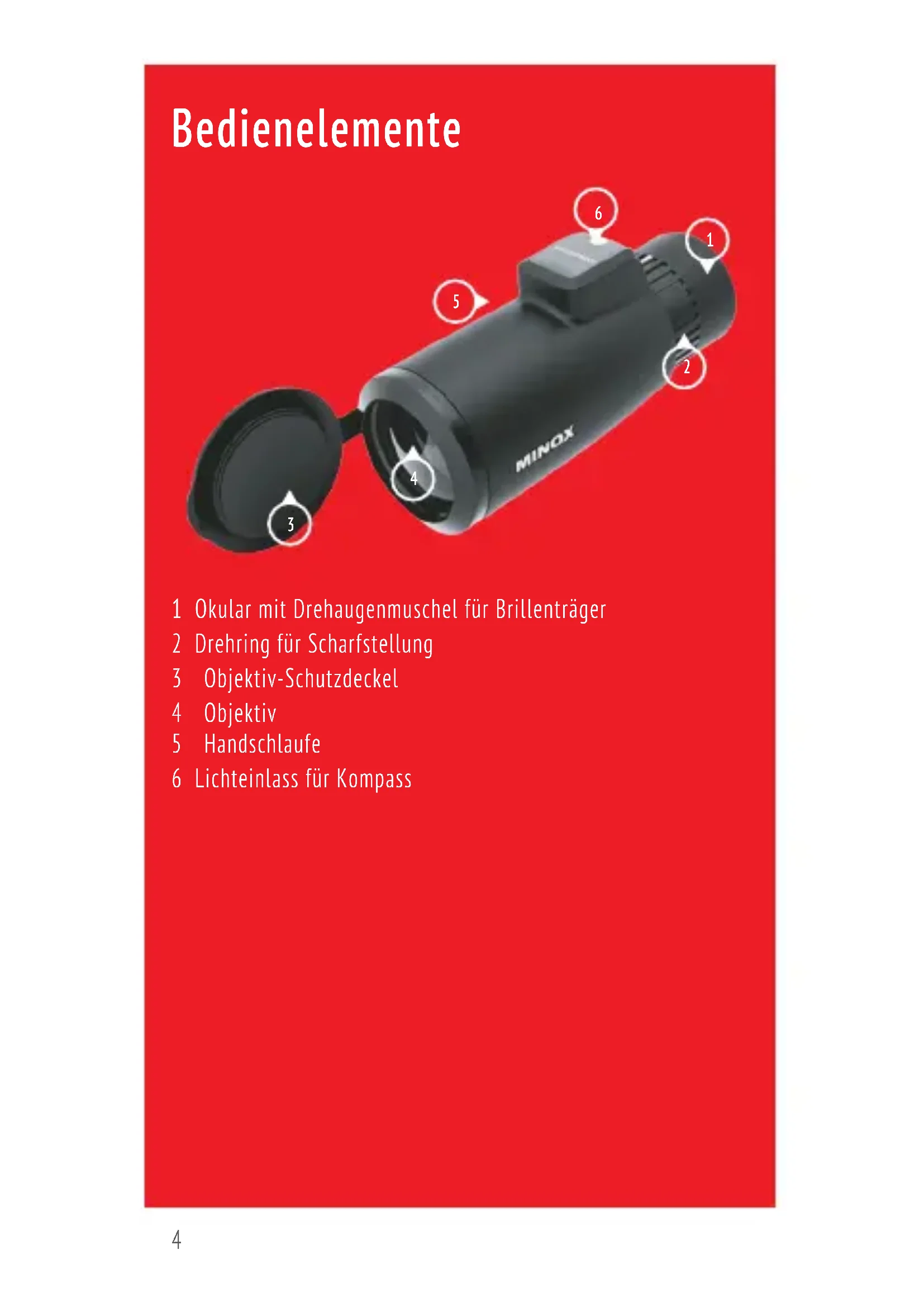 1 Okular mit Drehaugenmuschel für Brillenträger 2 Drehring für Scharfstellung 3 Objektiv-Schutzdeckel 4 Objektiv 5 Handschlaufe 6 Lichteinlass für Kompass Kundendienst Im Schadensfall steht Ihnen unser Kundendienst unter folgender Adresse zur Verfügung: MINOX GmbH Wilhelm-Loh-Str. 1 D-35578 Wetzlar Tel : +49 (0) 7562 98 135 01 E-Mail: service@minox.com www.minox.com Im Ausland wenden Sie sich bitte an unsere autorisierten Kunden- dienstwerkstätten oder an eine unserer MINOX Vertretungen. Die Adressen der Vertretungen finden Sie auf unserer Internetseite www.minox.com MINOX_BDA_MD7x42C_65x115mm_DE_EN_FR_ES_IT_V01.indd 4MINOX_BDA_MD7x42C_65x115mm_DE_EN_FR_ES_IT_V01.indd 4 08.06.2021 16:11:1008.06.2021 16:11:105 Bedienelemente