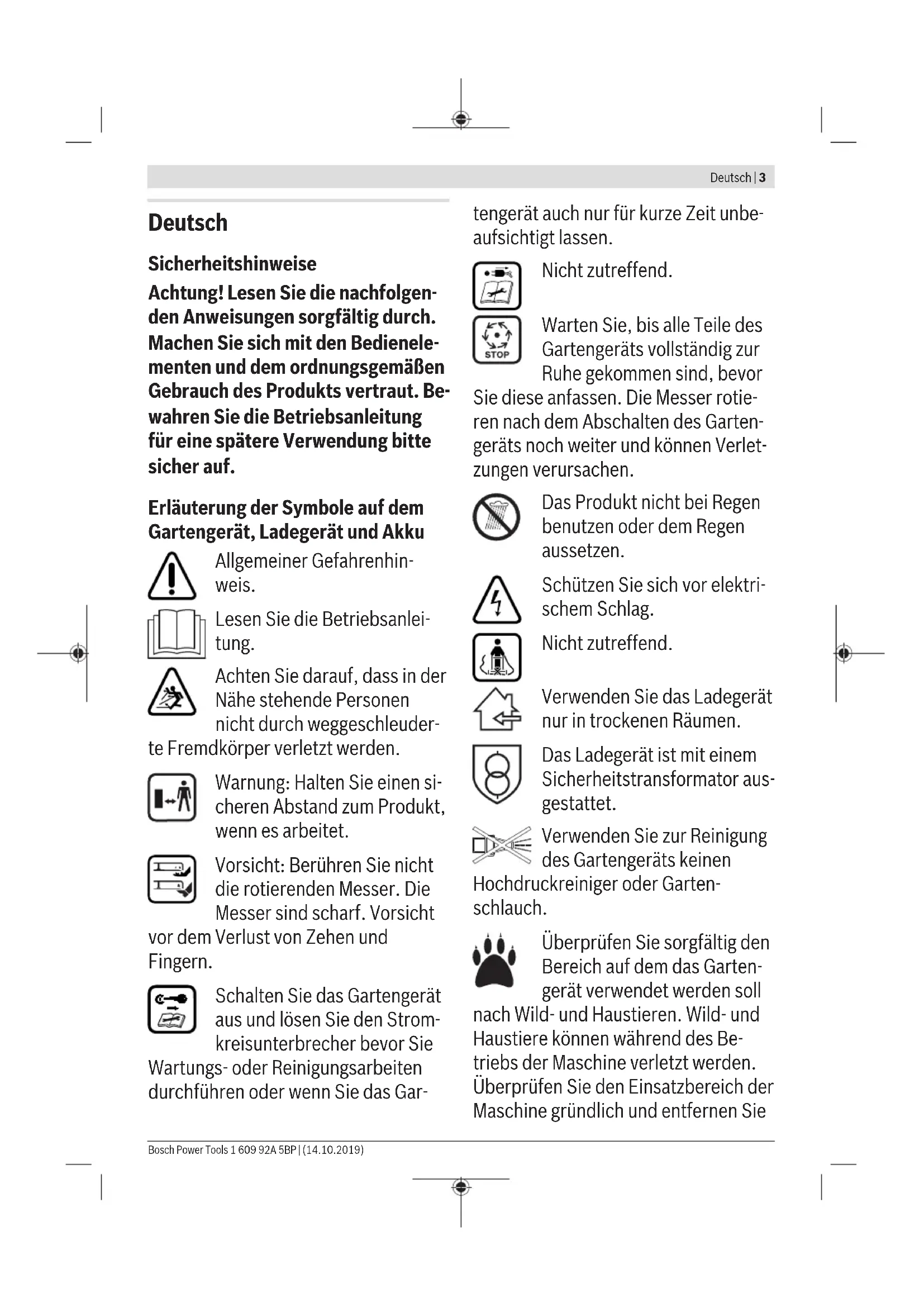r eine spätere Verwendung bitte sicher auf. Erläuterung der Symbole auf dem Gartengerät, Ladegerät und Akku Allgemeiner Gefahrenhin- weis. Lesen Sie die Betriebsanlei- tung. Achten Sie darauf, dass in der Nähe stehende Personen nicht durch weggeschleuder- te Fremdkörper verletzt werden. Warnung: Halten Sie einen si- cheren Abstand zum Produkt, wenn es arbeitet. Vorsicht: Berühren Sie nicht die rotierenden Messer. Die Messer sind scharf. Vorsicht vor dem Verlust von Zehen und Fingern. Schalten Sie das Gartengerät aus und lösen Sie den Strom- kreisunterbrecher bevor Sie Wartungs- oder Reinigungsarbeiten durchführen oder wenn Sie das Gar- tengerät auch nur für kurze Zeit unbe- aufsichtigt lassen. Nicht zutreffend. Warten Sie, bis alle Teile des Gartengeräts vollständig zur Ruhe gekommen sind, bevor Sie diese anfassen. Die Messer rotie- ren nach dem Abschalten des Garten- geräts noch weiter und können Verlet- zungen verursachen. Das Produkt nicht bei Regen benutzen oder dem Regen aussetzen. Schützen Sie sich vor elektri- schem Schlag. Nicht zutreffend. Verwenden Sie das Ladegerät nur in trockenen Räumen. Das Ladegerät ist mit einem Sicherheitstransformator aus- gestattet. Verwenden Sie zur Reinigung des Gartengeräts keinen Hochdruckreiniger oder Garten- schlauch. Überprüfen Sie sorgfältig den Bereich auf dem das Garten- gerät verwendet werden soll nach Wild- und Haustieren. Wild- und Haustiere können während des Be- triebs der Maschine verletzt werden. Überprüfen Sie den Einsatzbereich der Maschine gründlich und entfernen Sie Bosch Power Tools 1 609 92A 5BP | (14.10.2019)4 | Deutsch alle Steine, Stöcke, Drähte, Knochen und fremde Gegenstände. Achten Sie beim Einsatz der Maschine darauf, dass keine Wildtiere, Haustiere oder kleine Baumstümpfe im dichten Gras versteckt sind. Bedienung u Niemals Kindern oder mit diesen An- weisungen nicht vertrauten Perso- nen erlauben das Produkt zu benut- zen. Nationale Vorschriften be- schränken möglicherweise das Alter des Bedieners. Bewahren Sie das Produkt für Kinder unerreichbar auf, wenn es nicht in Gebrauch ist. u Erlauben Sie Kindern, Personen mit eingeschränkten physischen, senso- rischen oder geistigen Fähigkeiten oder mangelnder Erfahrung und/ oder mangelndem Wissen und/oder mit diesen Anweisungen nicht ver- trauten Personen niemals das Gar- tengerät zu benutzen. u Kinder sollten beaufsichtigt werden, um sicherzustellen, dass sie nicht mit dem Produkt spielen. u Benutzen Sie das Gartengerät nie- mals während sich Personen, insbe- sondere Kinder oder Haustiere, in unmittelbarer Nähe aufhalten. u Der Bediener ist fur Unfälle oder Schäden an anderen Menschen oder deren Eigentum verantwortlich. u Benutzen Sie keine offenen Gummi- schuhe oder Sandalen, wenn Sie das Produkt benutzen. Tragen Sie stets festes Schuhwerk und eine lange Ho- se. u Inspizieren Sie die zu bearbeitende Fläche sorgfältig und beseitigen Sie Steine, Stöcke, Drähte, Knochen und sonstige Fremdkörper. u Prüfen Sie vor der Benutzung immer, ob Messer, Messerschrauben und Schneidbaugruppe abgenutzt oder beschädigt sind. Tauschen Sie abge- nutzte oder beschädigte Messer so- wie Messerschrauben immer im gan- zen Satz aus, um Unwucht zu vermei- den. u Mähen Sie nur bei Tageslicht oder gutem künstlichem Licht. u Bei schlechten Wetterbedingungen insbesondere bei einem aufziehen- dem Gewitter nicht mit dem Rasen- mäher arbeiten. u Betreiben Sie das Gartengerät nach Möglichkeit nicht bei nassem Gras. u Stets ruhig gehen, niemals schnell laufen. u Betreiben Sie das Gartengerät nie- mals mit defekten Schutzvorrichtun- gen, Abdeckungen oder ohne Sicher- heitseinrichtungen, wie z.B. Prall- schutz und/oder Grasfangkorb. u Wir empfehlen, einen Gehörschutz zu Ihrem eigenen Schutz zu tragen. u Benutzen Sie das Produkt nicht, wenn Sie müde oder krank sind oder unter dem Einfluss von Alkohol, Dro- gen oder Medikamenten stehen. u Das Arbeiten an Böschungen kann gefährlich sein: 1 609 92A 5BP | (14.10.2019) Bosch Power ToolsDeutsch | 5 − Mähen Sie keine besonders steilen Abhänge. − Achten Sie auf schrägen Flächen oder auf nassem Gras stets auf si- cheren Tritt. − Mähen Sie auf schrägen Flächen immer quer und niemals auf- und ab- wärts. − Gehen Sie beim Richtungswechsel an Abhängen äußerst vorsichtig vor. u Gehen Sie beim Rückwärtsgehen oder Ziehen des Gartengeräts äu- ßerst vorsichtig vor. u Schieben Sie das Gartengerät beim Mähen immer vorwärts und ziehen Sie dieses niemals zum Körper hin. u Die Messer müssen stehen, wenn Sie das Gartengerät für den Transport kippen müssen, wenn Sie nicht mit Gras bepflanzte Flächen überqueren und wenn Sie das Gartengerät zu und von dem zu mähenden Bereich transportieren. u Kippen Sie das Gartengerät beim Starten oder Anlassen des Motors nicht. u Schalten Sie das Gartengerät wie in der Betriebsanleitung beschrieben ein und achten Sie darauf, dass Ihre Füße ausreichend weit von rotieren- den Teilen entfernt sind. u Bringen Sie Ihre Hände und Füße nicht in die Nähe oder unter rotieren- de Teile. u Halten Sie Abstand zur Auswurfzone, wenn Sie mit dem Gartengerät arbei- ten. u Heben bzw. tragen Sie das Gartenge- rät niemals bei laufendem Motor. u Achten Sie darauf, dass bei der Lagerung das Gartengerät mit allen 4 Räder auf dem Boden steht. u Heben Sie das Gartengerät nur mit dem Tragegriff an. Den Tragegriff mit Vorsicht behandeln. u Nehmen Sie keine Veränderungen am Produkt vor. Unzulässige Verän- derungen können die Sicherheit Ih- res Produkts beeinträchtigen und zu verstärkten Geräuschen und Vibra- tionen führen. Laubsammeln Das Laubsammelmesser ist so ge- formt, dass es Herbstlaub von ihrem Rasen aufnehmen kann. Damit diese Funktion ein optimales Ergebnis er- zielt, ist folgendes einzuhalten: – Sammeln Sie Laub nur bei maxima- ler Schnitthöhe. – Sammeln Sie Laub nur auf Ihrem Rasen. – Inspizieren Sie vor dem Laubsam- meln die Arbeitsfläche und ha
