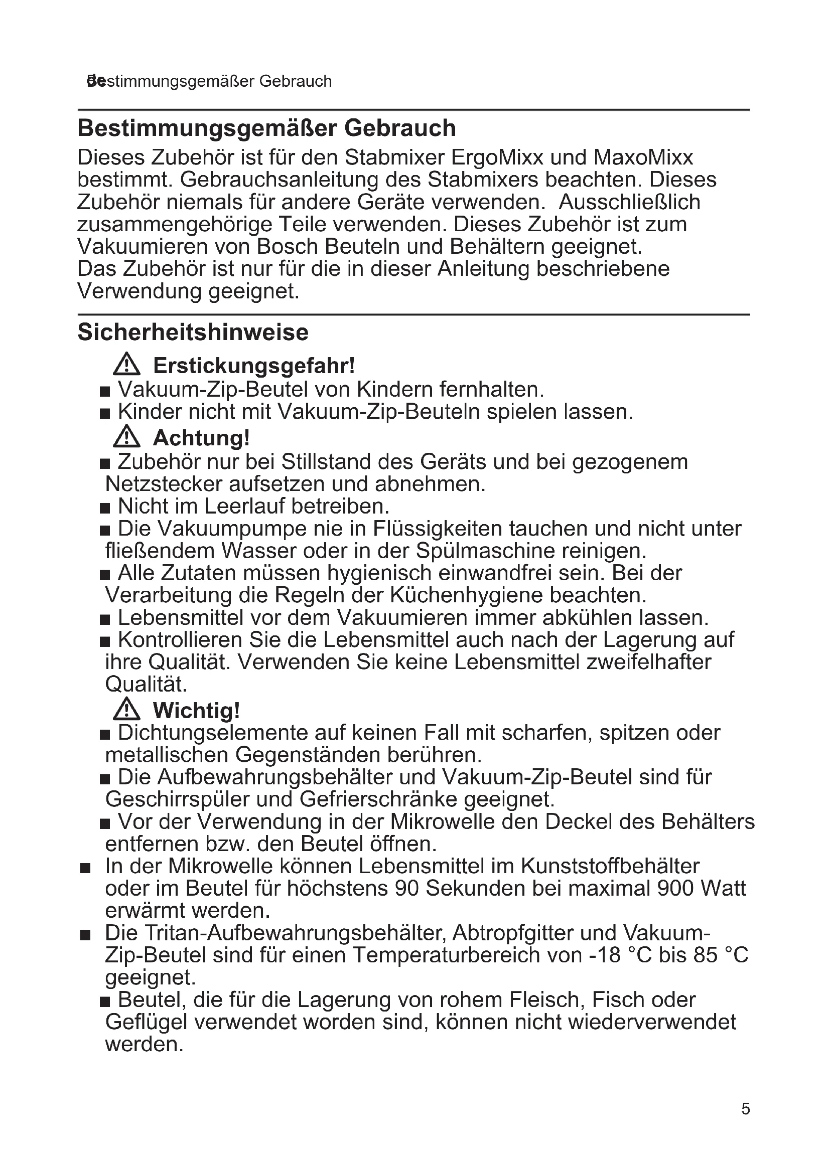 Bestimmungsgemäßer Gebrauch Bestimmungsgemäßer Gebrauch Dieses Zubehör ist für den Stabmixer ErgoMixx und MaxoMixx bestimmt. Gebrauchsanleitung des Stabmixers beachten. Dieses Zubehör niemals für andere Geräte verwenden. Ausschließlich zusammengehörige Teile verwenden. Dieses Zubehör ist zum Vakuumieren von Bosch Beuteln und Behältern geeignet. Das Zubehör ist nur für die in dieser Anleitung beschriebene Verwendung geeignet. Sicherheitshinweise W Erstickungsgefahr! ■ Vakuum-Zip-Beutel von Kindern fernhalten. ■ Kinder nicht mit Vakuum-Zip-Beuteln spielen lassen. W Achtung! ■ Zubehör nur bei Stillstand des Geräts und bei gezogenem Netzstecker aufsetzen und abnehmen. ■ Nicht im Leerlauf betreiben. ■ Die Vakuumpumpe nie in Flüssigkeiten tauchen und nicht unter ießendem Wasser oder in der Spülmaschine reinigen. ■ Alle Zutaten müssen hygienisch einwandfrei sein. Bei der Verarbeitung die Regeln der Küchenhygiene beachten. ■ Lebensmittel vor dem Vakuumieren immer abkühlen lassen. ■ Kontrollieren Sie die Lebensmittel auch nach der Lagerung auf ihre Qualität. Verwenden Sie keine Lebensmittel zweifelhafter Qualität. W Wichtig! ■ Dichtungselemente auf keinen Fall mit scharfen, spitzen oder metallischen Gegenständen berühren. ■ Die Aufbewahrungsbehälter und Vakuum-Zip-Beutel sind für Geschirrspüler und Gefrierschränke geeignet. ■ Vor der Verwendung in der Mikrowelle den Deckel des Behälters entfernen bzw. den Beutel önen. ■ In der Mikrowelle können Lebensmittel im Kunststobehälter oder im Beutel für höchstens 90 Sekunden bei maximal 900 Watt erwärmt werden. ■ Die Tritan-Aufbewahrungsbehälter, Abtropfgitter und Vakuum- Zip-Beutel sind für einen Temperaturbereich von -18 °C bis 85 °C geeignet. ■ Beutel, die für die Lagerung von rohem Fleisch, Fisch oder Geügel verwendet worden sind, können nicht wiederverwendet werden.6 de Sicherheitshinweise Auf einen Blick X Bild A 1 Vakuumpumpe a Vakuum-Ventil b Anschluß für Grundgerät 2 Aufbewahrungsbehälter * a Behälter aus: – Tritan-Kunsto * – Glas * b Abtropfgitter * c Deckel d Verschluss-Clips e Vakuum-Verschluss f Vakuum-Anzeige g Einstellringe für Datum (Tag/Monat) h Deckeldichtung 3 Vakuum-Zip-Beutel * a Zip-Verschluss b Markierungslinie max c Vakuum-Verschluss