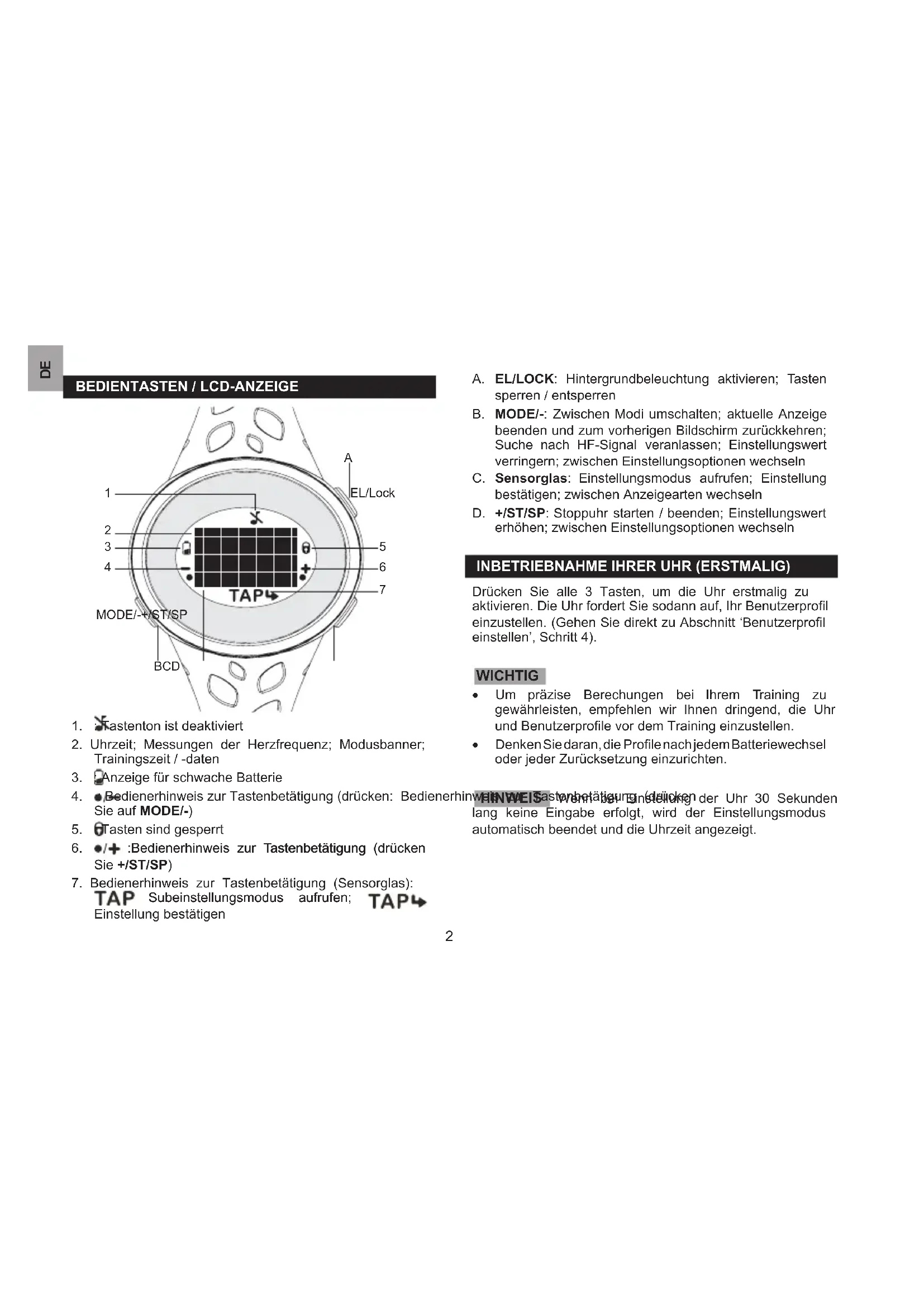Subeinstellungsmodus aufrufen;Subeinstellungsmodus aufrufen; Einstellung bestätigen A. EL/LOCK: Hintergrundbeleuchtung aktivieren; Tasten sperren / entsperren B. MODE/-: Zwischen Modi umschalten; aktuelle Anzeige beenden und zum vorherigen Bildschirm zurückkehren; Suche nach HF-Signal veranlassen; Einstellungswert verringern; zwischen Einstellungsoptionen wechseln C. Sensorglas: Einstellungsmodus aufrufen; Einstellung bestätigen; zwischen Anzeigearten wechseln D. +/ST/SP: Stoppuhr starten / beenden; Einstellungswert erhöhen; zwischen Einstellungsoptionen wechseln INBETRIEBNAHME IHRER UHR (ERSTMALIG) Drücken Sie alle 3 Tasten, um die Uhr erstmalig zu aktivieren. Die Uhr fordert Sie sodann auf, Ihr Benutzerprol einzustellen. (Gehen Sie direkt zu Abschnitt ‘Benutzerprol einstellen’, Schritt 4). WICHTIG