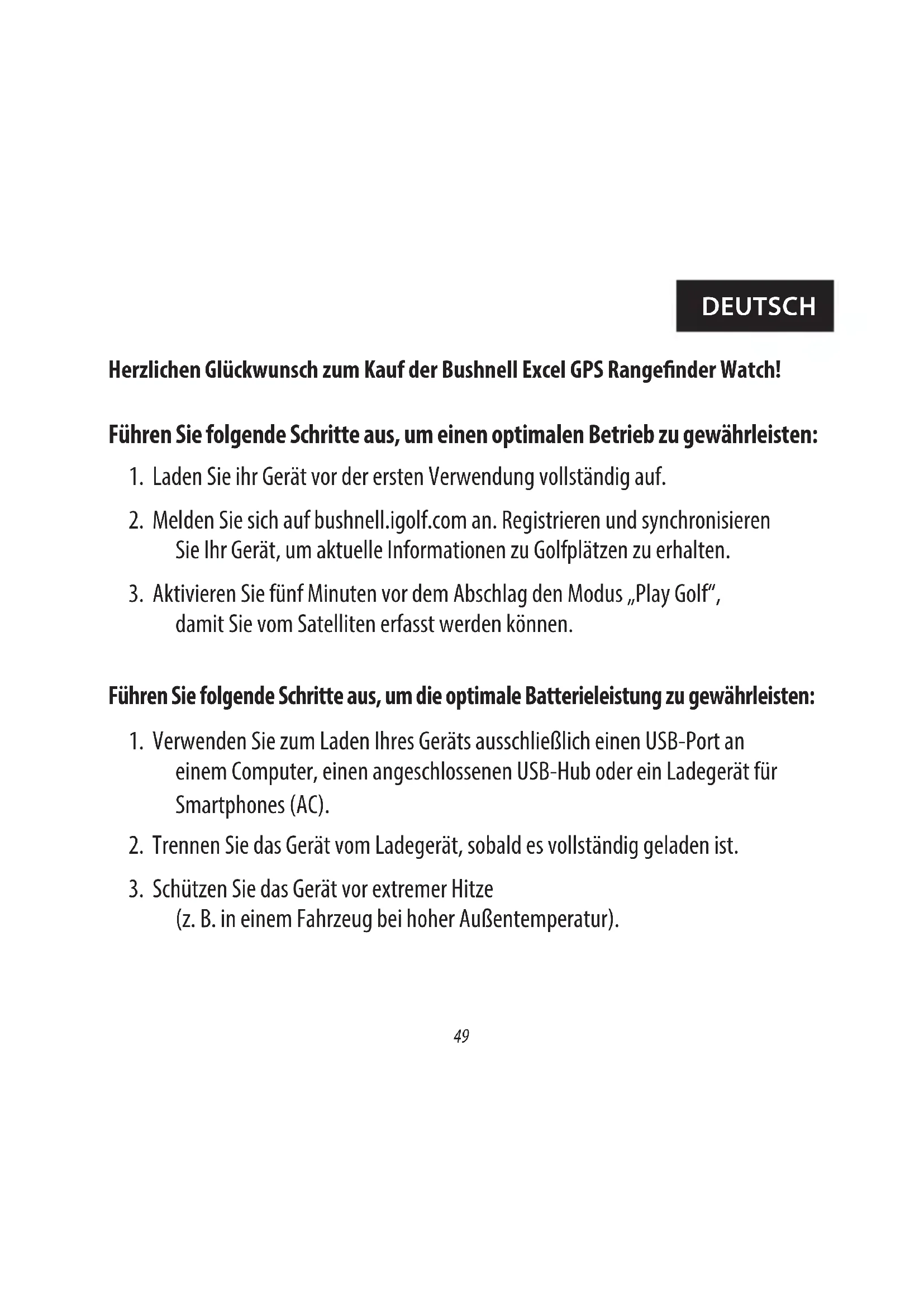 - Für einen optimalen Empfang sollten Sie sich im Freien mit Sicht auf den Himmel und in einiger Entfernung von größeren Gebäuden oder Bäumen be nden. Uhr auf der Ladestation Abb. 3 Kontaktpins Ladestation Abb. 2 Ladekontakte53 Lieferumfang 1 – Bushnell Excel GPS Range nder Watch 1 – Ladestation mit USB-Kabel 1 – Bürste zur Reinigung der Kontakte 1 – Betriebsanleitung Armband: Breite 22 mm, austauschbar mithilfe eines Torx-Schraubendrehers (T-6) Computeranforderungen USB-Port Betriebssystem: Windows (ab XP), Mac (ab OS 10.6) Aktualisierungen der Firmware/Software Besuchen Sie regelmäßig www.bushnellgolf.com oderwww.bushnellgolf.eu und suchen Sie nach aktuellenVersionen der Firmware und Software.