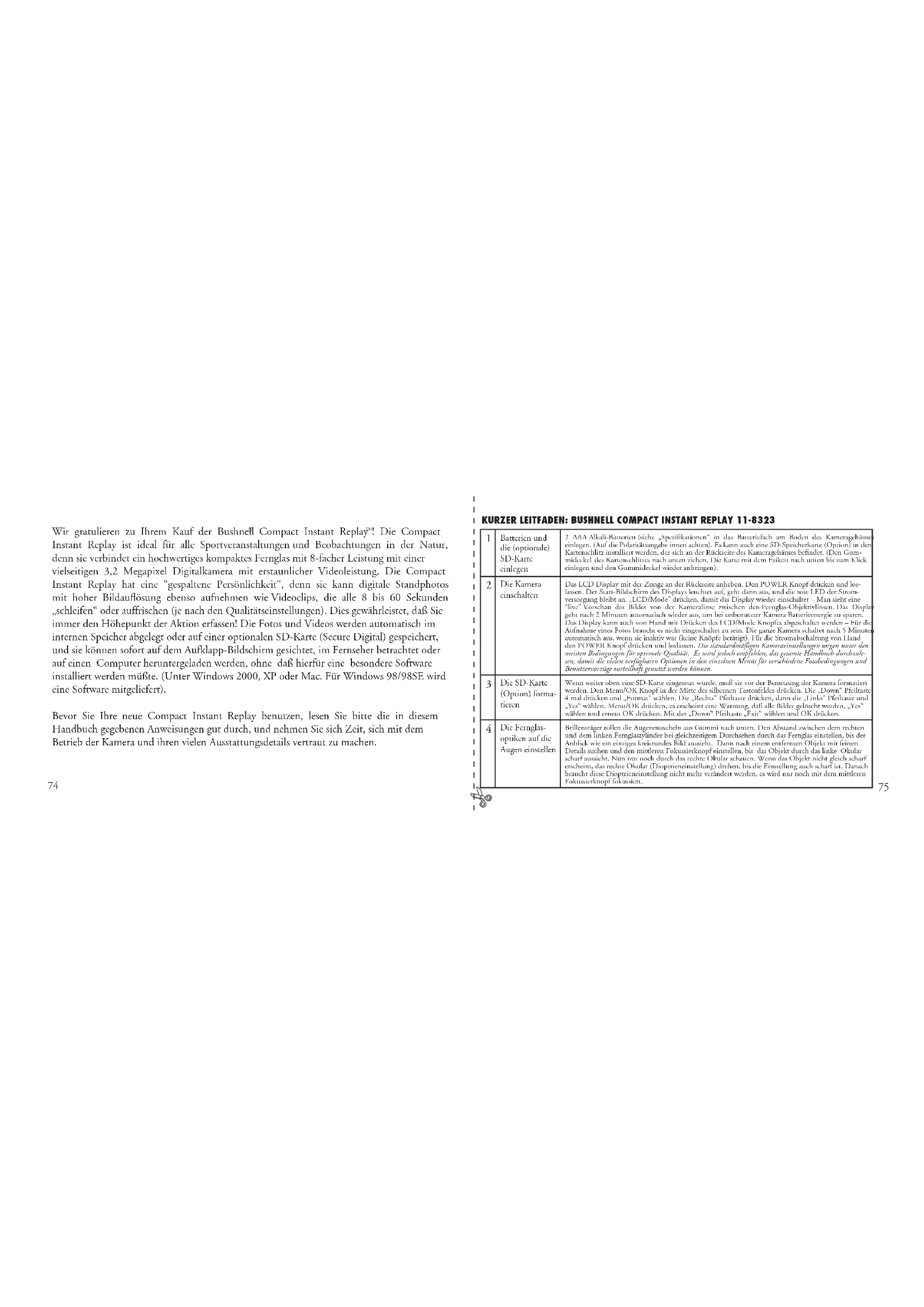 ! Die Compact Instant Replay ist ideal für alle Sportveranstaltungen und Beobachtungen in der Natur, denn sie verbindet ein hochwertiges kompaktes Fernglas mit 8-facher Leistung mit einer vielseitigen 3,2 Megapixel Digitalkamera mit erstaunlicher Videoleistung. Die Compact Instant Replay hat eine “gespaltene Persönlichkeit“, denn sie kann digitale Standphotos mit hoher Bildauflösung ebenso aufnehmen wie Videoclips, die alle 8 bis 60 Sekunden „schleifen“ oder auffrischen (je nach den Qualitätseinstellungen). Dies gewährleistet, daß Sie immer den Höhepunkt der Aktion erfassen! Die Fotos und Videos werden automatisch im internen Speicher abgelegt oder auf einer optionalen SD-Karte (Secure Digital) gespeichert, und sie können sofort auf dem Aufklapp-Bildschirm gesichtet, im Fernseher betrachtet oder auf einen Computer heruntergeladen werden, ohne daß hierfür eine besondere Software installiert werden müßte. (Unter Windows 2000, XP oder Mac. Für Windows 98/98SE wird eine Software mitgeliefert). Bevor Sie Ihre neue Compact Instant Replay benutzen, lesen Sie bitte die in diesem Handbuch gegebenen Anweisungen gut durch, und nehmen Sie sich Zeit, sich mit dem Betrieb der Kamera und ihren vielen Ausstattungsdetails vertraut zu machen. KURZER LEITFADEN: BUSHNELL COMPACT INSTANT REPLAY 11-8323