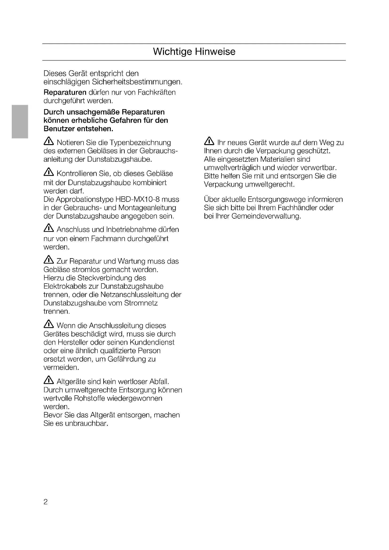 da2 Wichtige Hinweise Dieses Gerät entspricht den einschlägigen Sicherheitsbestimmungen. Reparaturen dürfen nur von Fachkräften durchgeführt werden. Durch unsachgemäße Reparaturen können erhebliche Gefahren für den Benutzer entstehen. 몇 Notieren Sie die Typenbezeichnung des externen Gebläses in der Gebrauchs- anleitung der Dunstabzugshaube. 몇 Kontrollieren Sie, ob dieses Gebläse mit der Dunstabzugshaube kombiniert werden darf. Die Approbationstype HBD-MX10-8 muss in der Gebrauchs- und Montageanleitung der Dunstabzugshaube angegeben sein. 몇 Anschluss und Inbetriebnahme dürfen nur von einem Fachmann durchgeführt werden. 몇 Zur Reparatur und Wartung muss das Gebläse stromlos gemacht werden. Hierzu die Steckverbindung des Elektrokabels zur Dunstabzugshaube trennen, oder die Netzanschlussleitung der Dunstabzugshaube vom Stromnetz trennen. 몇 Wenn die Anschlussleitung dieses Gerätes beschädigt wird, muss sie durch den Hersteller oder seinen Kundendienst oder eine ähnlich qualifizierte Person ersetzt werden, um Gefährdung zu vermeiden. 몇 Altgeräte sind kein wertloser Abfall. Durch umweltgerechte Entsorgung können wertvolle Rohstoffe wiedergewonnen werden. Bevor Sie das Altgerät entsorgen, machen Sie es unbrauchbar. Dieses Gerät entspricht den einschlägigen Sicherheitsbestimmungen. Reparaturen dürfen nur von Fachkräften durchgeführt werden. Durch unsachgemäße Reparaturen können erhebliche Gefahren für den Benutzer entstehen. 몇 Ihr neues Gerät wurde auf dem Weg zu Ihnen durch die Verpackung geschützt. Alle eingesetzten Materialien sind umweltverträglich und wieder verwertbar. Bitte helfen Sie mit und entsorgen Sie die Verpackung umweltgerecht. Über aktuelle Entsorgungswege informieren Sie sich bitte bei Ihrem Fachhändler oder bei Ihrer Gemeindeverwaltung.3 Vor der Montage