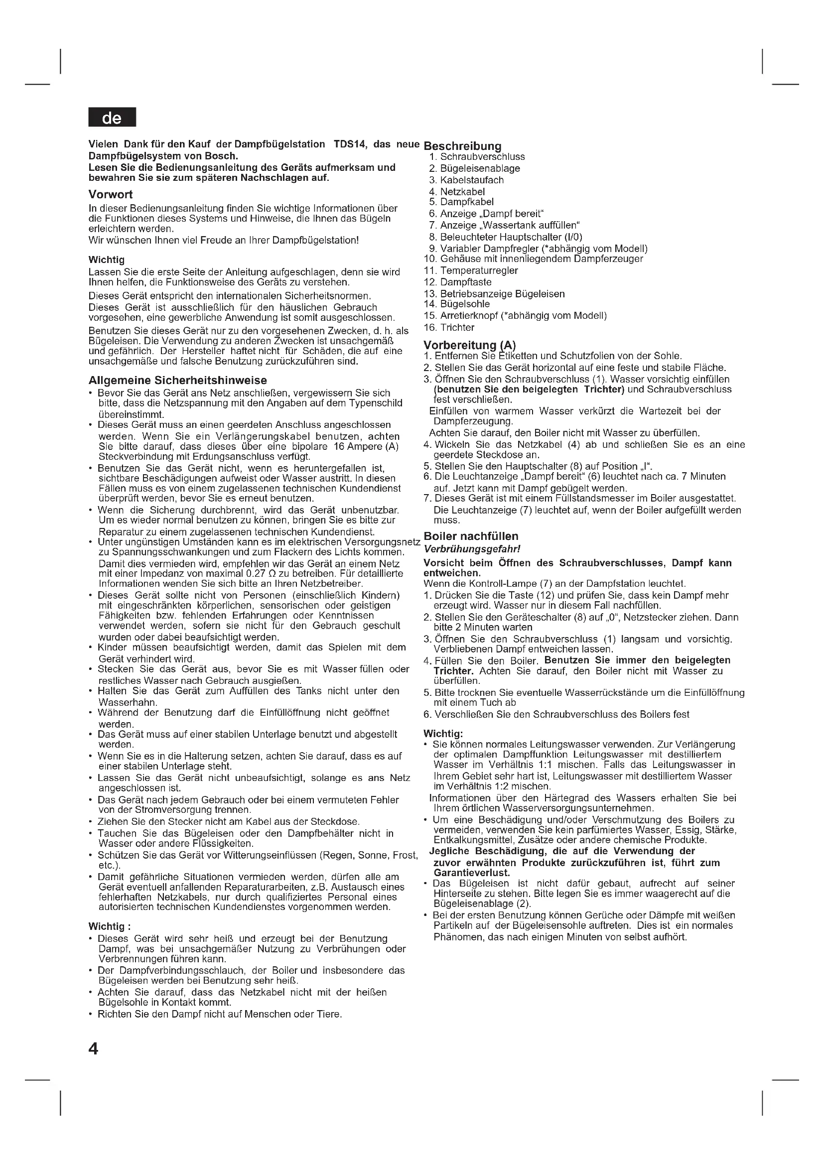 Vielen Dank für den Kauf der Dampfbügelstation TDS14, das neue Dampfbügelsystem von Bosch. Lesen Sie die Bedienungsanleitung des Geräts aufmerksam und bewahren Sie sie zum späteren Nachschlagen auf. Vorwort In dieser Bedienungsanleitung nden Sie wichtige Informationen über die Funktionen dieses Systems und Hinweise, die Ihnen das Bügeln erleichtern werden. Wir wünschen Ihnen viel Freude an Ihrer Dampfbügelstation! Wichtig Lassen Sie die erste Seite der Anleitung aufgeschlagen, denn sie wird Ihnen helfen, die Funktionsweise des Geräts zu verstehen. Dieses Gerät entspricht den internationalen Sicherheitsnormen. Dieses Gerät ist ausschließlich für den häuslichen Gebrauch vorgesehen, eine gewerbliche Anwendung ist somit ausgeschlossen. Benutzen Sie dieses Gerät nur zu den vorgesehenen Zwecken, d. h. als Bügeleisen. Die Verwendung zu anderen Zwecken ist unsachgemäß und gefährlich. Der Hersteller haftet nicht für Schäden, die auf eine unsachgemäße und falsche Benutzung zurückzuführen sind. Allgemeine Sicherheitshinweise