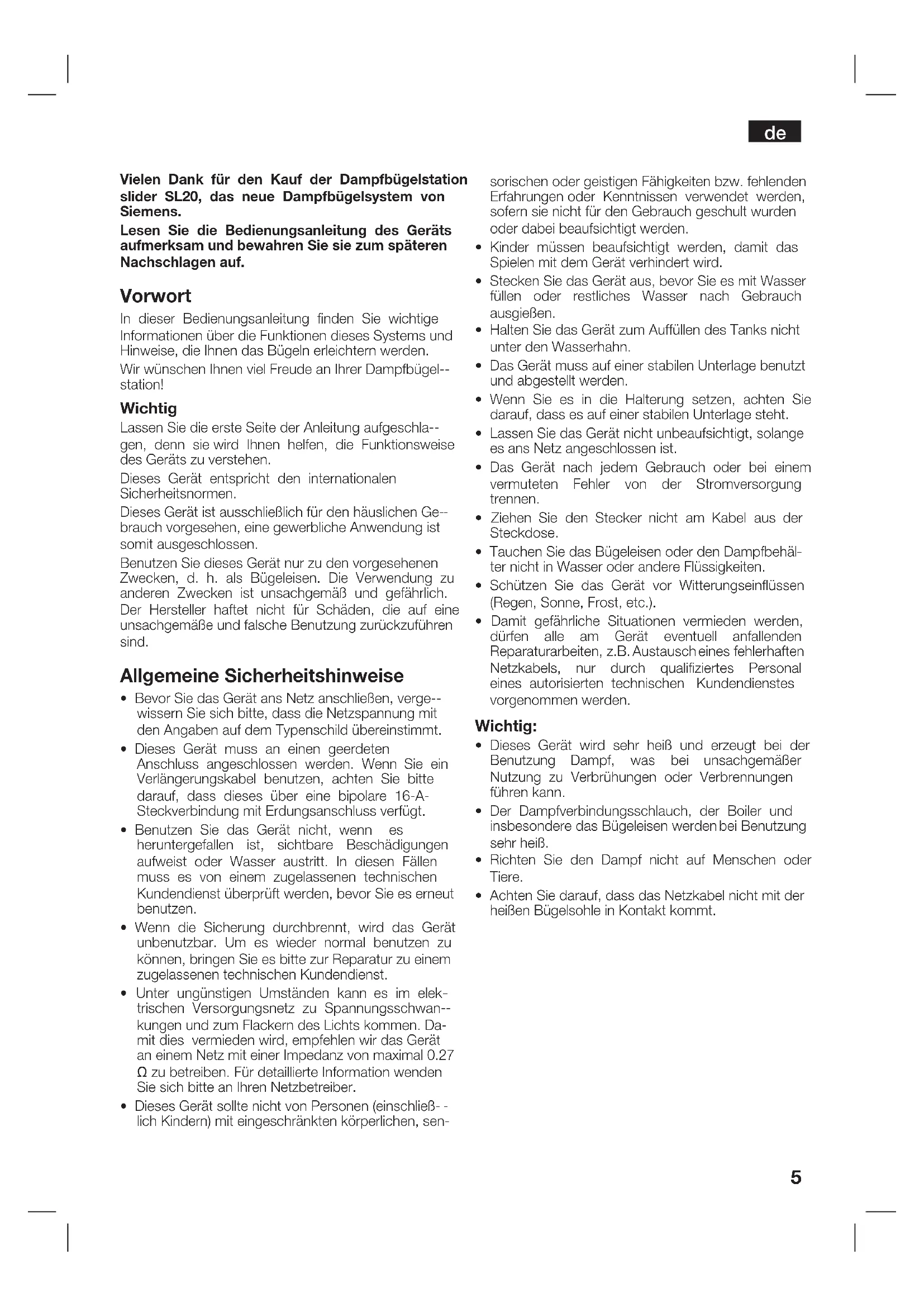 Vielen Dank für den Kauf der Dampfbügelstation slider SL20, das neue Dampfbügelsystem von Siemens. Lesen Sie die Bedienungsanleitung des Geräts aufmerksam und bewahren Sie sie zum späteren Nachschlagen auf. Vorwort In dieser Bedienungsanleitung finden Sie wichtige Informationen über die Funktionen dieses Systems und Hinweise, die Ihnen das Bügeln erleichtern werden. Wir wünschen Ihnen viel Freude an Ihrer Dampfbügel-- station! Wichtig Lassen Sie die erste Seite der Anleitung aufgeschla-- gen, denn sie wird Ihnen helfen, die Funktionsweise des Geräts zu verstehen. Dieses Gerät entspricht den internationalen Sicherheitsnormen. Dieses Gerät ist ausschließlich für den häuslichen Ge-