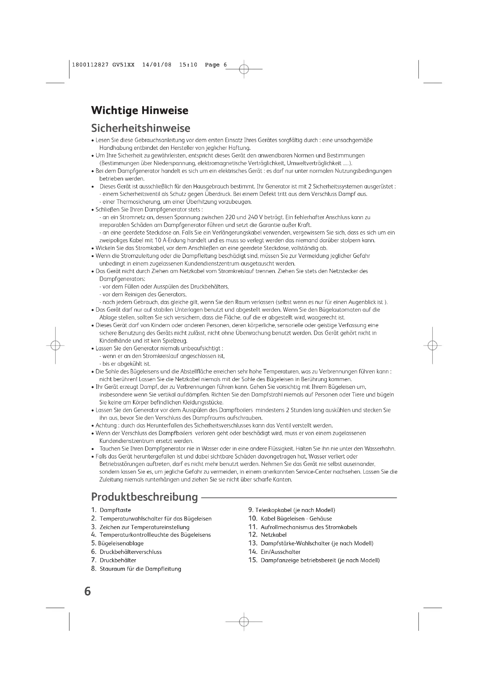 Problem Mögliche Ursachen Ratschläge Aus den Öffnungen in der Sohle fließtWasser.Der Druckbehälter ist zu voll.Ihr Thermostat ist verstellt : Die Temperaturist zu niedrig.Sie haben die Dampftaste betätigt, bevordas Bügeleisen heiß ist.Das Wasser kondensiert in der Leitung, daSie zum ersten Mal mit Dampf bügeln oderdie Dampffunktion seit einiger Zeit nichtbenutzt haben.Füllen Sie den Druckbehälter nicht bis zumRand.Wenden Sie sich an eine zugelasseneKundendienststelle.Überprüfen Sie die Einstellung desThermostaten und die Dampfstärke (jenach Modell).Betätigen Sie die Dampftaste fern von IhrerBügelwäsche bis Dampf austritt.Aus den Öffnungen in der Sohle fließteine weiße Flüssigkeit.In Ihrem Druckbehälter lagert sich Kalk ab,weil er nicht regelmäßig ausgespült wurde.Leeren Sie den Druckbehälter jeweils nach10 Anwendungen, und spülen Sie ihn aus(siehe § Spülen des Dampboilers). Bei sehrkalkhaltigem Wasser häufiger ausspülen.Aus den Öffnungen in der Sohle fließt einebräunliche Flüssigkeit, die Flecken auf derWäsche hinterlässt.Sie verwenden chemische Entkalkungsmitteloder Zusatzstoffe im Bügelwasser.Geben Sie niemals Zusatzstoffe in denDruckbehälter (siehe § Welches Wasserbenutzen).Die Sohle des Bügelautomaten istverschmutzt oder braun und kann Fleckenauf der Wäsche hinterlassen.Sie bügeln mit zu hoher Temperatur.Ihre Wäsche wurde nicht ausreichendgespült oder Sie haben ein neues, noch niegewaschenes Kleidungsstück gebügelt.Sie benutzen Stärke.Beachten Sie unsere Tipps zurTemperatureinstellung.Versichern Sie sich, dass die Wäscheausreichend gespült wurde, um eventuelleRückstände von Seife sowie die chemischenProdukte aus neuen Kleidungsstückenauszuwaschen. Sprühen Sie die Stärke stets auf dieRückseite des zu bügelnden Stoffes.Es kommt kein oder nur wenigDampf.Der Druckbehälter ist leer.Der Druckbehälter ist noch nicht bereit.Füllen Sie den Druckbehälter.Warten Sie nach der Inbetriebnahme 8Minuten lang oder bis die Dampfanzeigeaufleuchtet (je nach Modell).Dampf entweicht amDruckbehälterverschluss.Der Verschluss ist nicht richtigzugeschraubt.Die Dichtung am Verschluss ist defekt.Das Gerät ist defekt.Schrauben Sie den Verschluss fest.Wenden Sie sich an eine zugelasseneKundendienststelle.Verwenden Sie den Generator nicht mehr,und wenden Sie sich an eine zugelasseneKundendienststelle.Aus dem Unterteil des Geräts treten Dampfoder Wasser aus.Das Gerät ist defekt. Verwenden Sie den Generator nicht mehr,und wenden Sie sich an eine zugelasseneKundendienststelle. Denken Sie an den Schutz der Umwelt ! Ihr Gerät enthält wertvolle Rohstoffe, die wieder verwertet werden können. Geben Sie Ihr Gerät deshalb bitte bei einer Sammelstelle Ihrer Stadt oder Gemeinde ab. 1800112827 GV51XX 14/01/08 15:10 Page 910 Belangrijke instructies Veiligheidsvoorschriften