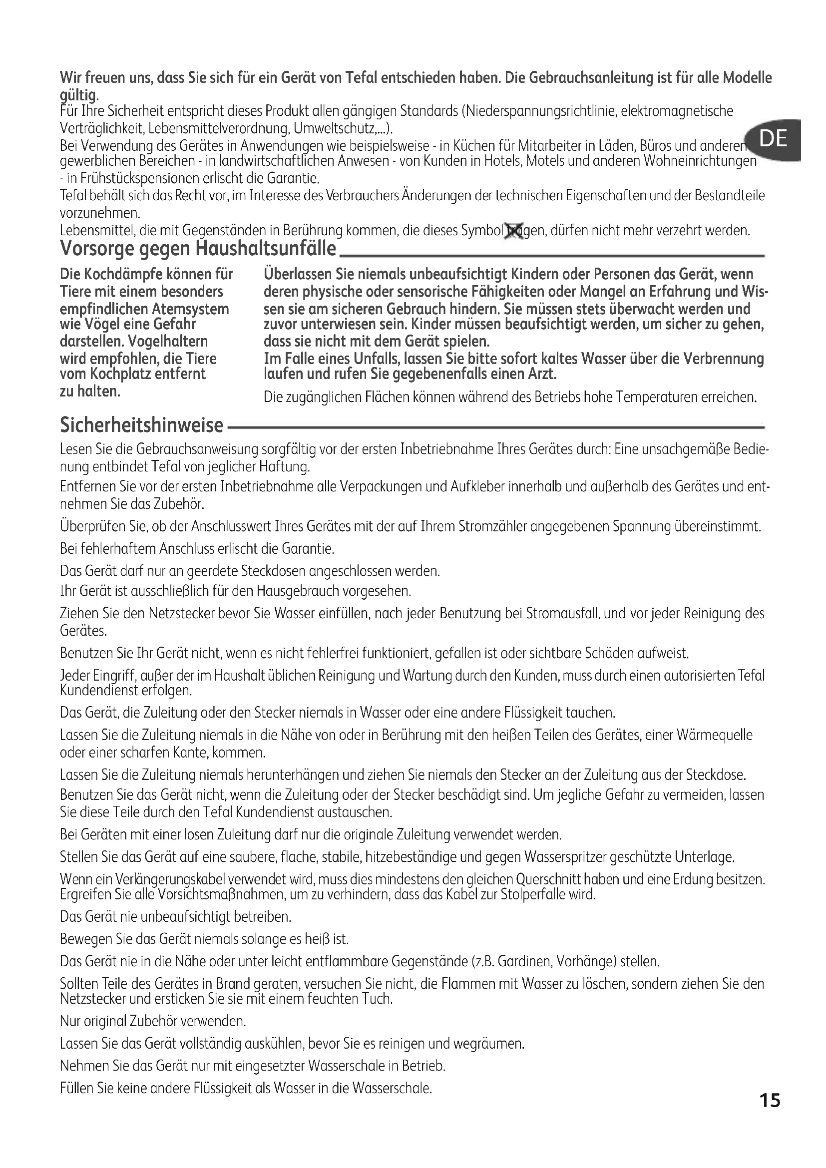 NLWir freuen uns, dass Sie sich für ein Gerät von Tefal entschieden haben. Die Gebrauchsanleitung ist für alle Modelle gültig. Für Ihre Sicherheit entspricht dieses Produkt allen gängigen Standards (Niederspannungsrichtlinie, elektromagnetische Verträglichkeit, Lebensmittelverordnung, Umweltschutz,...). Bei Verwendung des Gerätes in Anwendungen wie beispielsweise - in Küchen für Mitarbeiter in Läden, Büros und anderen gewerblichen Bereichen - in landwirtschaftlichen Anwesen - von Kunden in Hotels, Motels und anderen Wohneinrichtungen - in Frühstückspensionen erlischt die Garantie. Tefal behält sich das Recht vor, im Interesse des Verbrauchers Änderungen der technischen Eigen schaften und der Bestandteile vorzunehmen. Lebensmittel, die mit Gegenständen in Berührung kommen, die dieses Symbol tragen, dürfen nicht mehr verzehrt werden. Vorsorge gegen Haushaltsunfälle