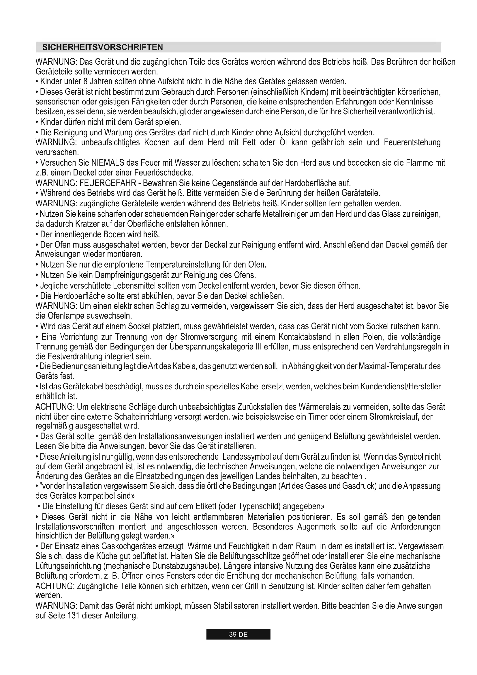 - Der Einsatz eines Gaskochgerätes erzeugt Wärme und Feuchtigkeit in dem Raum, in dem es installiert ist. Vergewissern Sie sich, dass die Küche gut belüftet ist. Halten Sie die Belüftungsschlitze geöffnet oder installieren Sie eine mechanische Lüftungseinrichtung (mechanische Dunstabzugshaube). Längere intensive Nutzung des Gerätes kann eine zusätzliche Belüftung erfordern, z. B. Öffnen eines Fensters oder die Erhöhung der mechanischen Belüftung, falls vorhanden. ACHTUNG: Zugängliche Teile können sich erhitzen, wenn der Grill in Benutzung ist. Kinder sollten daher fern gehalten werden. WARNUNG: Damit das Gerät nicht umkippt, müssen Stabilisatoren installiert werden. Bitte beachten Sıe die Anweisungen auf Seite 131 dieser Anleitung. SICHERHEITSVORSCHRIFTEN40 DE