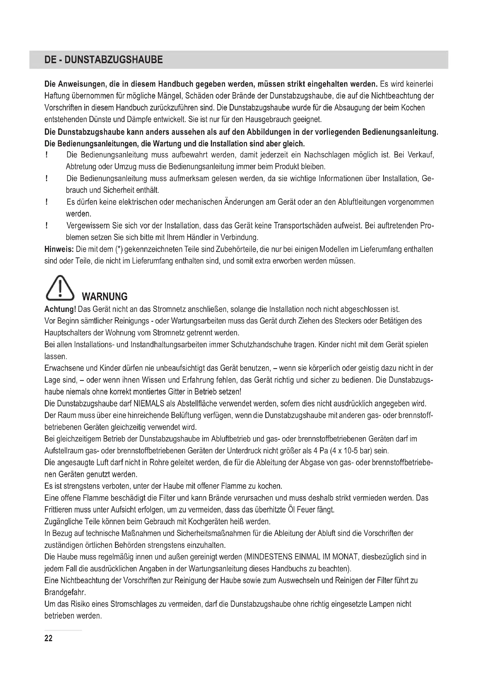 Die Anweisungen, die in diesem Handbuch gegeben werden, müssen strikt eingehalten werden. Es wird keinerlei Haftung übernommen für mögliche Mängel, Schäden oder Brände der Dunstabzugshaube, die auf die Nichtbeachtung der Vorschriften in diesem Handbuch zurückzuführen sind. Die Dunstabzugshaube wurde für die Absaugung der beim Kochen entstehenden Dünste und Dämpfe entwickelt. Sie ist nur für den Hausgebrauch geeignet. Die Dunstabzugshaube kann anders aussehen als auf den Abbildungen in der vorliegenden Bedienungsanleitung. Die Bedienungsanleitungen, die Wartung und die Installation sind aber gleich. ! Die Bedienungsanleitung muss aufbewahrt werden, damit jederzeit ein Nachschlagen möglich ist. Bei Verkauf, Abtretung oder Umzug muss die Bedienungsanleitung immer beim Produkt bleiben. ! Die Bedienungsanleitung muss aufmerksam gelesen werden, da sie wichtige Informationen über Installation, Ge- brauch und Sicherheit enthält. ! Es dürfen keine elektrischen oder mechanischen Änderungen am Gerät oder an den Abluftleitungen vorgenommen werden. ! Vergewissern Sie sich vor der Installation, dass das Gerät keine Transportschäden aufweist. Bei auftretenden Pro- blemen setzen Sie sich bitte mit Ihrem Händler in Verbindung. Hinweis: Die mit dem (*) gekennzeichneten Teile sind Zubehörteile, die nur bei einigen Modellen im Lieferumfang enthalten sind oder Teile, die nicht im Lieferumfang enthalten sind, und somit extra erworben werden müssen. WARNUNG Achtung! Das Gerät nicht an das Stromnetz anschließen, solange die Installation noch nicht abgeschlossen ist. Vor Beginn sämtlicher Reinigungs - oder Wartungsarbeiten muss das Gerät durch Ziehen des Steckers oder Betätigen des Hauptschalters der Wohnung vom Stromnetz getrennt werden. Bei allen Installations- und Instandhaltungsarbeiten immer Schutzhandschuhe tragen. Kinder nicht mit dem Gerät spielen lassen. Erwachsene und Kinder dürfen nie unbeaufsichtigt das Gerät benutzen, – wenn sie körperlich oder geistig dazu nicht in der Lage sind, – oder wenn ihnen Wissen und Erfahrung fehlen, das Gerät richtig und sicher zu bedienen. Die Dunstabzugs- haube niemals ohne korrekt montiertes Gitter in Betrieb setzen! Die Dunstabzugshaube darf NIEMALS als Abstelläche verwendet werden, sofern dies nicht ausdrücklich angegeben wird. Der Raum muss über eine hinreichende Belüftung verfügen, wenn die Dunstabzugshaube mit anderen gas- oder brennstoff- betriebenen Geräten gleichzeitig verwendet wird. Bei gleichzeitigem Betrieb der Dunstabzugshaube im Abluftbetrieb und gas- oder brennstoffbetriebenen Geräten darf im Aufstellraum gas- oder brennstoffbetriebenen Geräten der Unterdruck nicht größer als 4 Pa (4 x 10-5 bar) sein. Die angesaugte Luft darf nicht in Rohre geleitet werden, die für die Ableitung der Abgase von gas- oder brennstoffbetriebe- nen Geräten genutzt werden. Es ist strengstens verboten, unter der Haube mit offener Flamme zu kochen. Eine offene Flamme beschädigt die Filter und kann Brände verursachen und muss deshalb strikt vermieden werden. Das Frittieren muss unter Aufsicht erfolgen, um zu vermeiden, dass das überhitzte Öl Feuer fängt. Zugängliche Teile können beim Gebrauch mit Kochgeräten heiß werden. In Bezug auf technische Maßnahmen und Sicherheitsmaßnahmen für die Ableitung der Abluft sind die Vorschriften der zuständigen örtlichen Behörden strengstens einzuhalten. Die Haube muss regelmäßig innen und außen gereinigt werden (MINDESTENS EINMAL IM MONAT, diesbezüglich sind in jedem Fall die ausdrücklichen Angaben in der Wartungsanleitung dieses Handbuchs zu beachten). Eine Nichtbeachtung der Vorschriften zur Reinigung der Haube sowie zum Auswechseln und Reinigen der Filter führt zu Brandgefahr. Um das Risiko eines Stromschlages zu vermeiden, darf die Dunstabzugshaube ohne richtig eingesetzte Lampen nicht betrieben werden.23 Es wird keinerlei Haftung übernommen für Fehler, Schäden oder Brände des Gerätes, die durch Nichteinhaltung der in diesem Handbuch aufgeführten Anweisungen verschuldet wurden. In Übereinstimmung mit den Anforderungen der Europäischen Richtlinie 2012/19/EG über Elektro- und Elektronik-Altgeräte (WEEE) ist vorliegendes Gerät mit einer Kennzeichnung versehen. Sie leisten einen positiven Beitrag für den Schutz der Umwelt und die Gesundheit des Menschen, wenn Sie dieses Gerät einer gesonderten Abfallsammlung zuführen. Im unsortierten Siedlungsmüll könnte ein solches Gerät durch unsachgemäße Entsorgung negative Konsequenzen nach sich ziehen. Auf dem Produkt oder der beiliegenden Produktdokumentation ist folgendes Symbol einer durchgestrichenen Abfalltonne abgebildet. Es weist darauf hin, dass eine Entsorgung im normalen Haushaltsabfall nicht zulässig ist. Entsorgen Sie dieses Produkt im Recyclinghof mit einer getrennten Sammlung für Elektro-und Elektronikgeräte. Die Entsorgung muss gemäß den örtlichen Bestimmungen zur Abfallbeseitigung erfolgen. Bitte wenden Sie sich an die zuständigen Behörden Ihrer Gemeindeverwaltung, an den lokalen Recyclinghof für Haus- haltsmüll oder an den Händler, bei dem Sie dieses Gerät erworben haben, um weitere Informationen über Behandlung, Verwertung und Wiederverwendung dieses Produkts zu erhalten. Gerät entwickelt, getestet und hergestellt nach: