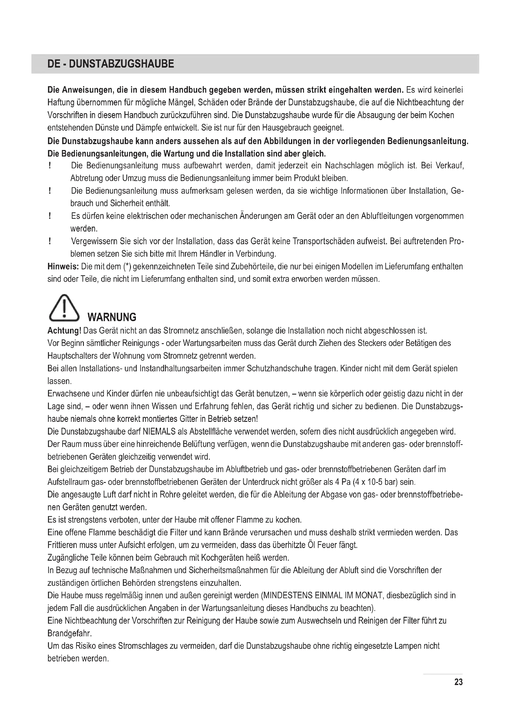 Die Anweisungen, die in diesem Handbuch gegeben werden, müssen strikt eingehalten werden. Es wird keinerlei Haftung übernommen für mögliche Mängel, Schäden oder Brände der Dunstabzugshaube, die auf die Nichtbeachtung der Vorschriften in diesem Handbuch zurückzuführen sind. Die Dunstabzugshaube wurde für die Absaugung der beim Kochen entstehenden Dünste und Dämpfe entwickelt. Sie ist nur für den Hausgebrauch geeignet. Die Dunstabzugshaube kann anders aussehen als auf den Abbildungen in der vorliegenden Bedienungsanleitung. Die Bedienungsanleitungen, die Wartung und die Installation sind aber gleich. ! Die Bedienungsanleitung muss aufbewahrt werden, damit jederzeit ein Nachschlagen möglich ist. Bei Verkauf, Abtretung oder Umzug muss die Bedienungsanleitung immer beim Produkt bleiben. ! Die Bedienungsanleitung muss aufmerksam gelesen werden, da sie wichtige Informationen über Installation, Ge- brauch und Sicherheit enthält. ! Es dürfen keine elektrischen oder mechanischen Änderungen am Gerät oder an den Abluftleitungen vorgenommen werden. ! Vergewissern Sie sich vor der Installation, dass das Gerät keine Transportschäden aufweist. Bei auftretenden Pro- blemen setzen Sie sich bitte mit Ihrem Händler in Verbindung. Hinweis: Die mit dem (*) gekennzeichneten Teile sind Zubehörteile, die nur bei einigen Modellen im Lieferumfang enthalten sind oder Teile, die nicht im Lieferumfang enthalten sind, und somit extra erworben werden müssen. WARNUNG Achtung! Das Gerät nicht an das Stromnetz anschließen, solange die Installation noch nicht abgeschlossen ist. Vor Beginn sämtlicher Reinigungs - oder Wartungsarbeiten muss das Gerät durch Ziehen des Steckers oder Betätigen des Hauptschalters der Wohnung vom Stromnetz getrennt werden. Bei allen Installations- und Instandhaltungsarbeiten immer Schutzhandschuhe tragen. Kinder nicht mit dem Gerät spielen lassen. Erwachsene und Kinder dürfen nie unbeaufsichtigt das Gerät benutzen, – wenn sie körperlich oder geistig dazu nicht in der Lage sind, – oder wenn ihnen Wissen und Erfahrung fehlen, das Gerät richtig und sicher zu bedienen. Die Dunstabzugs- haube niemals ohne korrekt montiertes Gitter in Betrieb setzen! Die Dunstabzugshaube darf NIEMALS als Abstelläche verwendet werden, sofern dies nicht ausdrücklich angegeben wird. Der Raum muss über eine hinreichende Belüftung verfügen, wenn die Dunstabzugshaube mit anderen gas- oder brennstoff- betriebenen Geräten gleichzeitig verwendet wird. Bei gleichzeitigem Betrieb der Dunstabzugshaube im Abluftbetrieb und gas- oder brennstoffbetriebenen Geräten darf im Aufstellraum gas- oder brennstoffbetriebenen Geräten der Unterdruck nicht größer als 4 Pa (4 x 10-5 bar) sein. Die angesaugte Luft darf nicht in Rohre geleitet werden, die für die Ableitung der Abgase von gas- oder brennstoffbetriebe- nen Geräten genutzt werden. Es ist strengstens verboten, unter der Haube mit offener Flamme zu kochen. Eine offene Flamme beschädigt die Filter und kann Brände verursachen und muss deshalb strikt vermieden werden. Das Frittieren muss unter Aufsicht erfolgen, um zu vermeiden, dass das überhitzte Öl Feuer fängt. Zugängliche Teile können beim Gebrauch mit Kochgeräten heiß werden. In Bezug auf technische Maßnahmen und Sicherheitsmaßnahmen für die Ableitung der Abluft sind die Vorschriften der zuständigen örtlichen Behörden strengstens einzuhalten. Die Haube muss regelmäßig innen und außen gereinigt werden (MINDESTENS EINMAL IM MONAT, diesbezüglich sind in jedem Fall die ausdrücklichen Angaben in der Wartungsanleitung dieses Handbuchs zu beachten). Eine Nichtbeachtung der Vorschriften zur Reinigung der Haube sowie zum Auswechseln und Reinigen der Filter führt zu Brandgefahr. Um das Risiko eines Stromschlages zu vermeiden, darf die Dunstabzugshaube ohne richtig eingesetzte Lampen nicht betrieben werden.24 Es wird keinerlei Haftung übernommen für Fehler, Schäden oder Brände des Gerätes, die durch Nichteinhaltung der in diesem Handbuch aufgeführten Anweisungen verschuldet wurden. In Übereinstimmung mit den Anforderungen der Europäischen Richtlinie 2002/96/EG über Elektro- und Elektronik-Altgeräte (WEEE) ist vorliegendes Gerät mit einer Kennzeichnung versehen. Sie leisten einen positiven Beitrag für den Schutz der Umwelt und die Gesundheit des Menschen, wenn Sie dieses Gerät einer gesonderten Abfallsammlung zuführen. Im unsortierten Siedlungsmüll könnte ein solches Gerät durch unsachgemäße Entsorgung negative Konsequenzen nach sich ziehen. Auf dem Produkt oder der beiliegenden Produktdokumentation ist folgendes Symbol einer durchgestrichenen Abfalltonne abgebildet. Es weist darauf hin, dass eine Entsorgung im normalen Haushaltsabfall nicht zulässig ist. Entsorgen Sie dieses Produkt im Recyclinghof mit einer getrennten Sammlung für Elektro-und Elektronikgeräte. Die Entsorgung muss gemäß den örtlichen Bestimmungen zur Abfallbeseitigung erfolgen. Bitte wenden Sie sich an die zuständigen Behörden Ihrer Gemeindeverwaltung, an den lokalen Recyclinghof für Haus- haltsmüll oder an den Händler, bei dem Sie dieses Gerät erworben haben, um weitere Informationen über Behandlung, Verwertung und Wiederverwendung dieses Produkts zu erhalten. Gerät entwickelt, getestet und hergestellt nach: