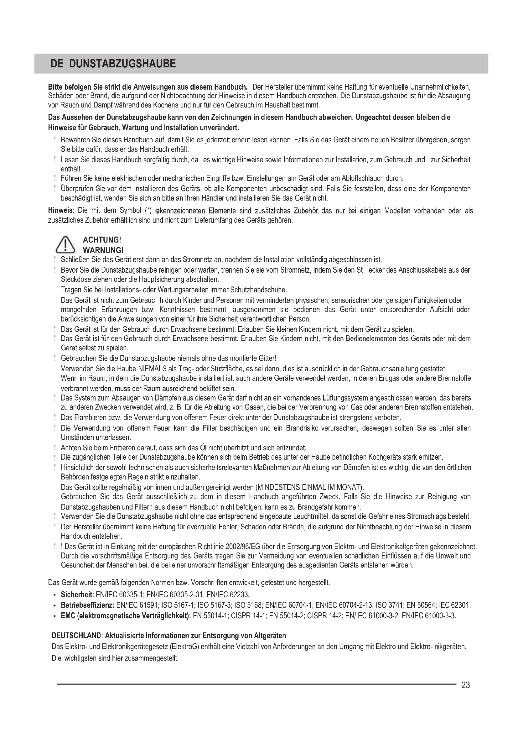 Bitte befolgen Sie strikt die Anweisungen aus diesem Handbuch. Der Hersteller übernimmt keine Haftung für eventuelle Unannehmlichkeiten, Schäden oder Brand, die aufgrund der Nichtbeachtung der Hinweise in diesem Handbuch entstehen. Die Dunstabzugshaube ist für die Absaugung von Rauch und Dampf während des Kochens und nur für den Gebrauch im Haushalt bestimmt. Das Aussehen der Dunstabzugshaube kann von den Zeichnungen in d iesem Handbuch abweichen. Ungeachtet dessen bleiben die Hinweise für Gebrauch, Wartung und Installation unverändert. Bewahren Sie dieses Handbuch auf, damit Sie es jederzeit erneut lesen können. Falls Sie das Gerät einem neuen Besitzer übergeben, sorgen Sie bitte dafür, dass er das Handbuch erhält. Lesen Sie dieses Handbuch sorgfältig durch, da es wichtige Hinweise sowie Informationen zur Installation, zum Gebrauch und zur Sicherheit enthält. Führen Sie keine elektrischen oder mechanischen Eingriffe bzw. Einstellungen am Gerät oder am Abluftschlauch durch. Überprüfen Sie vor dem Installieren des Geräts, ob alle Komponenten unbeschädigt sind. Falls Sie feststellen, dass eine der Komponenten beschädigt ist, wenden Sie sich an bitte an Ihren Händler und installieren Sie das Gerät nicht. Hinweis: Die mit dem Symbol (*) g ekennzeichneten Elemente sind zusätzliches Zubehör, das nur b ei einigen Modellen vorhanden oder als zusätzliches Zubehör erhältlich sind und nicht zum Lieferumfang des Geräts gehören. ACHTUNG! WARNUNG! Schließen Sie das Gerät erst dann an das Stromnetz an, nachdem die Installation vollständig abgeschlossen ist. Bevor Sie die Dunstabzugshaube reinigen oder warten, trennen Sie sie vom Stromnetz, indem Sie den St ecker des Anschlusskabels aus der Steckdose ziehen oder die Hauptsicherung abschalten. Tragen Sie bei Installations- oder Wartungsarbeiten immer Schutzhandschuhe. Das Gerät ist nicht zum Gebrauc h durch Kinder und Personen mit verminderten physischen, sensorischen oder geistigen Fähigkeiten oder mangelnden Erfahrungen bzw. Kenntnissen bestimmt, ausgenommen sie bedienen das Gerät unter entsprechender Aufs icht oder berücksichtigen die Anweisungen von einer für ihre Sicherheit verantwortlichen Person. Das Gerät ist für den Gebrauch durch Erwachsene bestimmt. Erlauben Sie kleinen Kindern nicht, mit dem Gerät zu spielen. Das Gerät ist für den Gebrauch durch Erwachsene bestimmt. Erlauben Sie Kindern nicht, mit den Bedienelementen des Geräts oder mit dem Gerät selbst zu spielen. Gebrauchen Sie die Dunstabzugshaube niemals ohne das montierte Gitter! Verwenden Sie die Haube NIEMALS als Trag- oder Stützfläche, es sei denn, dies ist ausdrücklich in der Gebrauchsanleitung gestattet. Wenn im Raum, in dem die Dunstabzugshaube installiert ist, auch andere Geräte verwendet werden, in denen Erdgas oder andere Brennstoffe verbrannt werden, muss der Raum ausreichend belüftet sein. Das System zum Absaugen von Dämpfen aus diesem Gerät darf nicht an ein vorhandenes Lüftungssystem angeschlossen werden, das bereits zu anderen Zwecken verwendet wird, z. B. für die Able itung von Gasen, die bei der Verbrennung von Gas oder anderen Brennstoffen entstehen. Das Flambieren bzw. die Verwendung von offenem Feuer direkt unter der Dunstabzugshaube ist strengstens verboten. Die Verwendung von offenem Feuer kann die Filter beschädigen und ein Brandrisiko verursachen, deswegen sollten Sie es unter allen Umständen unterlassen. Achten Sie beim Frittieren darauf, dass sich das Öl nicht überhitzt und sich entzündet. Die zugänglichen Teile der Dunstabzugshaube können sich beim Betrieb des unter der Haube befindlichen Kochgeräts stark erhitzen. Hinsichtlich der sowohl technischen als auch sicherheitsrelevanten Maßnahmen zur Ableitung von Dämpfen ist es wichtig, die von den örtlichen Behörden festgelegten Regeln strikt einzuhalten. Das Gerät sollte regelmäßig von innen und außen gereinigt werden (MINDESTENS EINMAL IM MONAT). Gebrauchen Sie das Gerät ausschließlich zu dem in diesem Handbuch angeführten Zweck. Falls Sie die Hinweise zur Reinigung von Dunstabzugshauben und Filter n aus diesem Handb uch nicht befolgen, kann es zu Brandgefahr kommen. Verwenden Sie die Dunstabzugshaube nicht ohne das entsprechend eingebaute Leuchtmittel, da sonst die Gefahr eines Stromschlags besteht. Der Hersteller übernimmt keine Haftung für eventuelle Fehler, Schäden oder Brände, die aufgrund der Nichtbeachtung der Hinweise in diesem Handbuch entstehen. ! Das Gerät ist in Einklang mit der europä ischen Richtlinie 2002/96/EG über die Entsorgung von Elektro- und Elektronikaltgeräten gekennzeichnet. Durch die vorschriftsmäßige Entsorgung des Geräts tragen Sie zur Vermeidung von eventuellen schädlichen Einflüssen auf die Umwelt und Gesundheit der Menschen bei, die bei einer unvorschriftsmäßigen Entsorgung des ausgedienten Geräts entstehen würden. Das Gerät wurde gemäß folgenden Normen bzw. Vorschri ften entwickelt, getestet und hergestellt. Sicherheit: EN/IEC 60335-1; EN/IEC 60335-2-31, EN/IEC 62233. Betriebseffizienz: EN/IEC 61591; ISO 5167-1; ISO 5167-3; ISO 5168; EN/IEC 60704-1; EN/IEC 60704-2-13; ISO 3741; EN 50564; IEC 62301. EMC (elektromagnetische Verträglichkeit): EN 55014-1; CISPR 14-1; EN 55014-2; CISPR 14-2; EN/IEC 61000-3-2; EN/IEC 61000-3-3.