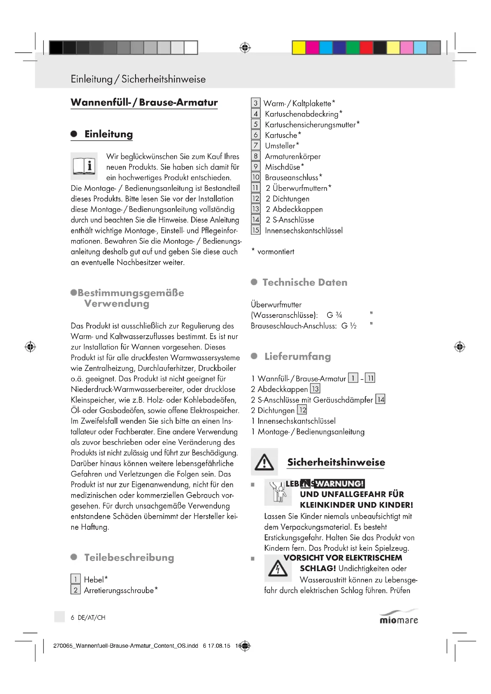 270065_Wannenfuell-Brause-Armatur_Cover_OS.indd 4 17.08.15 16:12270065_Wannenfuell-Brause-Armatur_Cover_OS.indd 5 17.08.15 16:125 DE/AT/CH Inhaltsverzeichnis Einleitung Bestimmungsgemäße Verwendung ....................................................................................................Seite 6 Teilebeschreibung ...............................................................................................................................Seite 6 Technische Daten ................................................................................................................................Seite 6 Lieferumfang ........................................................................................................................................ Seite 6 Sicherheitshinweise ................................................................................................................Seite 6 Montage Armatur anschließen ........................................................................................................................... Seite 7 Zubehör (Brauseschlauch und Duschkopf) anschließen ...................................................................Seite 7 Bedienung Inbetriebnahme ...................................................................................................................................Seite 8 Wartung und Reinigung Armatur pflegen und reinigen ............................................................................................................Seite 8 Kartusche austauschen .......................................................................................................................Seite 8 Entsorgung .....................................................................................................................................Seite 9 Informationen Trinkbarkeit von Leitungswasser ......................................................................................................... Seite 9 Garantie und Service ............................................................................................................Seite 9 270065_Wannenfuell-Brause-Armatur_Content_OS.indd 5 17.08.15 16:126 DE/AT/CH Wannenfüll- / Brause-Armatur Einleitung Wir beglückwünschen Sie zum Kauf Ihres neuen Produkts. Sie haben sich damit für ein hochwertiges Produkt entschieden. Die Montage- / Bedienungsanleitung ist Bestandteil dieses Produkts. Bitte lesen Sie vor der Installation diese Montage- / Bedienungsanleitung vollständig durch und beachten Sie die Hinweise. Diese Anleitung enthält wichtige Montage-, Einstell- und Pflegeinfor- mationen. Bewahren Sie die Montage- / Bedienungs- anleitung deshalb gut auf und geben Sie diese auch an eventuelle Nachbesitzer weiter. Bestimmungsgemäße Verwendung Das Produkt ist ausschließlich zur Regulierung des Warm- und Kaltwasserzuflusses bestimmt. Es ist nur zur Installation für Wannen vorgesehen. Dieses Produkt ist für alle druckfesten Warmwassersysteme wie Zentralheizung, Durchlauferhitzer, Druckboiler o.ä. geeignet. Das Produkt ist nicht geeignet für Niederdruck-Warmwasserbereiter, oder drucklose Kleinspeicher, wie z.B. Holz- oder Kohlebadeöfen, Öl- oder Gasbadeöfen, sowie offene Elektrospeicher. Im Zweifelsfall wenden Sie sich bitte an einen Ins- tallateur oder Fachberater. Eine andere Verwendung als zuvor beschrieben oder eine Veränderung des Produkts ist nicht zulässig und führt zur Beschädigung. Darüber hinaus können weitere lebensgefährliche Gefahren und Verletzungen die Folgen sein. Das Produkt ist nur zur Eigenanwendung, nicht für den medizinischen oder kommerziellen Gebrauch vor- gesehen. Für durch unsachgemäße Verwendung entstandene Schäden übernimmt der Hersteller kei- ne Haftung. Teilebeschreibung