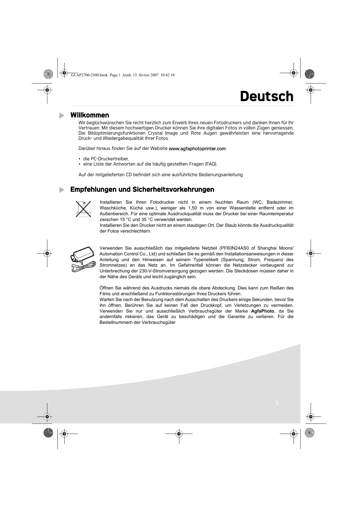 Ne pas installer votre imprimante photo ni dans une pièce humide (salle d'eau, salle de bain, buanderie, cuisine, etc..) à moins de 1,50 m d'un point d'eau ni en extérieur. Votre imprimante doit être utilisée à une température ambiante comprise entre 15 °C et 35 °C pour un rendu d’impression optimal. Ne pas installer votre imprimante dans un endroit poussiéreux, ces poussières pourraient dégrader la qualité d’impression de vos photos. Utilisez exclusivement le bloc secteur fourni (PF60N24AS0 of Shanghai Moons' Automation Control Co., Ltd), raccordez celui-ci sur le secteur conformément aux instructions d'installation de ce livret et aux indications portées sur l'étiquette d'identification apposée sur celui-ci (tension, courant, fréquence du réseau électrique). Par précaution, en cas de danger, les adaptateurs secteur servent de dispositif de sectionnement de l'alimentation 230 V. Ils doivent être situés à proximité de l'appareil et être aisément accessibles. Ne jamais ouvrir le capot supérieur en cours d'impression, vous risquez la rupture du film et par la suite un dysfonctionnement de votre imprimantAprès l’utilisation de l’imprimante, attendez quelques instants après la mise hors tension de l’imprimante avant de l’ouvrir. Pour éviter toute blessure, ne touchez en aucun cas la tête d’impression. Utilisez seulement les consommables de marque AgfaPhoto et exclusivement ceux-ci sinon vous risquez d'endommager l'appareil et de perdre la garantie. La poubelle barrée apposée sur le produit ou ses accessoires signifie qu'ils appartiennent à la famille des équipements électriques et électroniques. A ce titre, la réglementation européenne vous demande de procéder à sa collecte sélective : - dans les points de distribution en cas d'achat d'un équipement équivalent,