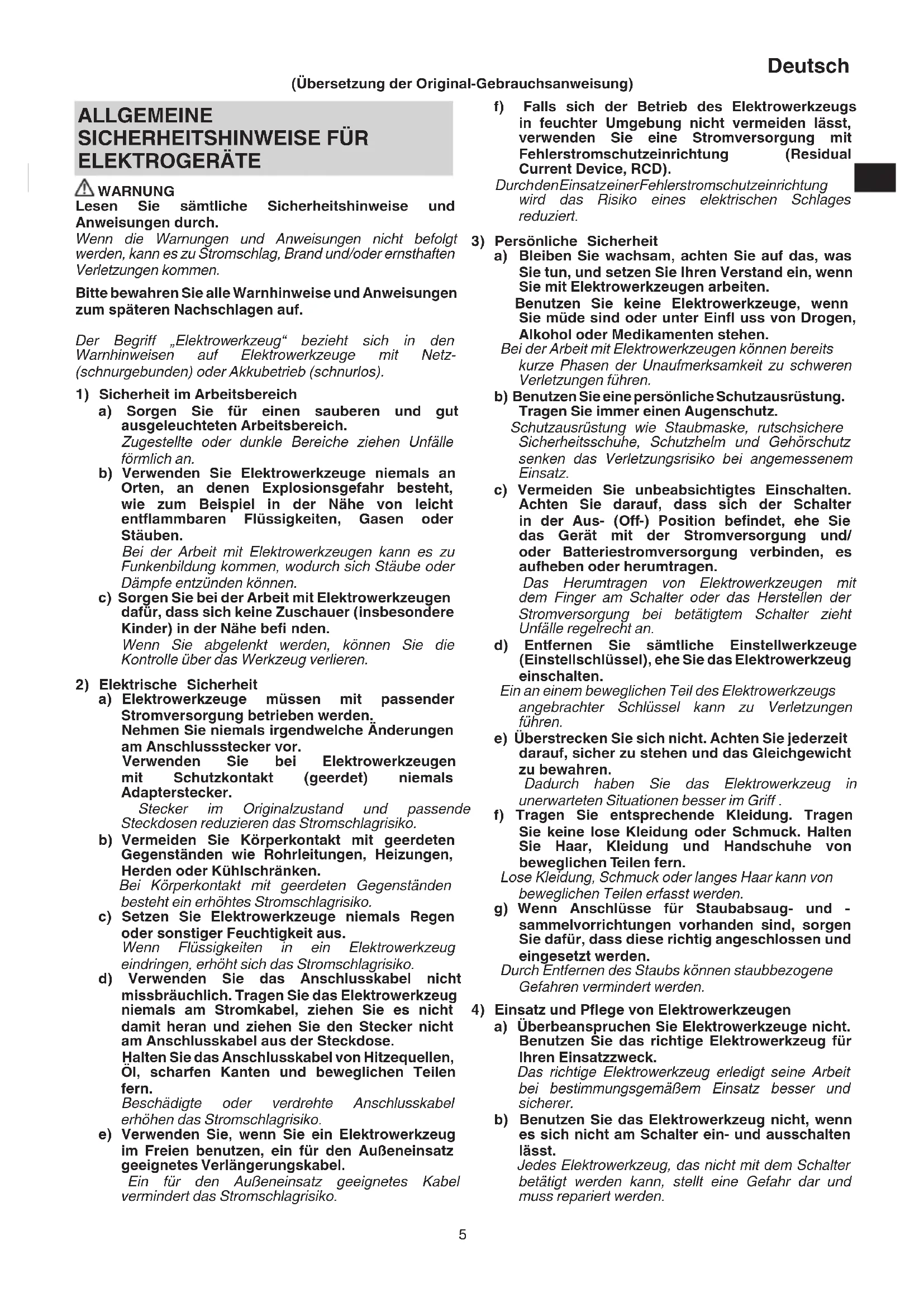 a) Überbeanspruchen Sie Elektrowerkzeuge nicht. Benutzen Sie das richtige Elektrowerkzeug für Ihren Einsatzzweck. Das richtige Elektrowerkzeug erledigt seine Arbeit bei bestimmungsgemäßem Einsatz besser und sicherer. b) Benutzen Sie das Elektrowerkzeug nicht, wenn es sich nicht am Schalter ein- und ausschalten lässt. Jedes Elektrowerkzeug, das nicht mit dem Schalter betätigt werden kann, stellt eine Gefahr dar und muss repariert werden. ALLGEMEINE