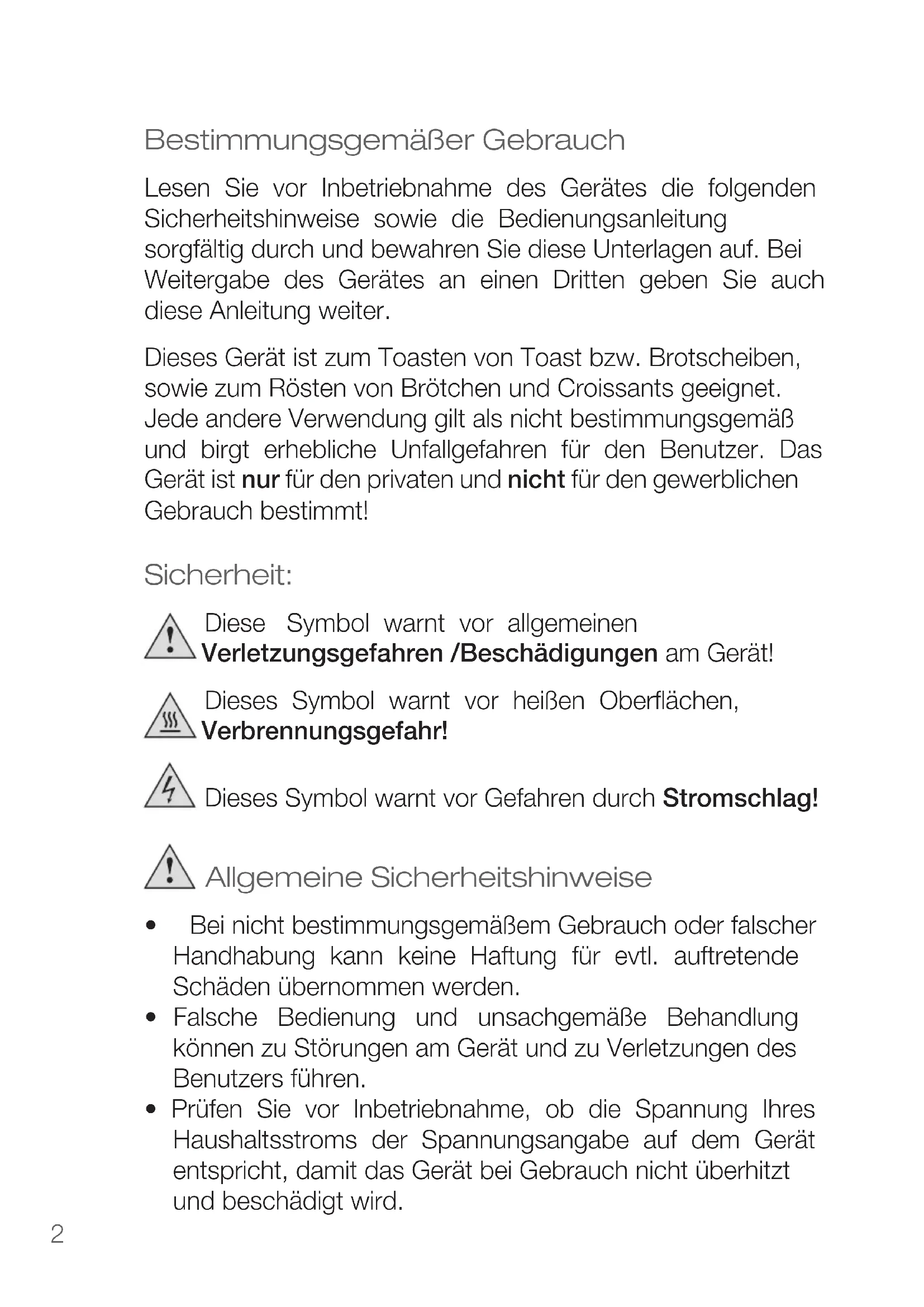 - Vorsicht! Achten Sie unbedingt darauf, dass Sie während und nach der Benutzung des Toasters, nicht mit aufgeheizten Teilen in Berührung kommen. Verbrennungsgefahr!