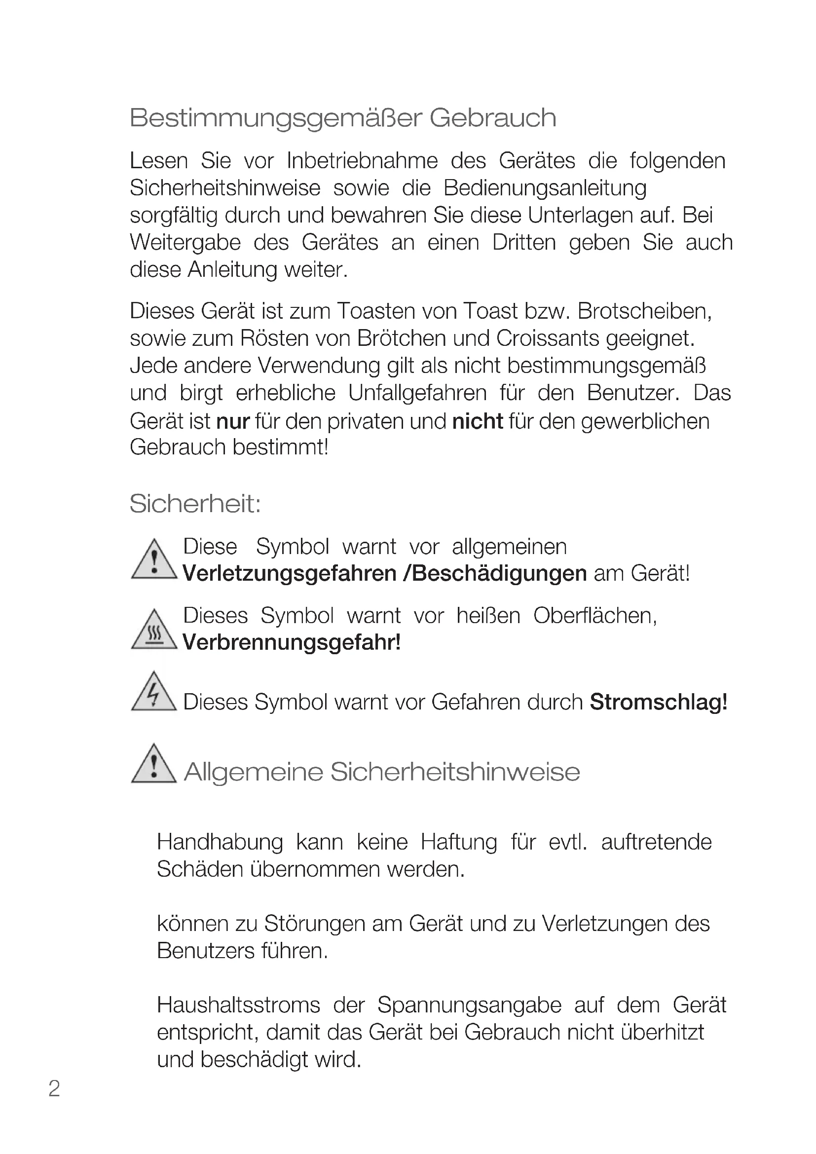 - Vorsicht! Achten Sie unbedingt darauf, dass Sie während und nach der Benutzung des Toasters, nicht mit aufgeheizten Teilen in Berührung kommen. Verbrennungsgefahr!