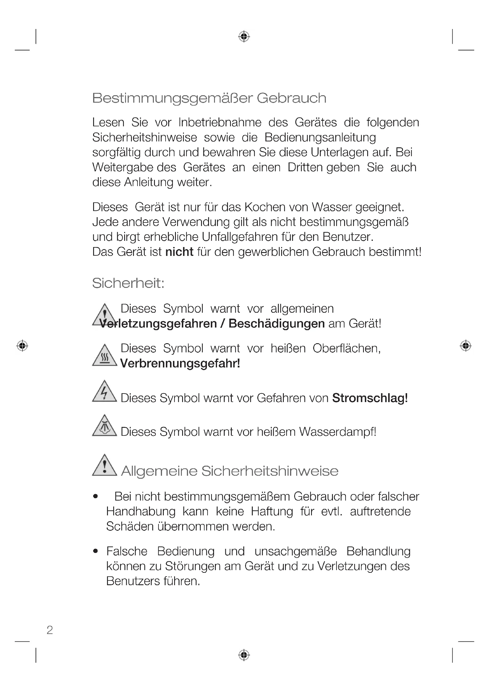Bestimmungsgemäßer Gebrauch Lesen Sie vor Inbetriebnahme des Gerätes die folgenden Sicherheitshinweise sowie die Bedienungsanleitung sorgfältig durch und bewahren Sie diese Unterlagen auf. Bei Weitergabe des Gerätes an einen Dritten geben Sie auch diese Anleitung weiter. Dieses Gerät ist nur für das Kochen von Wasser geeignet. Jede andere Verwendung gilt als nicht bestimmungsgemäß und birgt erhebliche Unfallgefahren für den Benutzer. Das Gerät ist nicht für den gewerblichen Gebrauch bestimmt! Sicherheit: Dieses Symbol warnt vor allgemeinen Verletzungsgefahren / Beschädigungen am Gerät! Dieses Symbol warnt vor heißen Oberflächen, Verbrennungsgefahr! Dieses Symbol warnt vor Gefahren von Stromschlag! Dieses Symbol warnt vor heißem Wasserdampf! Allgemeine Sicherheitshinweise