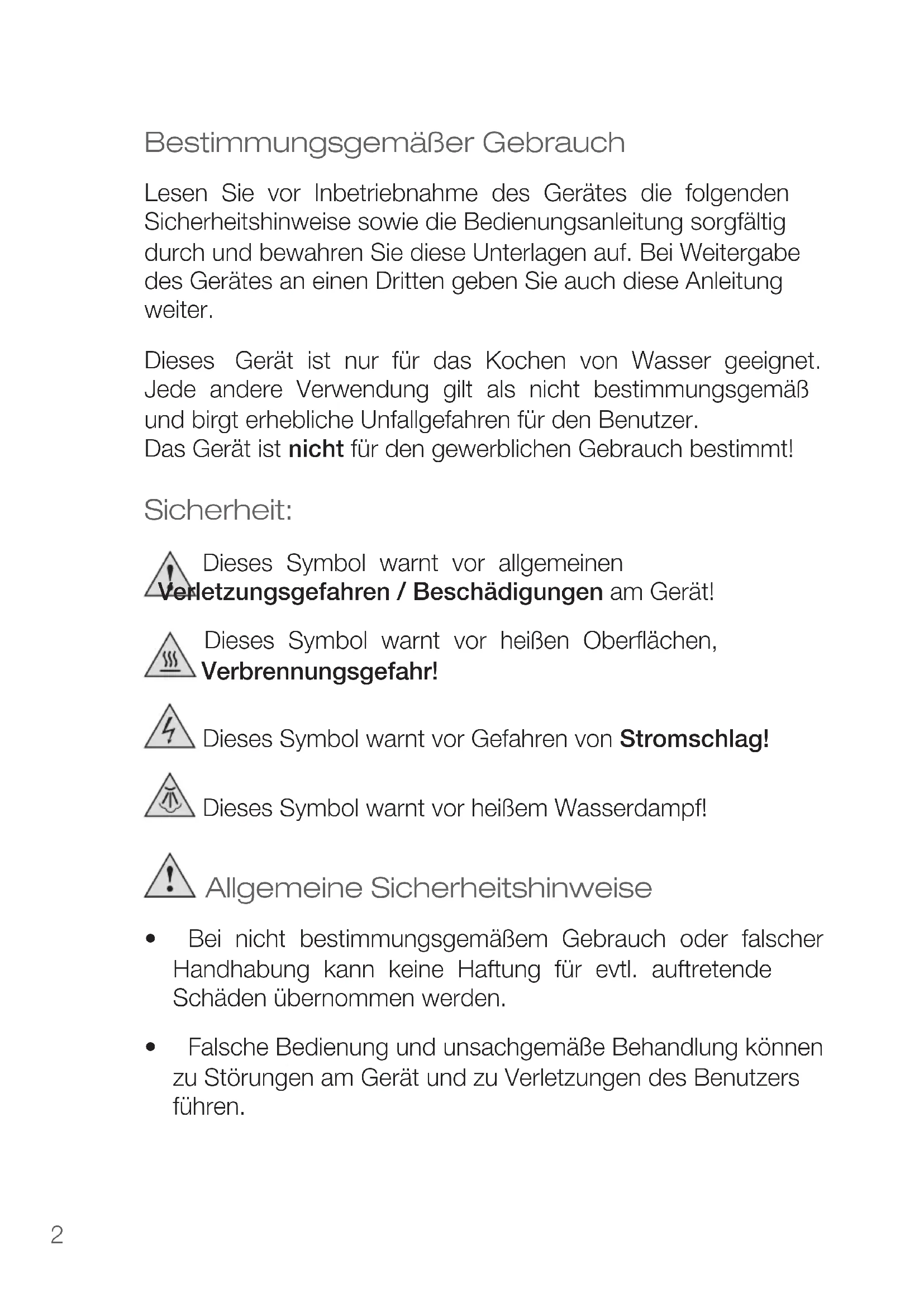 Bestimmungsgemäßer Gebrauch Lesen Sie vor Inbetriebnahme des Gerätes die folgenden Sicherheitshinweise sowie die Bedienungsanleitung sorgfältig durch und bewahren Sie diese Unterlagen auf. Bei Weitergabe des Gerätes an einen Dritten geben Sie auch diese Anleitung weiter. Dieses Gerät ist nur für das Kochen von Wasser geeignet. Jede andere Verwendung gilt als nicht bestimmungsgemäß und birgt erhebliche Unfallgefahren für den Benutzer. Das Gerät ist nicht für den gewerblichen Gebrauch bestimmt! Sicherheit: Dieses Symbol warnt vor allgemeinen Verletzungsgefahren / Beschädigungen am Gerät! Dieses Symbol warnt vor heißen Oberflächen, Verbrennungsgefahr! Dieses Symbol warnt vor Gefahren von Stromschlag! Dieses Symbol warnt vor heißem Wasserdampf! Allgemeine Sicherheitshinweise