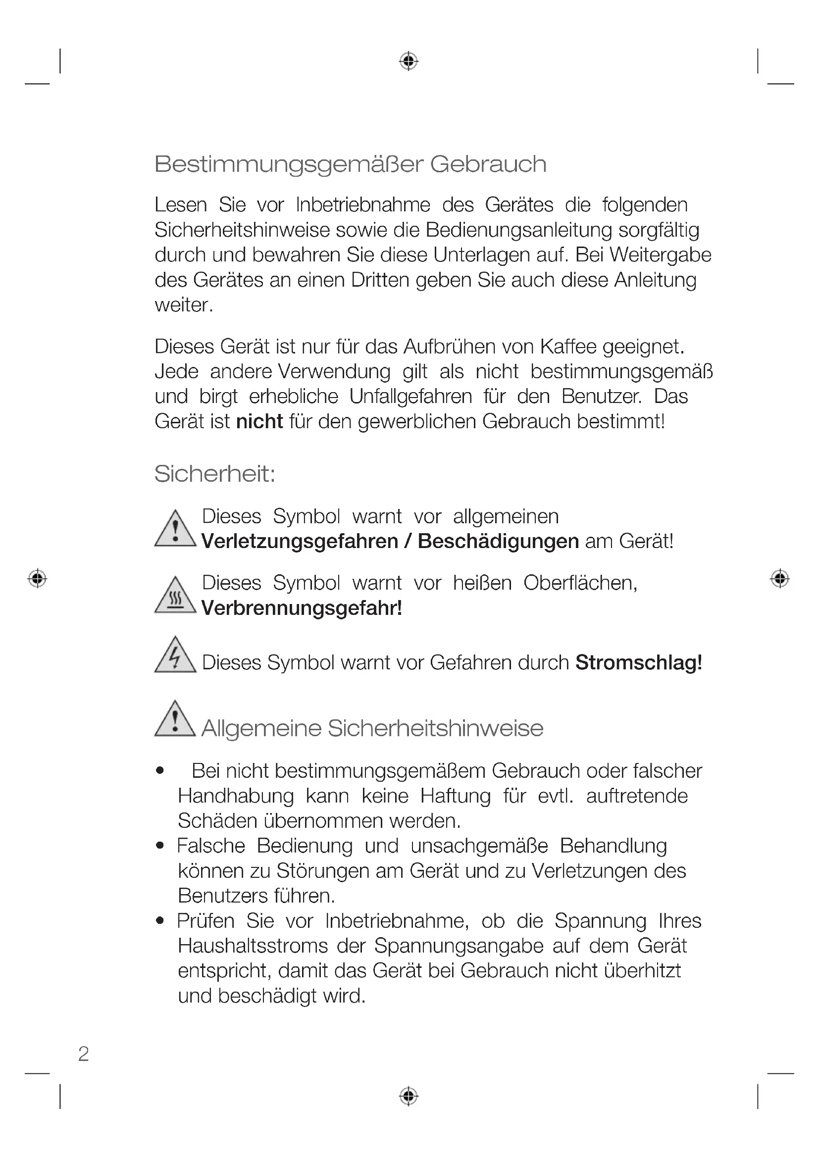 Bestimmungsgemäßer Gebrauch Lesen Sie vor Inbetriebnahme des Gerätes die folgenden Sicherheitshinweise sowie die Bedienungsanleitung sorgfältig durch und bewahren Sie diese Unterlagen auf. Bei Weitergabe des Gerätes an einen Dritten geben Sie auch diese Anleitung weiter. Dieses Gerät ist nur für das Aufbrühen von Kaffee geeignet. Jede andere Verwendung gilt als nicht bestimmungsgemäß und birgt erhebliche Unfallgefahren für den Benutzer. Das Gerät ist nicht für den gewerblichen Gebrauch bestimmt! Sicherheit: Dieses Symbol warnt vor allgemeinen Verletzungsgefahren / Beschädigungen am Gerät! Dieses Symbol warnt vor heißen Oberflächen, Verbrennungsgefahr! Dieses Symbol warnt vor Gefahren durch Stromschlag! Allgemeine Sicherheitshinweise