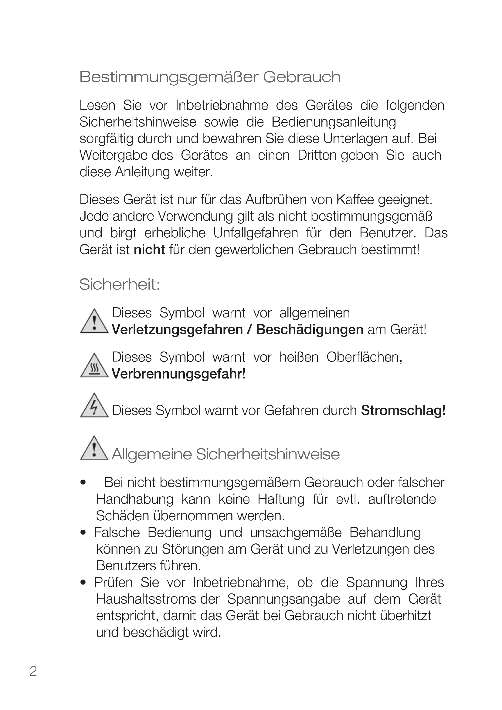 Bestimmungsgemäßer Gebrauch Lesen Sie vor Inbetriebnahme des Gerätes die folgenden Sicherheitshinweise sowie die Bedienungsanleitung sorgfältig durch und bewahren Sie diese Unterlagen auf. Bei Weitergabe des Gerätes an einen Dritten geben Sie auch diese Anleitung weiter. Dieses Gerät ist nur für das Aufbrühen von Kaffee geeignet. Jede andere Verwendung gilt als nicht bestimmungsgemäß und birgt erhebliche Unfallgefahren für den Benutzer. Das Gerät ist nicht für den gewerblichen Gebrauch bestimmt! Sicherheit: Dieses Symbol warnt vor allgemeinen Verletzungsgefahren / Beschädigungen am Gerät! Dieses Symbol warnt vor heißen Oberflächen, Verbrennungsgefahr! Dieses Symbol warnt vor Gefahren durch Stromschlag! Allgemeine Sicherheitshinweise