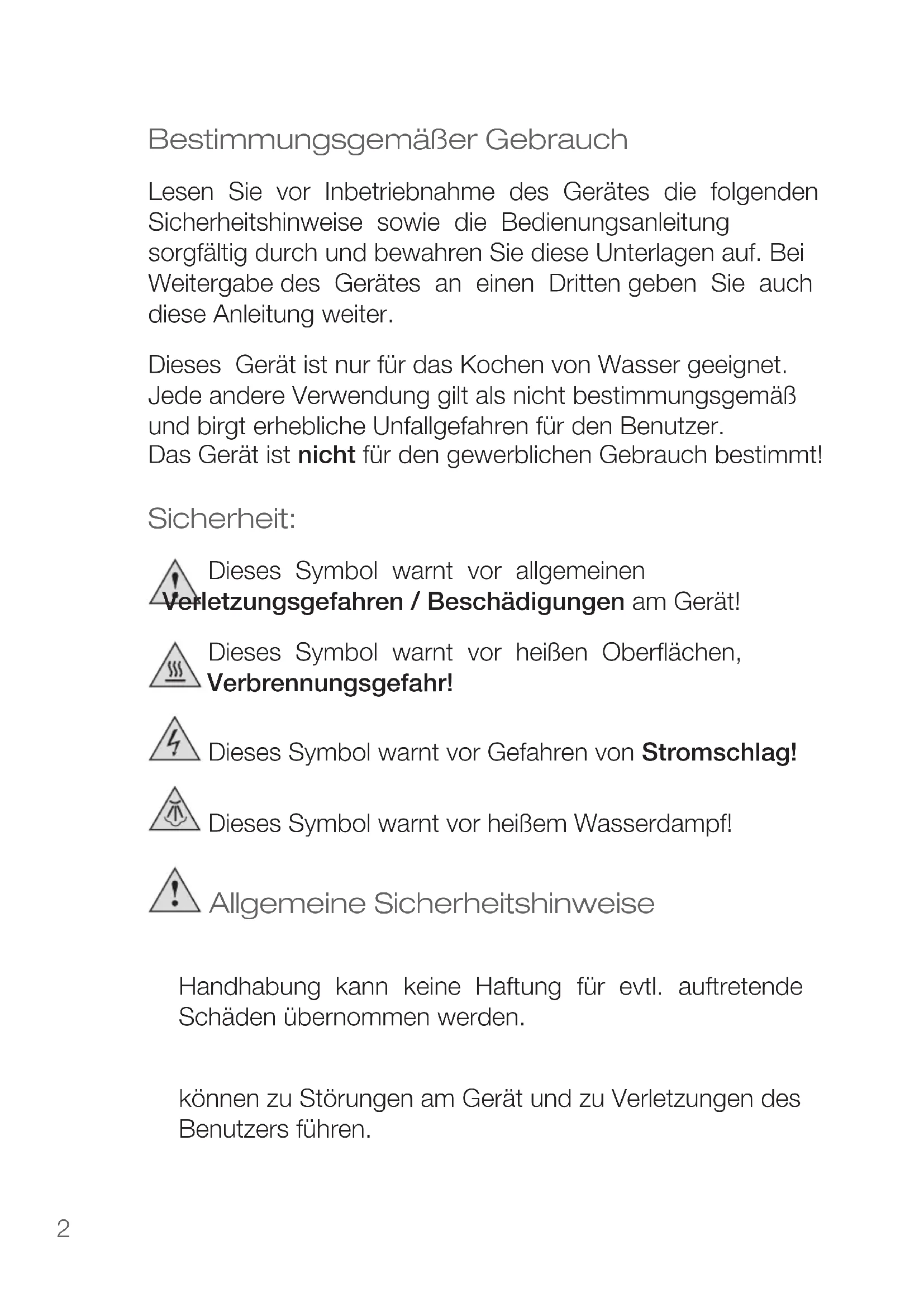 Bestimmungsgemäßer Gebrauch Lesen Sie vor Inbetriebnahme des Gerätes die folgenden Sicherheitshinweise sowie die Bedienungsanleitung sorgfältig durch und bewahren Sie diese Unterlagen auf. Bei Weitergabe des Gerätes an einen Dritten geben Sie auch diese Anleitung weiter. Dieses Gerät ist nur für das Kochen von Wasser geeignet. Jede andere Verwendung gilt als nicht bestimmungsgemäß und birgt erhebliche Unfallgefahren für den Benutzer. Das Gerät ist nicht für den gewerblichen Gebrauch bestimmt! Sicherheit: Dieses Symbol warnt vor allgemeinen Verletzungsgefahren / Beschädigungen am Gerät! Dieses Symbol warnt vor heißen Oberflächen, Verbrennungsgefahr! Dieses Symbol warnt vor Gefahren von Stromschlag! Dieses Symbol warnt vor heißem Wasserdampf! Allgemeine Sicherheitshinweise