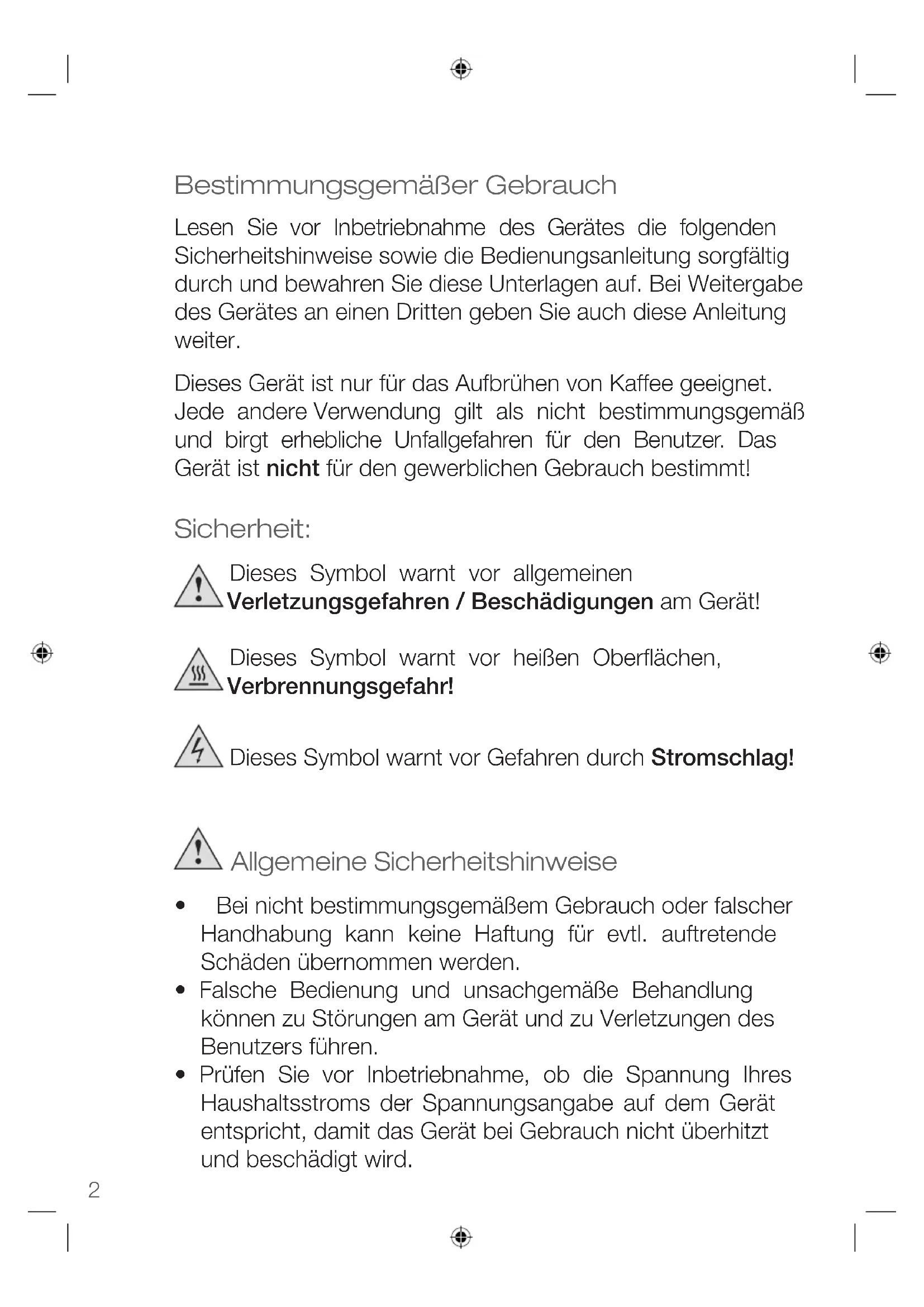 - beiEigenverschuldendesKunden Die gesetzilchen Gewährleistungen des kunden bleiben durch die Garantie unberührt. Für Geltendmachung eines Garantiefalles innerhalb der Garantiezeit ist durch den KundenderNachweisdesKaufeszuführen. DieGarantieistinnerhalbeinesZeitraumesvon2Jahrenab Kaufdatum gegenüber der KORONA electric GmbH, Sundern. Service Adresse: KORONA Service, Am Steinbach 9, 59872 Meschede- Enste Telefon Hotline: 02933 90284-80 Mail: service@korona-electric.de web: www.korona-electric.de geltend zu machen. Der Kunde hat im Garantiefall das Recht zur Reparatur der Ware bei unseren eigenen oder bei von uns autorisierten Werkstätten. Weitergehende Rechte werden demKunden(aufgrundderGarantie)nichteingeräumt.12 Intended Use Before use, please read these instructions carefully and keep them in a safe place for future reference. When passing on the appliance to a third party, make sure to include these instructions for use. This appliance is only intended for making coffee. Never attempttoheatanyotherliquidsinit.This appliance is only intended for private household use! Safety: Thissymbolidentieshazardswhichmaycauseinjuries! This symbol warns of hot surfaces. Risk of burns! This symbol identifies electric shock hazards! General Safety Instructions