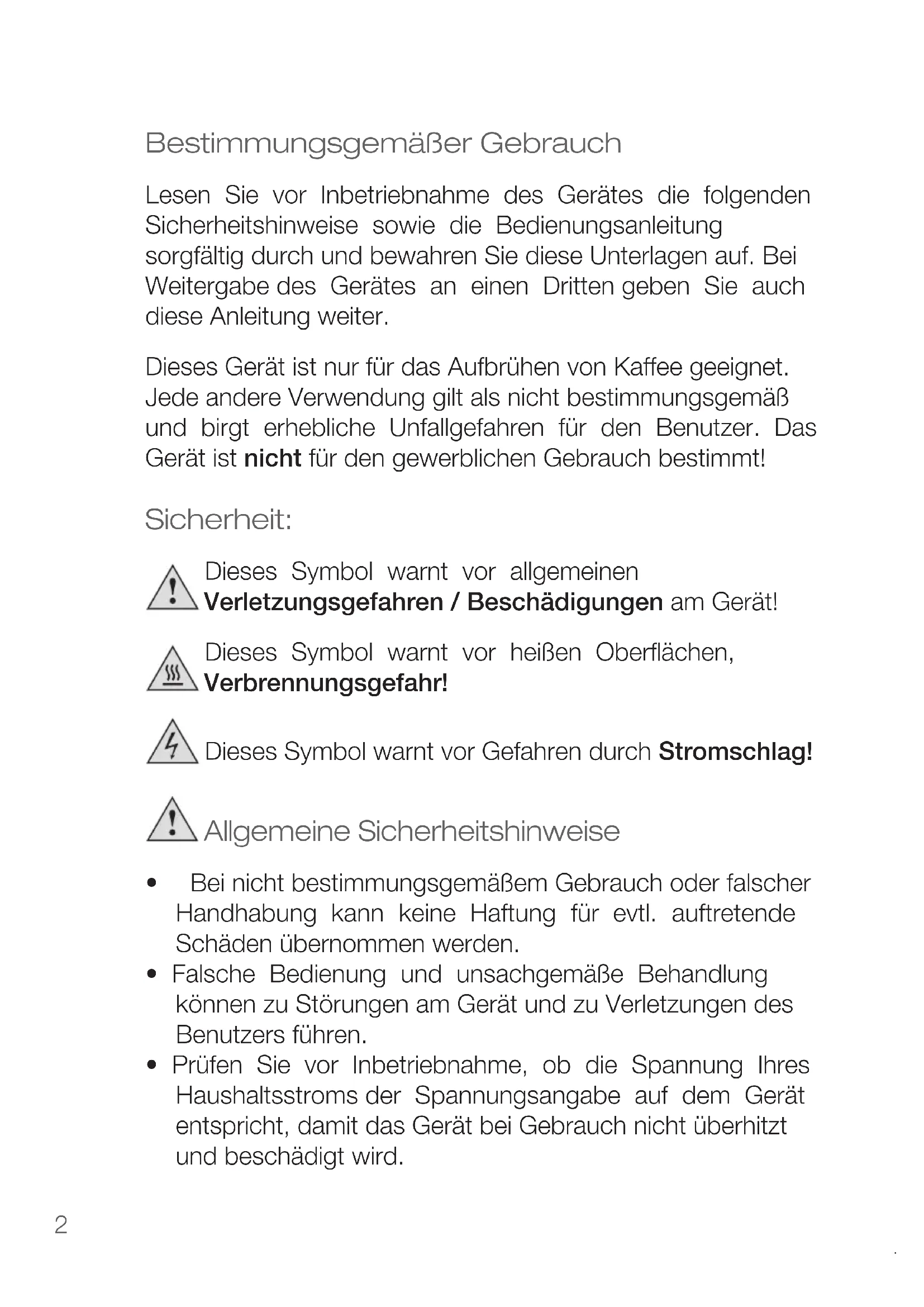 Bestimmungsgemäßer Gebrauch Lesen Sie vor Inbetriebnahme des Gerätes die folgenden Sicherheitshinweise sowie die Bedienungsanleitung sorgfältig durch und bewahren Sie diese Unterlagen auf. Bei Weitergabe des Gerätes an einen Dritten geben Sie auch diese Anleitung weiter. Dieses Gerät ist nur für das Aufbrühen von Kaffee geeignet. Jede andere Verwendung gilt als nicht bestimmungsgemäß und birgt erhebliche Unfallgefahren für den Benutzer. Das Gerät ist nicht für den gewerblichen Gebrauch bestimmt! Sicherheit: Dieses Symbol warnt vor allgemeinen Verletzungsgefahren / Beschädigungen am Gerät! Dieses Symbol warnt vor heißen Oberflächen, Verbrennungsgefahr! Dieses Symbol warnt vor Gefahren durch Stromschlag! Allgemeine Sicherheitshinweise