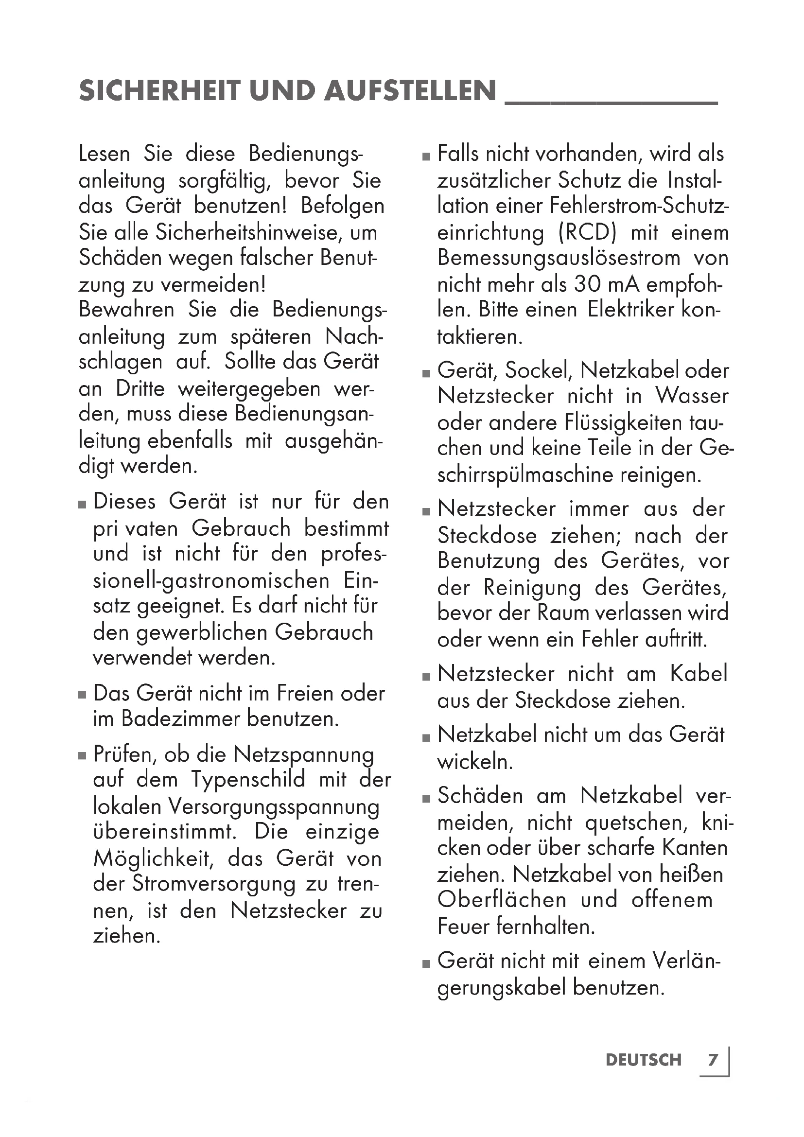 Dieses Gerät ist nur für den pri vaten Gebrauch bestimmt und ist nicht für den profes- sionell-gastronomischen Ein- satz geeignet. Es darf nicht für den gewerblichen Gebrauch verwendet werden.