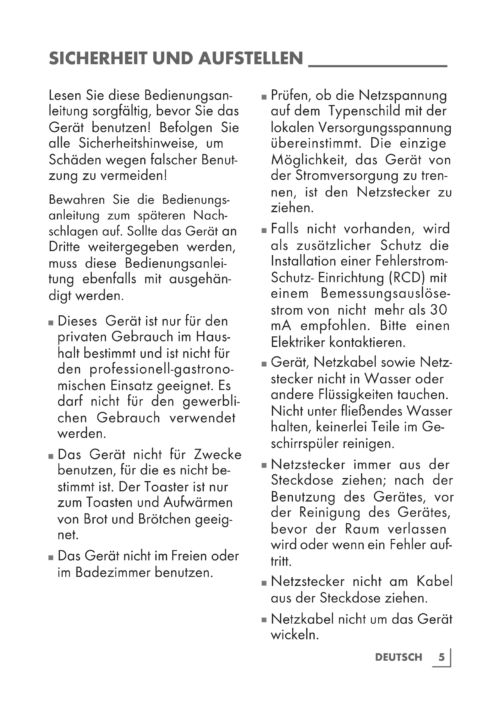 Das Gerät nicht für Zwecke benutzen, für die es nicht be- stimmt ist. Der Toaster ist nur zum Toasten und Aufwärmen von Brot und Brötchen geeig- net.