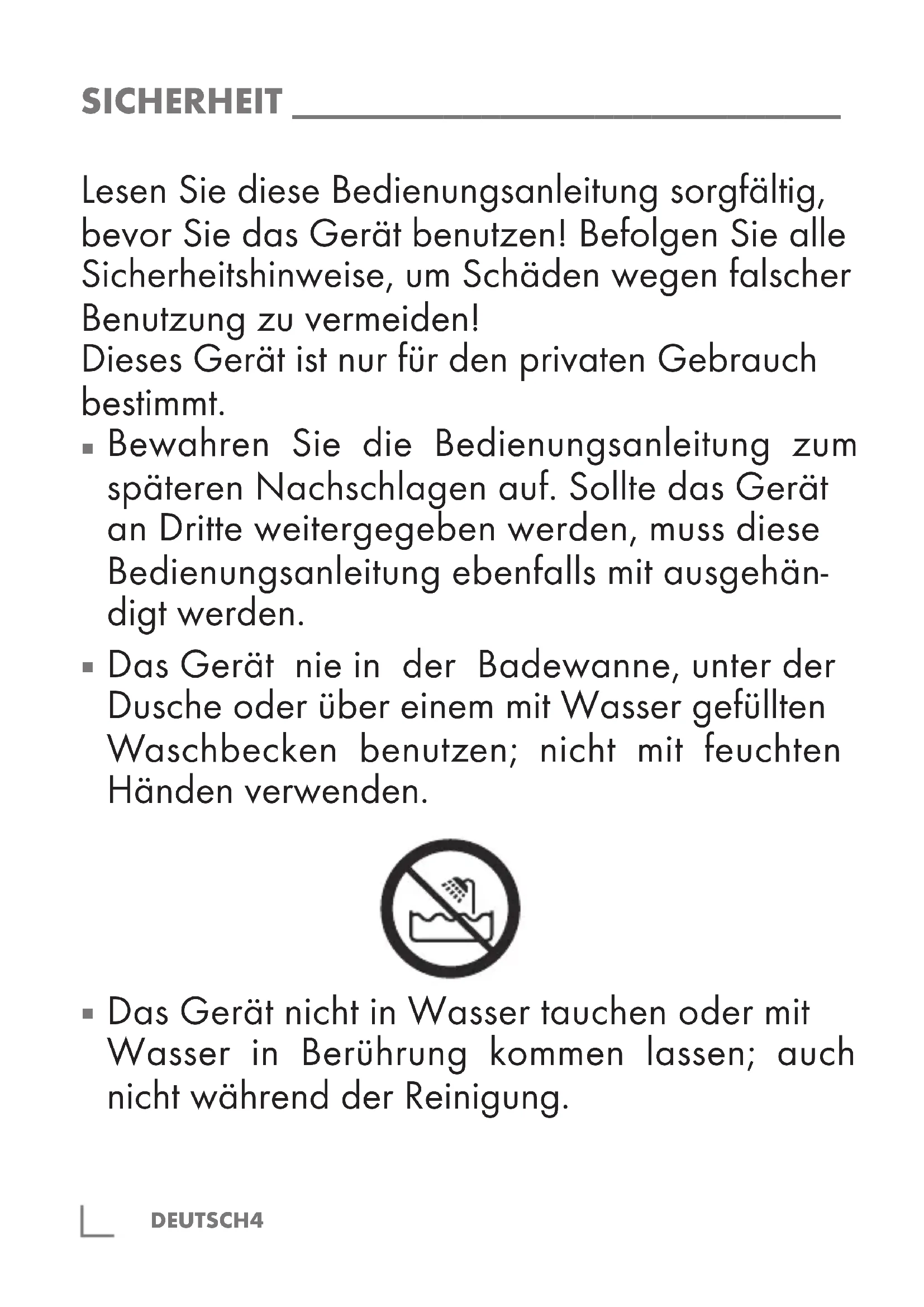 K LDEUTSCH4 SICHERHEIT _____________________________ Lesen Sie diese Bedienungsanleitung sorgfältig, bevor Sie das Gerät benutzen! Befolgen Sie alle Sicherheitshinweise, um Schäden wegen falscher Benutzung zu vermeiden! Dieses Gerät ist nur für den privaten Gebrauch bestimmt.