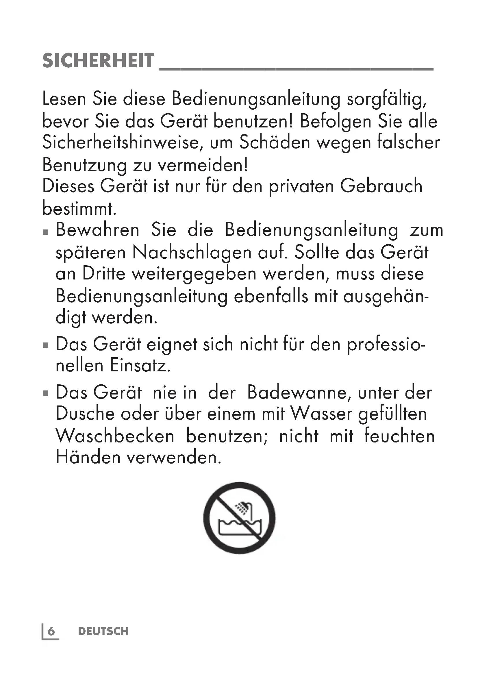 SICHERHEIT __________________________ Lesen Sie diese Bedienungsanleitung sorgfältig, bevor Sie das Gerät benutzen! Befolgen Sie alle Sicherheitshinweise, um Schäden wegen falscher Benutzung zu vermeiden! Dieses Gerät ist nur für den privaten Gebrauch bestimmt.