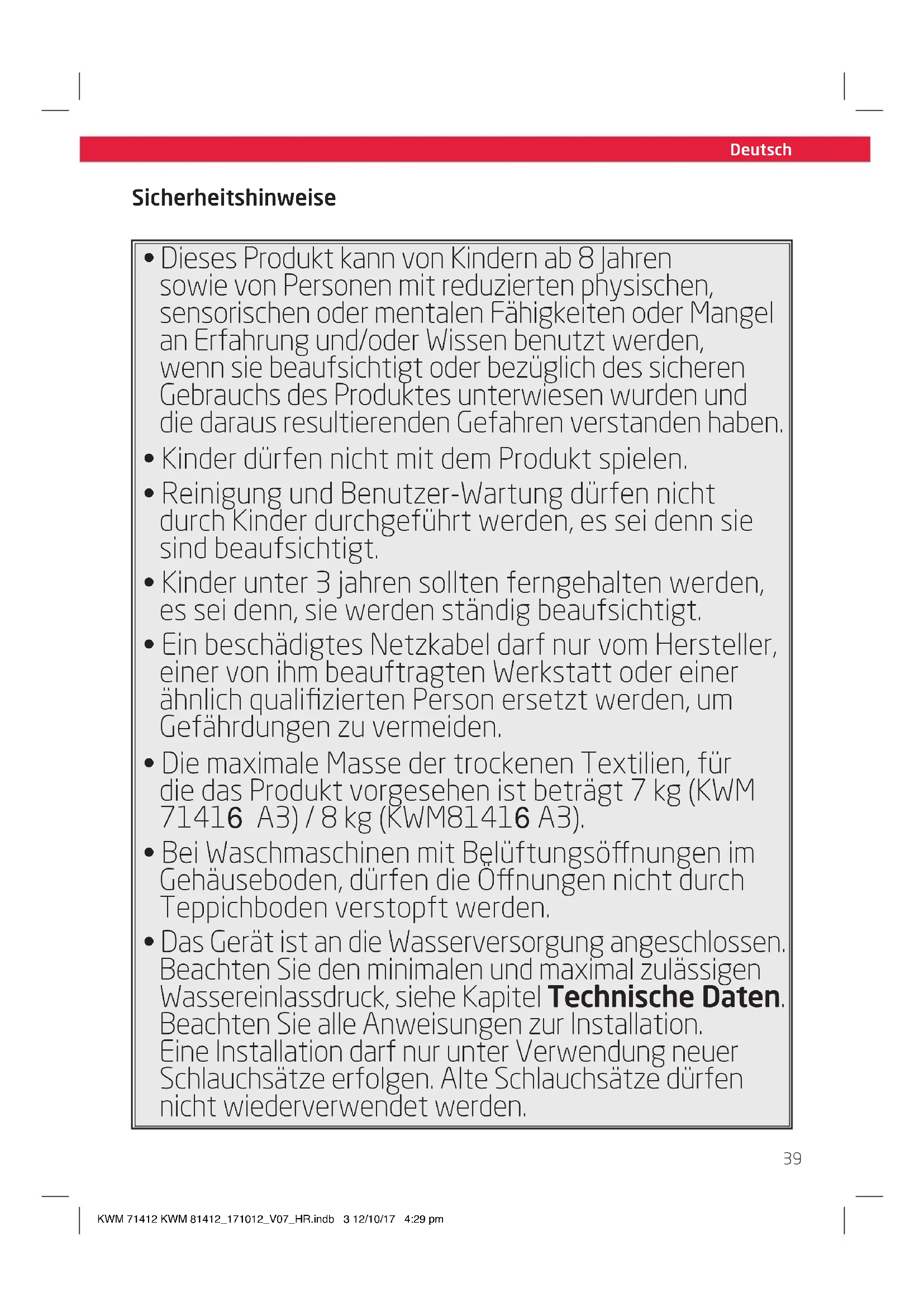 - Das Gerät ist an die Wasserversorgung angeschlossen. Beachten Sie den minimalen und maximal zulässigen Wassereinlassdruck, siehe Kapitel Technische Daten. Beachten Sie alle Anweisungen zur Installation. Eine Installation darf nur unter Verwendung neuer Schlauchsätze erfolgen. Alte Schlauchsätze dürfen nicht wiederverwendet werden. KWM 71412 KWM 81412_171012_V07_HR.indb 3 12/10/17 4:29 pmDeutsch