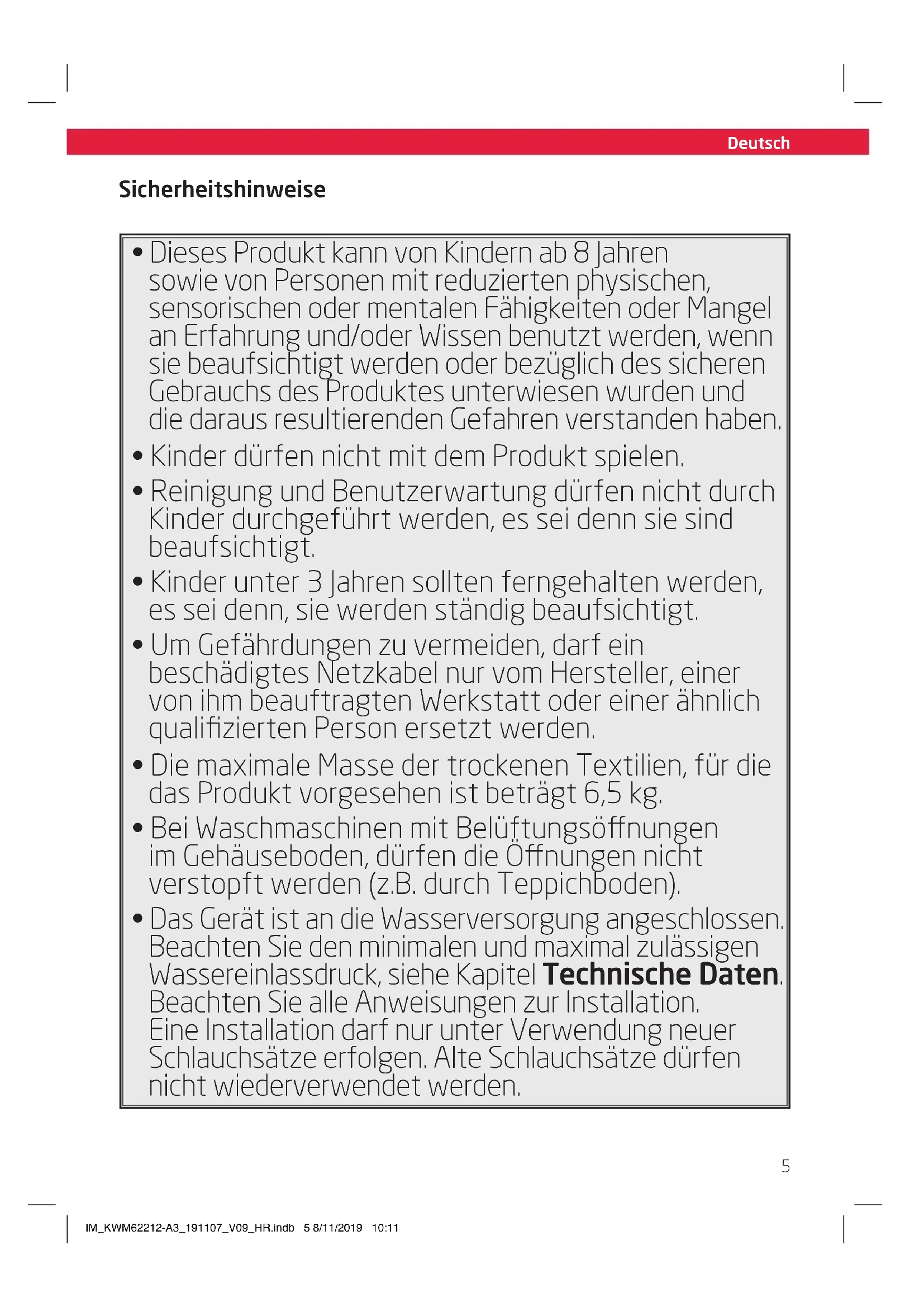- Das Gerät ist an die Wasserversorgung angeschlossen. Beachten Sie den minimalen und maximal zulässigen Wassereinlassdruck, siehe Kapitel Technische Daten. Beachten Sie alle Anweisungen zur Installation. Eine Installation darf nur unter Verwendung neuer Schlauchsätze erfolgen. Alte Schlauchsätze dürfen nicht wiederverwendet werden. IM_KWM62212-A3_191107_V09_HR.indb 5 8/11/2019 10:11Deutsch