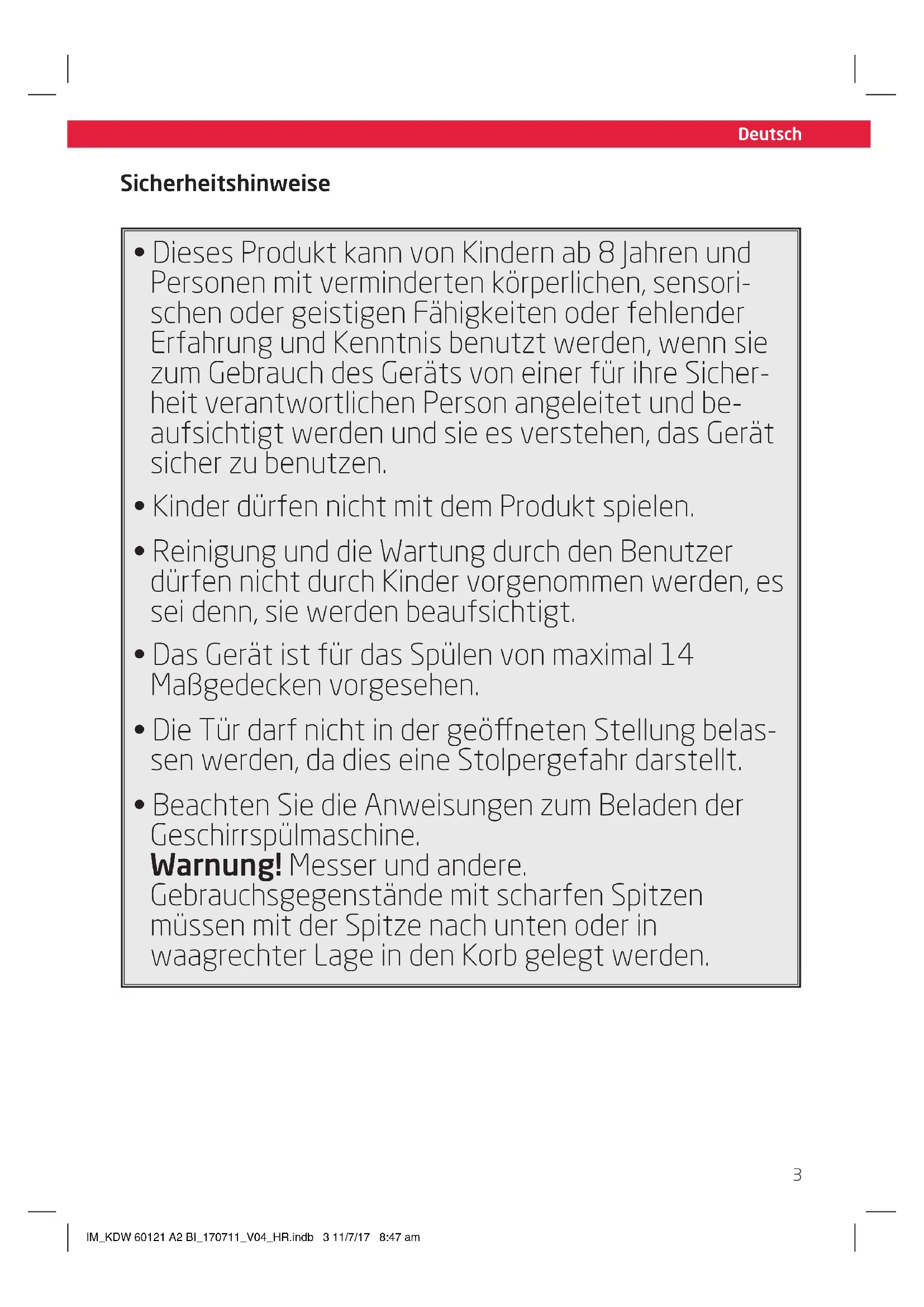 - Beachten Sie die Anweisungen zum Beladen der Geschirrspülmaschine. Warnung! Messer und andere. Gebrauchsgegenstände mit scharfen Spitzen müssen mit der Spitze nach unten oder in waagrechter Lage in den Korb gelegt werden. IM_KDW 60121 A2 BI_170711_V04_HR.indb 3 11/7/17 8:47 amDeutsch