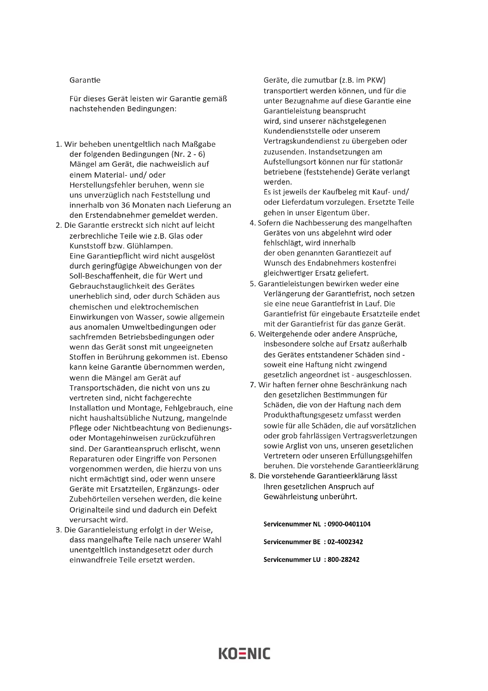 der folgenden Bedingungen (Nr. 2 - 6) Mängel am Gerät, die nachweislich auf einem Material- und/ oder Herstellungsfehler beruhen, wenn sie uns unverzüglich nach Feststellung und innerhalb von 36 Monaten nach Lieferung an den Erstendabnehmer gemeldet werden.
