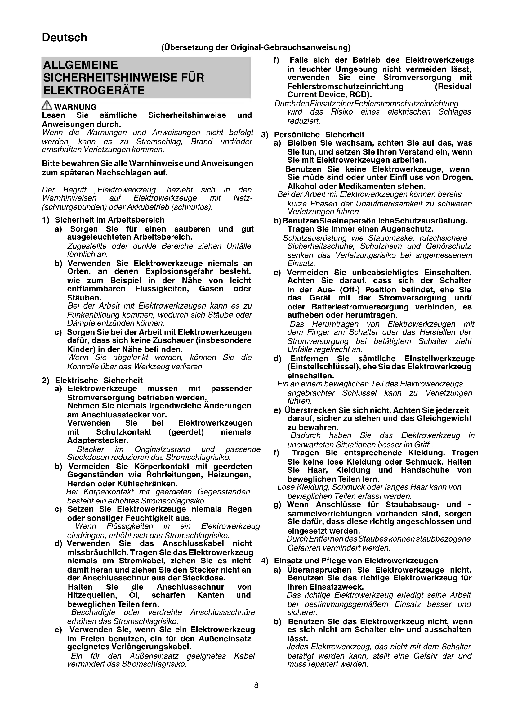a) Überanspruchen Sie Elektrowerkzeuge nicht. Benutzen Sie das richtige Elektrowerkzeug für Ihren Einsatzzweck. Das richtige Elektrowerkzeug erledigt seine Arbeit bei bestimmungsgemäßem Einsatz besser und sicherer. b) Benutzen Sie das Elektrowerkzeug nicht, wenn es sich nicht am Schalter ein- und ausschalten lässt. Jedes Elektrowerkzeug, das nicht mit dem Schalter betätigt werden kann, stellt eine Gefahr dar und muss repariert werden. ALLGEMEINE
