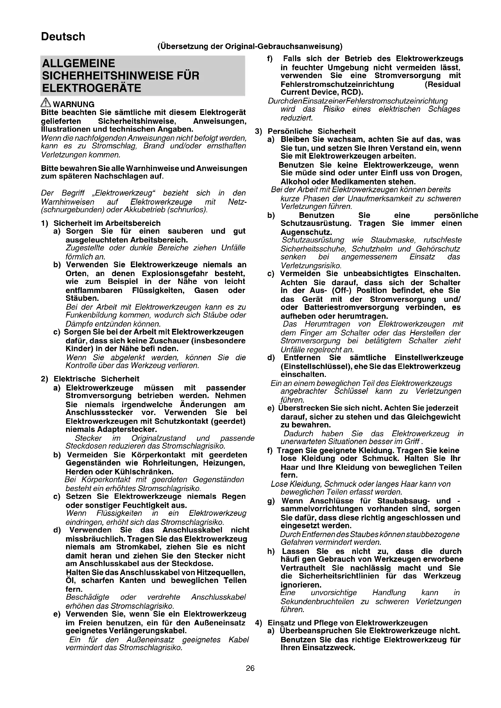 ELEKTROGERÄTE WARNUNG Bitte beachten Sie sämtliche mit diesem Elektrogerät gelieferten Sicherheitshinweise, Anweisungen, Illustrationen und technischen Angaben. Wenn die nachfolgenden Anweisungen nicht befolgt werden, kann es zu Stromschlag, Brand und/oder ernsthaften Verletzungen kommen. Bitte bewahren Sie alle Warnhinweise und Anweisungen zum späteren Nachschlagen auf. Der Begriff „Elektrowerkzeug“ bezieht sich in den Warnhinweisen auf Elektrowerkzeuge mit Netz- (schnurgebunden) oder Akkubetrieb (schnurlos).