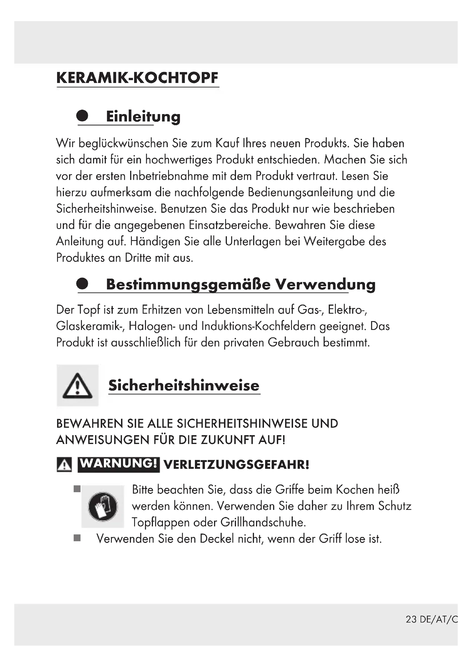 Bitte beachten Sie, dass die Griffe beim Kochen heiß werden können. Verwenden Sie daher zu Ihrem Schutz Topflappen oder Grillhandschuhe. Verwenden Sie den Deckel nicht, wenn der Griff lose ist.24 DE/AT/CH WARNUNG! GEFAHR DER SACHBESCHÄDIGUNG! Beim Kochen ist es sehr wichtig, dass Sie Töpfe und Pfannen, in denen Fett erhitzt wird, nicht aus den Augen lassen. Fett kann sich schnell überhitzen und entzünden. Wenn das Fett einmal brennen sollte, löschen Sie es niemals mit Wasser! Ersticken Sie die Flammen mit einem Topfdeckel oder einer dichten Wolldecke. Um die Antihaftbeschichtung nicht zu beschädigen, verwenden Sie nur Küchenhelfer aus hitzebeständigem Kunststoff oder Holz. Schneiden Sie das Gargut nicht direkt im Topf. Legen Sie kein tropfnasses Fleisch in heißes Fett. Durch das auf eine glühende Herdplatte spritzende Fett kann leicht ein Brand entstehen. Hohe Temperaturen können zu Verfärbungen an der Außenseite des Produkts führen. Dies ist kein Materialfehler und beeinträchtigt nicht die Qualität oder Funktion des Produkts. Wählen Sie die dem Durchmesser des Topfbodens entsprechende Kochplatte aus, um einen Hitzeverlust zu vermeiden. Der Artikel ist zum Warmhalten von Speisen im Backofen geeignet (max. 150 °C für 1 Stunde). Das heiße Produkt niemals unter laufendes kaltes Wasser halten. Die Unterseite des Produkts könnte dadurch beschädigt werden oder vom Produkt abfallen. Das Produkt ist für die Verwendung in einer Spülmaschine geeignet. Die häufige Reinigung mit scharfen Reinigungsmitteln kann zu einer Beschädigung und / oder Verfärbung des Produkts führen. Die Reinigung in der Spülmaschine kann zu Verfärbungen der Aluminium-Teile führen. ACHTUNG! Der Glasdeckel ist zerbrechlich / nicht stoßfest!25 DE/AT/CH Beim Spülen von Hand reinigen Sie den Topf mit heißem Wasser und handelsüblichem Spülmittel. Vermeiden Sie dabei den Gebrauch von scharfen und spitzen Gegenständen, um das Material nicht zu beschädigen. ACHTUNG! KRATZER! Vermeiden Sie das Hin- und Herschieben des Kochgeschirrs auf Glaskeramik-Kochfeldern! Bevor Sie mit dem Kochen beginnen, empfehlen wir Ihnen, die Oberfläche des Kochfelds und den Boden des Kochgeschirrs mit einem sauberen, fusselfreien Tuch (zum Beispiel Mikrofaser) abzuwischen. Dadurch können Sie Kratzern vorbeugen. Bitte beachten Sie, dass es bei der Verwendung dieses Produkts aufgrund der hellen Farbe zu leichten Verfärbungen kommen kann. Diese Verfärbungen sind als Gebrauchsspuren anzusehen und stellen keine Beeinträchtigung der Qualität der Beschichtung und ihrer Gebrauchstauglichkeit dar. Hinweis für Induktionskochfelder Hinweis: Unter bestimmten Umständen kann ein Geräusch auftreten, dass auf die elektromagnetischen Eigenschaften der Heizquelle und des Topfs / der Pfanne zurückzuführen ist. Dies ist normal und deutet nicht auf einen Defekt Ihres Induktionskochfeldes oder des Kochgeschirrs. Der Topf / die Pfanne ist mittig auf dem Induktionskochfeld anzuordnen. ACHTUNG! Hohe Aufheizgeschwindigkeit! Kochgeschirr beim Vorheizen nicht überhitzen. Im Fall einer Überhitzung muss der Raum gründlich gelüftet werden.26 DE/AT/CH Dieser Artikel verbindet die Vorteile von Aluminiumkochgeschirr, wie das geringe Gewicht und die hohe Wärmeleitfähigkeit, mit den Vorteilen des Kochens mit Induktion. Um dies zu ermöglichen, wurden in den Aluminiumboden magnetische Stahlelemente eingefügt. Der Boden ist von daher nicht durchgehend magnetisch, so dass es auf Induktionskochfeldern, die deutlich größer als der Bodendurchmesser sind, dazu kommen kann, dass die Induktionsspulen nicht reagieren. Dies ist kein Qualitätsmangel und stellt keine Beeinträchtigung der Funktionsfähigkeit dar. Damit der Artikel einwandfrei funktioniert, stellen Sie ihn bitte stets auf das dem Bodendurchmesser entsprechende Kochfeld. Gebrauch Bitte entfernen Sie vor dem ersten Gebrauch eventuelle Aufkleber von dem Produkt und spülen Sie es mit heißem Wasser aus. Kochen Sie den Topf vor dem ersten Gebrauch 2 bis 3 mal mit Wasser aus, um eventuelle Produktionsrückstände vollständig zu entfernen. Leeren oder mit Bratgut gefüllten Topf nicht überhitzen, da sonst der Antihafteffekt nachlässt, bzw. die Beschichtung beschädigt wird.27 DE/AT/CH Entsorgung Die Verpackung besteht aus umweltfreundlichen Materialien, die Sie über die örtlichen Recyclingstellen entsorgen können. Möglichkeiten zur Entsorgung des ausgedienten Produkts erfahren Sie bei Ihrer Gemeinde- oder Stadtverwaltung. Garantie Das Produkt wurde nach strengen Qualitätsrichtlinien sorgfältig produziert und vor Anlieferung gewissenhaft geprüft. Im Falle von Mängeln dieses Produkts stehen Ihnen gegen den Verkäufer des Produkts gesetzliche Rechte zu. Diese gesetzlichen Rechte werden durch unsere im Folgenden dargestellte Garantie nicht eingeschränkt. Sie erhalten auf dieses Produkt 3 Jahre Garantie ab Kaufdatum. Die Garantiefrist beginnt mit dem Kaufdatum. Bitte bewahren Sie den Original-Kassenbon gut auf. Diese Unterlage wird als Nachweis für den Kauf benötigt. Tritt innerhalb von 3 Jahren ab dem Kaufdatum dieses Produkts ein Material- oder Fabrikationsfehler auf, wird das Produkt von uns – nach unserer Wahl – für Sie kostenlos repariert oder ersetzt. Diese Garantie verfällt, wenn das Produkt beschädigt, nicht sachgemäß benutzt oder gewartet wurde. Die Garantieleistung gilt für Material- oder Fabrikationsfehler. Diese Garantie erstreckt sich nicht auf Produktteile, die normaler Abnutzung ausgesetzt sind (z. B. Batterien) und daher als Verschleißteile angesehen werden können oder für Beschädigungen an zerbrechlichen Teilen, z. B. Schalter, Akkus oder die aus Glas gefertigt sind.IAN 285306 IAN 285307 OWIM GmbH & Co. KG Stiftsbergstraße 1 DE-74167 Neckarsulm GERMANY IAN Model Pot size Effective bottom size Version 285306 HG00772 Ø200 mm Ø140 mm 04/2017 285307 HG00773 Ø240 mm Ø160 mm 04/2017
