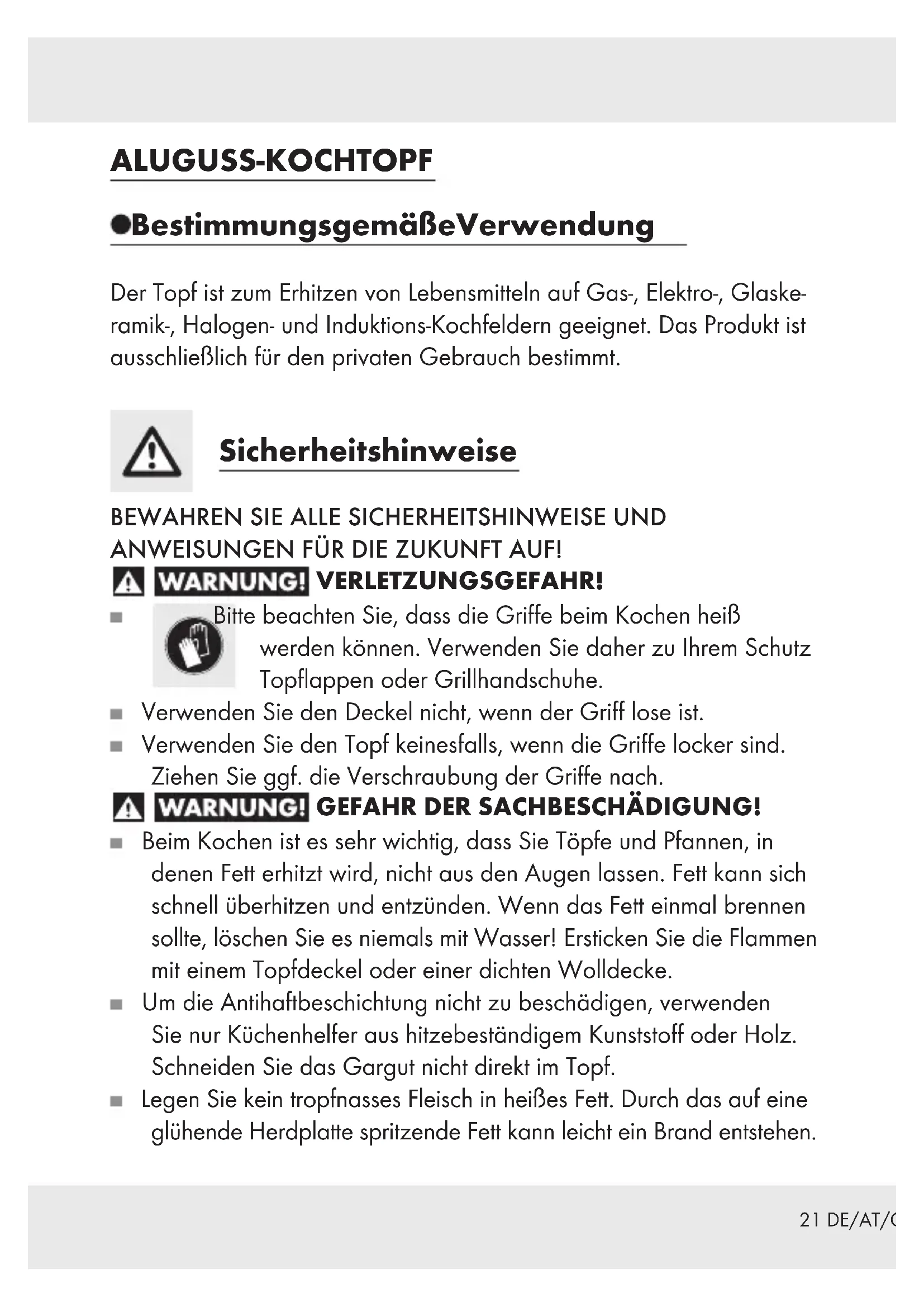ANWEISUNGEN FÜR DIE ZUKUNFT AUF! VERLETZUNGSGEFAHR! Bitte beachten Sie, dass die Griffe beim Kochen heiß werden können. Verwenden Sie daher zu Ihrem Schutz Topflappen oder Grillhandschuhe. Verwenden Sie den Deckel nicht, wenn der Griff lose ist. Verwenden Sie den Topf keinesfalls, wenn die Griffe locker sind. Ziehen Sie ggf. die Verschraubung der Griffe nach. GEFAHR DER SACHBESCHÄDIGUNG! Beim Kochen ist es sehr wichtig, dass Sie Töpfe und Pfannen, in denen Fett erhitzt wird, nicht aus den Augen lassen. Fett kann sich schnell überhitzen und entzünden. Wenn das Fett einmal brennen sollte, löschen Sie es niemals mit Wasser! Ersticken Sie die Flammen mit einem Topfdeckel oder einer dichten Wolldecke. Um die Antihaftbeschichtung nicht zu beschädigen, verwenden Sie nur Küchenhelfer aus hitzebeständigem Kunststoff oder Holz. Schneiden Sie das Gargut nicht direkt im Topf. Legen Sie kein tropfnasses Fleisch in heißes Fett. Durch das auf eine glühende Herdplatte spritzende Fett kann leicht ein Brand entstehen. 271147_271148_271150_CB3.indd 21 9/11/2015 5:09:04 PM22 DE/AT/CH Wählen Sie die dem Durchmesser des Topfbodens entsprechende Kochplatte aus, um einen Hitzeverlust zu vermeiden. Der Artikel ist zum Warmhalten von Speisen im Backofen geeignet (max. 180 °C für 1 Stunde). Das Produkt ist für die Spülmaschine geeignet. Die häufige Reinigung mit scharfen Reinigungsmitteln kann zu einer Beschädigung und / oder Verfärbung des Topfes führen. Die Reinigung in der Spülmaschine kann zu Verfärbungen der Aluminium-Teile führen. ACHTUNG! Der Glasdeckel ist zerbrechlich / nicht stoßfest! Beim Spülen von Hand reinigen Sie den Topf mit heißem Wasser und handelsüblichem Spülmittel. Vermeiden Sie dabei den Gebrauch von scharfen und spitzen Gegenständen, um das Material nicht zu beschädigen. Ziehen oder schieben Sie das Produkt nicht über die Glaskeramik- und Halogen-Kochfelder. Bei Nichtbeachtung kann es zu Beschädi- gungen durch Kratzer kommen. Bitte beachten Sie, dass es bei der Verwendung dieses Produkts aufgrund der hellen Farbe zu leichten Verfärbungen kommen kann. Diese Verfärbungen sind als Gebrauchsspuren anzusehen und stel- len keine Beeinträchtigung der Qualität der Beschichtung und ihrer Gebrauchstauglichkeit dar. P Hinweis für Induktionskochfelder J Hinweis: Unter bestimmten Umständen kann ein Geräusch auftreten, dass auf die elektromagnetischen Eigenschaften der Heizquelle und des Topfs / der Pfanne zurückzuführen ist. J Dies ist normal und deutet nicht auf einen Defekt Ihres Induktionskochfeldes oder des Kochgeschirrs. J Der Topf / die Pfanne ist mittig auf dem Induktionskochfeld 271147_271148_271150_CB3.indd 22 9/11/2015 5:09:04 PM23 DE/AT/CH anzuordnen. J ACHTUNG! Hohe Aufheizgeschwindigkeit! Kochgeschirr beim Vorheizen nicht überhitzen. J Im Fall einer Überhitzung, muss der Raum gründlich gelüftet werden. Gebrauch Bitte entfernen Sie vor dem ersten Gebrauch eventuelle Aufkleber von dem Artikel und spülen Sie ihn mit heißem Wasser aus. Kochen Sie den Topf vor dem ersten Gebrauch 2 bis 3 mal mit Wasser aus, um eventuelle Produktionsrückstände vollständig zu entfernen. Leeren oder mit Bratgut gefüllten Topf nicht überhitzen, da sonst der Antihafteffekt nachlässt, bzw. die Beschichtung beschädigt wird. Entsorgung Die Verpackung besteht aus umweltfreundlichen Materialien, die Sie über die örtlichen Recyclingstellen entsorgen können. Möglichkeiten zur Entsorgung des ausgedienten Produktes erfahren Sie bei Ihrer Gemeinde- oder Stadtverwaltung. 271147_271148_271150_CB3.indd 23 9/11/2015 5:09:04 PMOWIM GmbH & Co. KG Stiftsbergstraße 1 D-74167 Neckarsulm