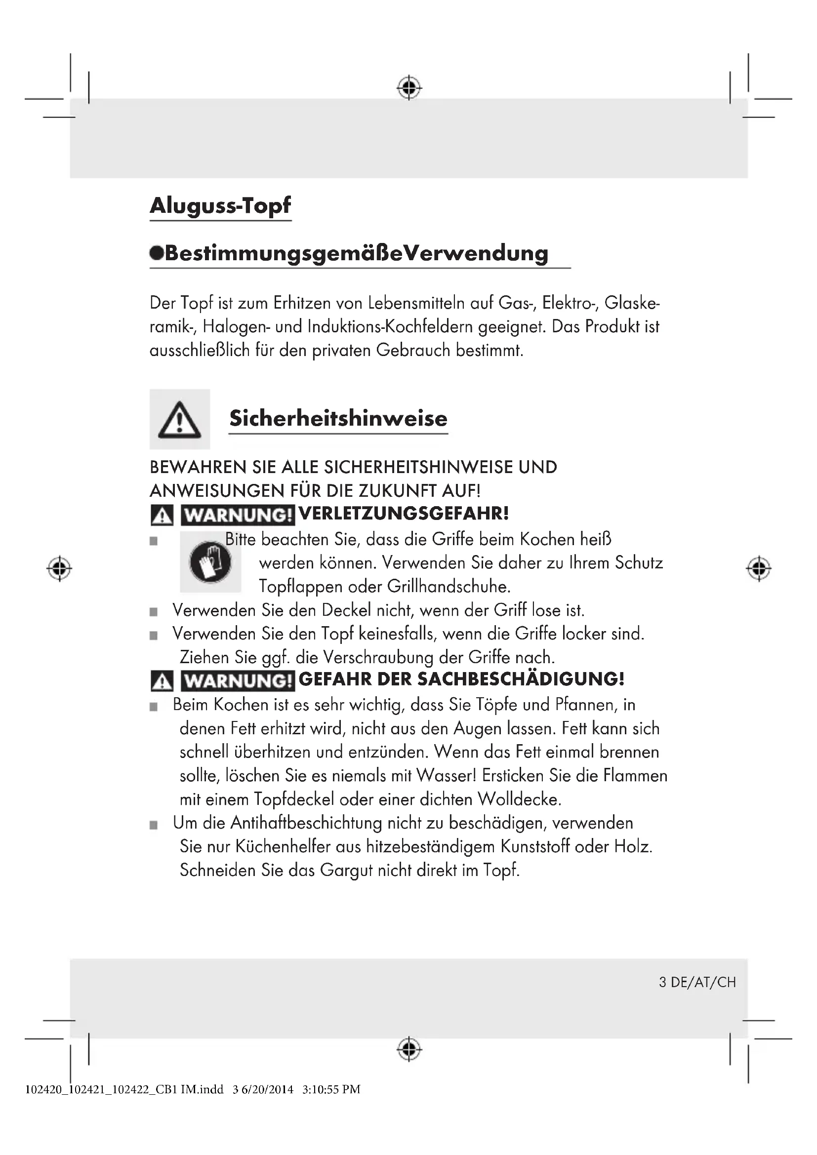 Indicazioni per l’uso e per la sicurezza 102420_102421_102422_CB1 IM.indd 3 6/20/2014 3:10:55 PMDE / AT / CH Bedienungs- und Sicherheitshinweise Seite 3 FR / CH Instructions d‘utilisation et consignes de sécurité Page 6 IT / CH Indicazioni per l’uso e per la sicurezza Pagina 9 102420_102421_102422_CB1 IM.indd 4 6/20/2014 3:10:55 PM3 DE/AT/CH Aluguss-Topf Bestimmungsgemäße Verwendung Der Topf ist zum Erhitzen von Lebensmitteln auf Gas-, Elektro-, Glaske- ramik-, Halogen- und Induktions-Kochfeldern geeignet. Das Produkt ist ausschließlich für den privaten Gebrauch bestimmt. Sicherheitshinweise