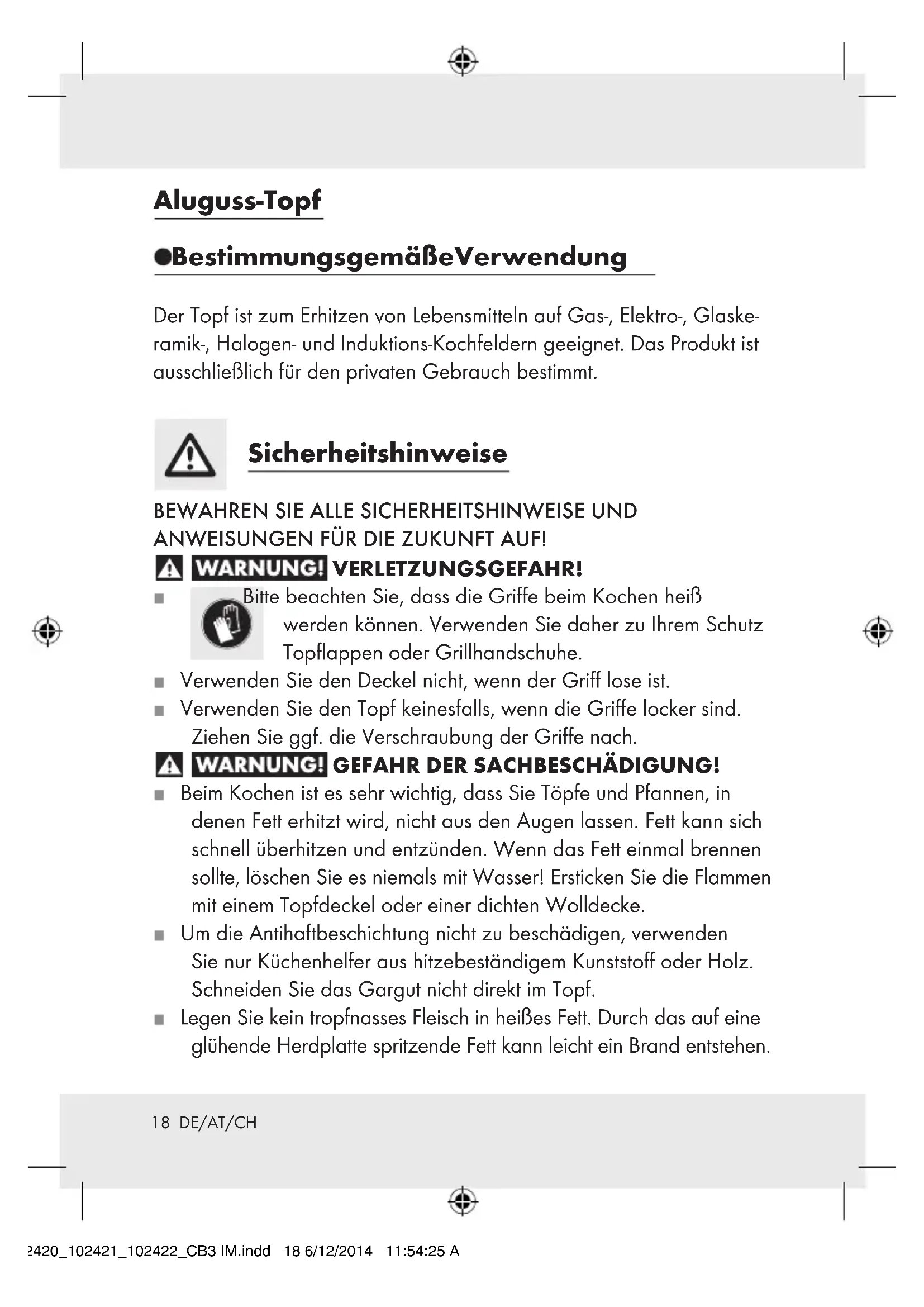 ANWEISUNGEN FÜR DIE ZUKUNFT AUF! VERLETZUNGSGEFAHR! Bitte beachten Sie, dass die Griffe beim Kochen heiß werden können. Verwenden Sie daher zu Ihrem Schutz Topflappen oder Grillhandschuhe. Verwenden Sie den Deckel nicht, wenn der Griff lose ist. Verwenden Sie den Topf keinesfalls, wenn die Griffe locker sind. Ziehen Sie ggf. die Verschraubung der Griffe nach. GEFAHR DER SACHBESCHÄDIGUNG! Beim Kochen ist es sehr wichtig, dass Sie Töpfe und Pfannen, in denen Fett erhitzt wird, nicht aus den Augen lassen. Fett kann sich schnell überhitzen und entzünden. Wenn das Fett einmal brennen sollte, löschen Sie es niemals mit Wasser! Ersticken Sie die Flammen mit einem Topfdeckel oder einer dichten Wolldecke. Um die Antihaftbeschichtung nicht zu beschädigen, verwenden Sie nur Küchenhelfer aus hitzebeständigem Kunststoff oder Holz. Schneiden Sie das Gargut nicht direkt im Topf. Legen Sie kein tropfnasses Fleisch in heißes Fett. Durch das auf eine glühende Herdplatte spritzende Fett kann leicht ein Brand entstehen. 102420_102421_102422_CB3 IM.indd 18 6/12/2014 11:54:25 AM19 DE/AT/CH Wählen Sie die dem Durchmesser des Topfbodens entsprechende Kochplatte aus, um einen Hitzeverlust zu vermeiden. Der Artikel ist zum Warmhalten von Speisen im Backofen geeignet (max. 180 °C für 1 Stunde). Das Produkt ist für die Spülmaschine geeignet. Die häufige Reinigung mit scharfen Reinigungsmitteln kann zu einer Beschädigung und / oder Verfärbung des Topfes führen. Die Reinigung in der Spülmaschine kann zu Verfärbungen der Aluminium-Teile führen. ACHTUNG! Der Glasdeckel ist zerbrechlich / nicht stoßfest! Beim Spülen von Hand reinigen Sie den Topf mit heißem Wasser und handelsüblichem Spülmittel. Vermeiden Sie dabei den Gebrauch von scharfen und spitzen Gegenständen, um das Material nicht zu beschädigen. Ziehen oder schieben Sie das Produkt nicht über die Glaskeramik- und Halogen-Kochfelder. Bei Nichtbeachtung kann es zu Beschädi- gungen durch Kratzer kommen. Bitte beachten Sie, dass es bei der Verwendung dieses Produkts aufgrund der hellen Farbe zu leichten Verfärbungen kommen kann. Diese Verfärbungen sind als Gebrauchsspuren anzusehen und stel- len keine Beeinträchtigung der Qualität der Beschichtung und ihrer Gebrauchstauglichkeit dar. Gebrauch Bitte entfernen Sie vor dem ersten Gebrauch eventuelle Aufkleber von dem Artikel und spülen Sie ihn mit heißem Wasser aus. Kochen Sie den Topf vor dem ersten Gebrauch 2 bis 3 mal mit Wasser aus, um eventuelle Produktionsrückstände vollständig zu entfernen. Achten Sie darauf, den Topf nicht in leerem Zustand zu erwärmen. 102420_102421_102422_CB3 IM.indd 19 6/12/2014 11:54:25 AM20 DE/AT/CH Entsorgung Die Verpackung besteht aus umweltfreundlichen Materialien, die Sie über die örtlichen Recyclingstellen entsorgen können. Möglichkeiten zur Entsorgung des ausgedienten Produktes erfahren Sie bei Ihrer Gemeinde- oder Stadtverwaltung. 102420_102421_102422_CB3 IM.indd 20 6/12/2014 11:54:25 AMOWIM GmbH & Co. KG Stiftsbergstraße 1 D-74167 Neckarsulm IAN Model Pot size Effective bottom size Version 102420 102420-14-01 102420-14-02 102420-14-03 102420-14-04 Ø200mm Ø155mm 07/2014 102421 102421-14-01 102421-14-02 102421-14-03 102421-14-04 Ø240mm Ø195mm 07/2014 102422 102422-14-01 102422-14-02 102422-14-03 102422-14-04 Ø280mm Ø215mm 07/2014