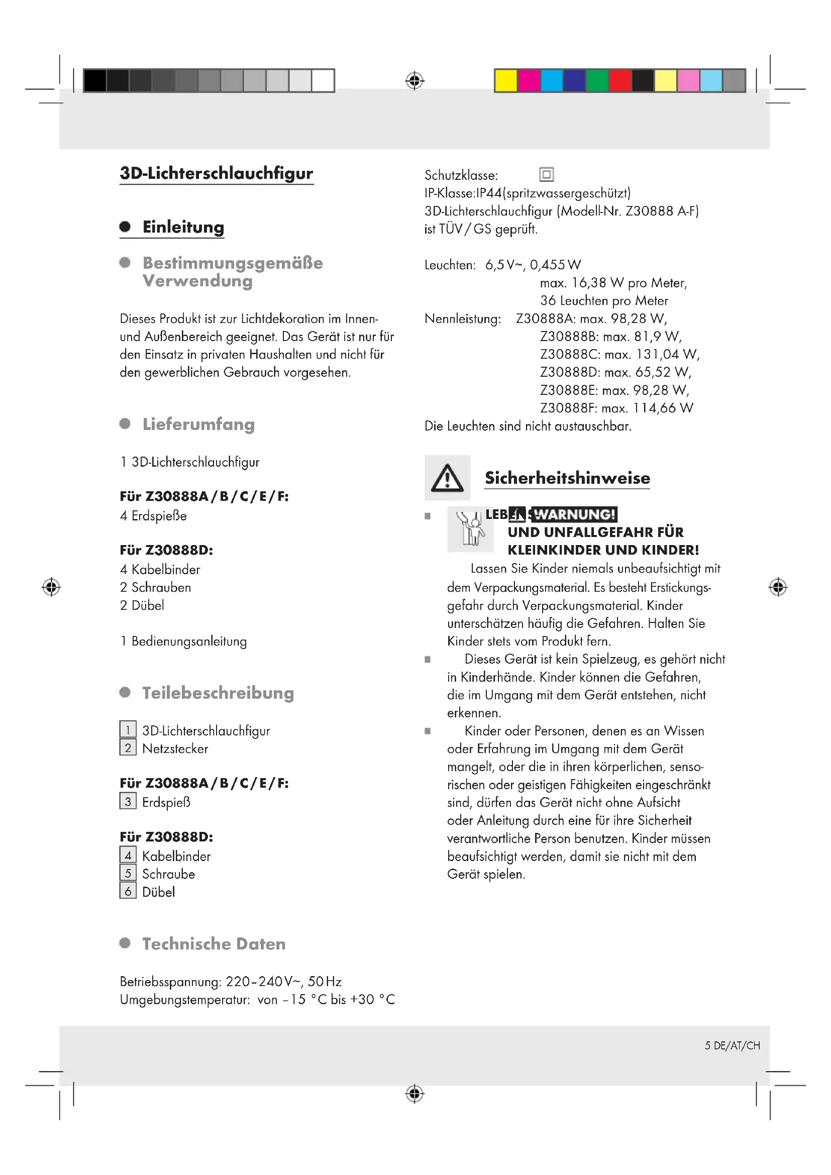 Dübel Technische Daten Betriebsspannung: 220–240 V∼, 50 Hz Umgebungstemperatur: von –15 °C bis +30 °C Schutzklasse: IP-Klasse: IP44 (spritzwassergeschützt) 3D-Lichterschlauchfigur (Modell-Nr. Z30888 A-F) ist TÜV / GS geprüft. Leuchten: 6,5 V∼, 0,455 W max. 16,38 W pro Meter, 36 Leuchten pro Meter Nennleistung: Z30888A: max. 98,28 W, Z30888B: max. 81,9 W, Z30888C: max. 131,04 W, Z30888D: max. 65,52 W, Z30888E: max. 98,28 W, Z30888F: max. 114,66 W Die Leuchten sind nicht austauschbar. Sicherheitshinweise LEBENS-