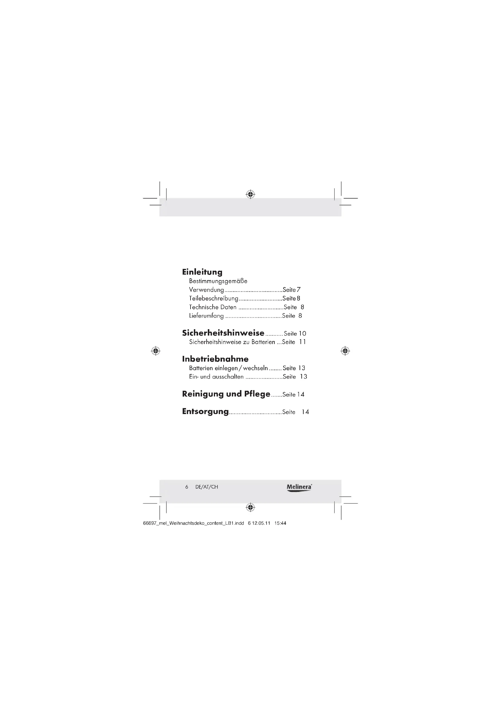 66697_mel_Weihnachtsdeko_content_LB1.indd 5 12.05.11 15:446 DE/AT/CH Einleitung Bestimmungsgemäße Ver wendung ....................................Seite 7 Teilebeschreibung ...........................S eite 8 Technische Daten ............................Seite 8 Lieferumfang ...................................Seite 8 Sicherheitshinweise ........... Seite 10 Sicherheitshinweise zu Batterien ...Seite 11 Inbetriebnahme Batterien einlegen / wechseln ........ Seite 13 Ein- und ausschalten .......................Seite 13 Reinigung und Pflege .......Seite 14 Entsorgung.................................Seite 14 66697_mel_Weihnachtsdeko_content_LB1.indd 6 12.05.11 15:447 DE/AT/CH LED-Christbaumschmuck