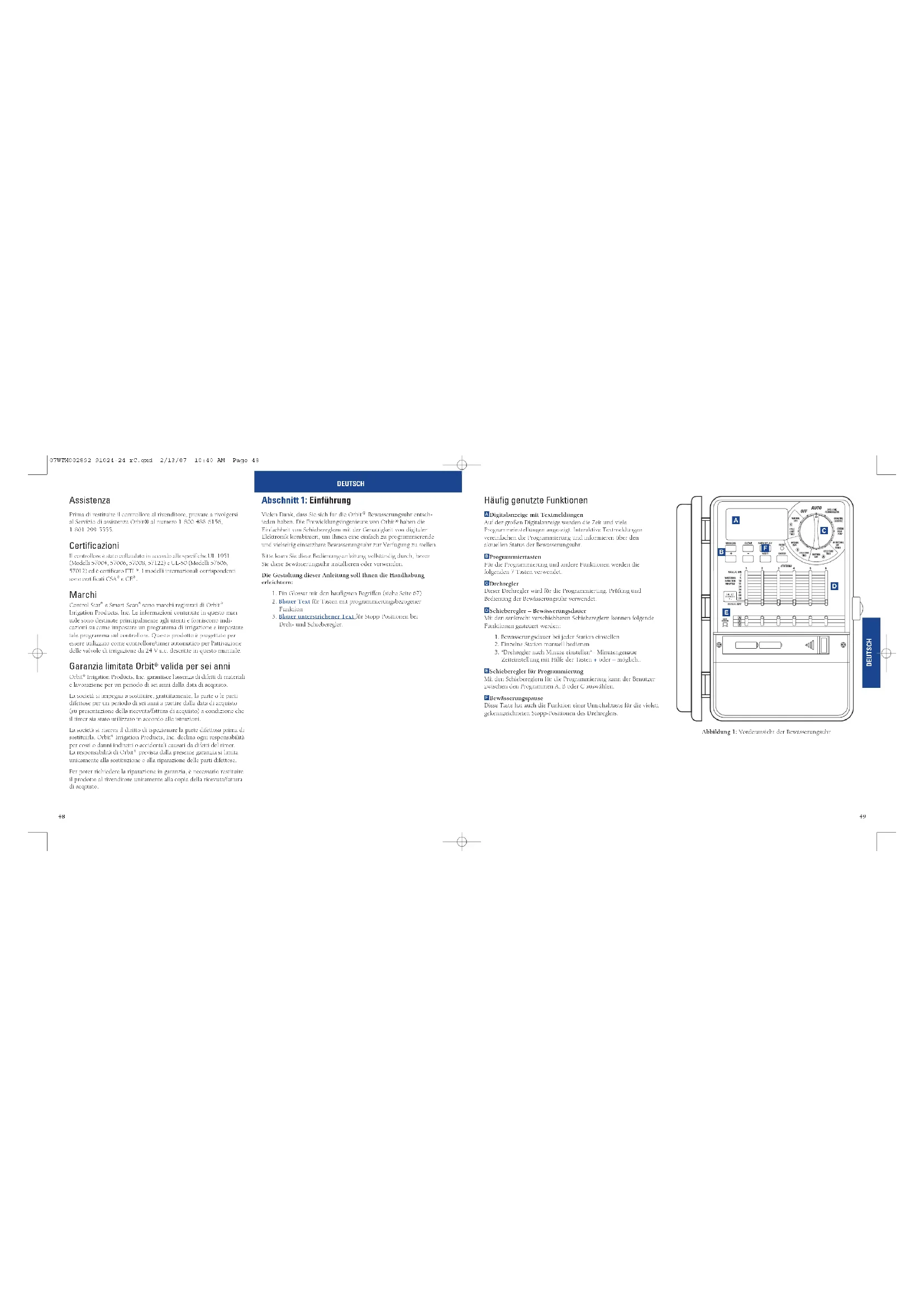 - Seguire le istruzioni riportate nella Sezione 8 a pagina 39 Figura A5: Uso di una scatola di giunzione 1/2" (13 mm) NPT Rubinetto di regolazione Scatola di connessione Connettori Piastra Secondaria C.A. Nero Rubinetto Di RegolazioneBiancoVerdeModelliCon CavoDi AlimentazioneFermo Del Cavo Di AlimentazioneTre Fili ConSpiraline Figura A4: Rimozione del cavo di alimentazione ITALIANO 07WTM002892 91024-24 rC.qxd 2/13/07 10:40 AM Page 46Häufig genutzte Funktionen A Digitalanzeige mit Textmeldungen Auf der großen Digitalanzeige werden die Zeit und viele Programmeinstellungen angezeigt. Interaktive Textmeldungen vereinfachen die Programmierung und informieren über den aktuellen Status der Bewässerungsuhr. B Programmiertasten Für die Programmierung und andere Funktionen werden die folgenden 7 Tasten verwendet. C Drehregler Dieser Drehregler wird für die Programmierung, Prüfung und Bedienung der Bewässerungsuhr verwendet. D Schieberegler – Bewässerungsdauer Mit den senkrecht verschiebbaren Schiebereglern können folgende Funktionen gesteuert werden:
