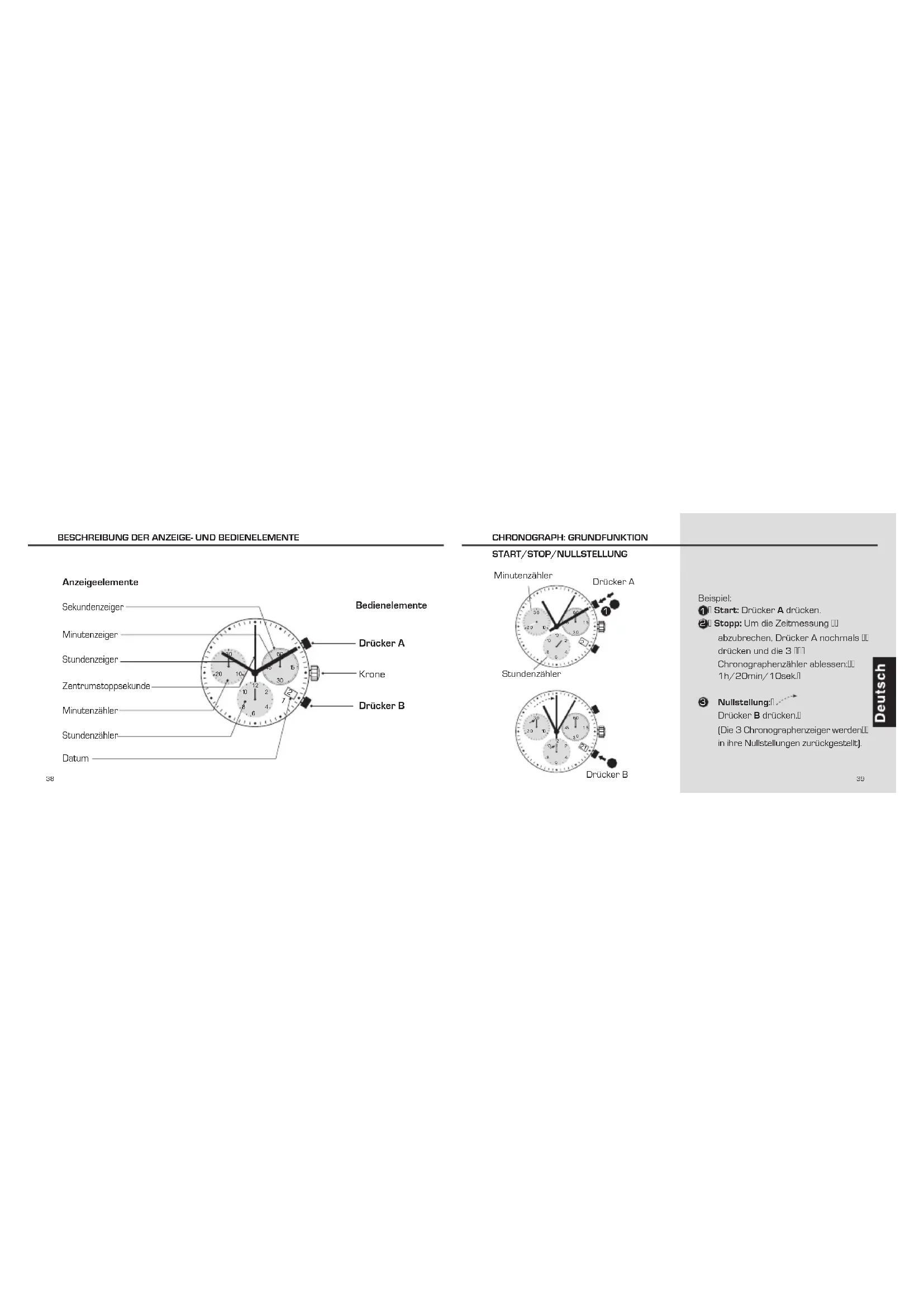 Beispiel: Start: Drücker A drücken. Stopp: Um die Zeitmessung abzubrechen, Drücker A nochmals drücken und die 3 Chronographenzähler ablessen: 1h/20min/10sek. Nullstellung: Drücker B drücken. (Die 3 Chronographenzeiger werden in ihre Nullstellungen zurückgestellt).