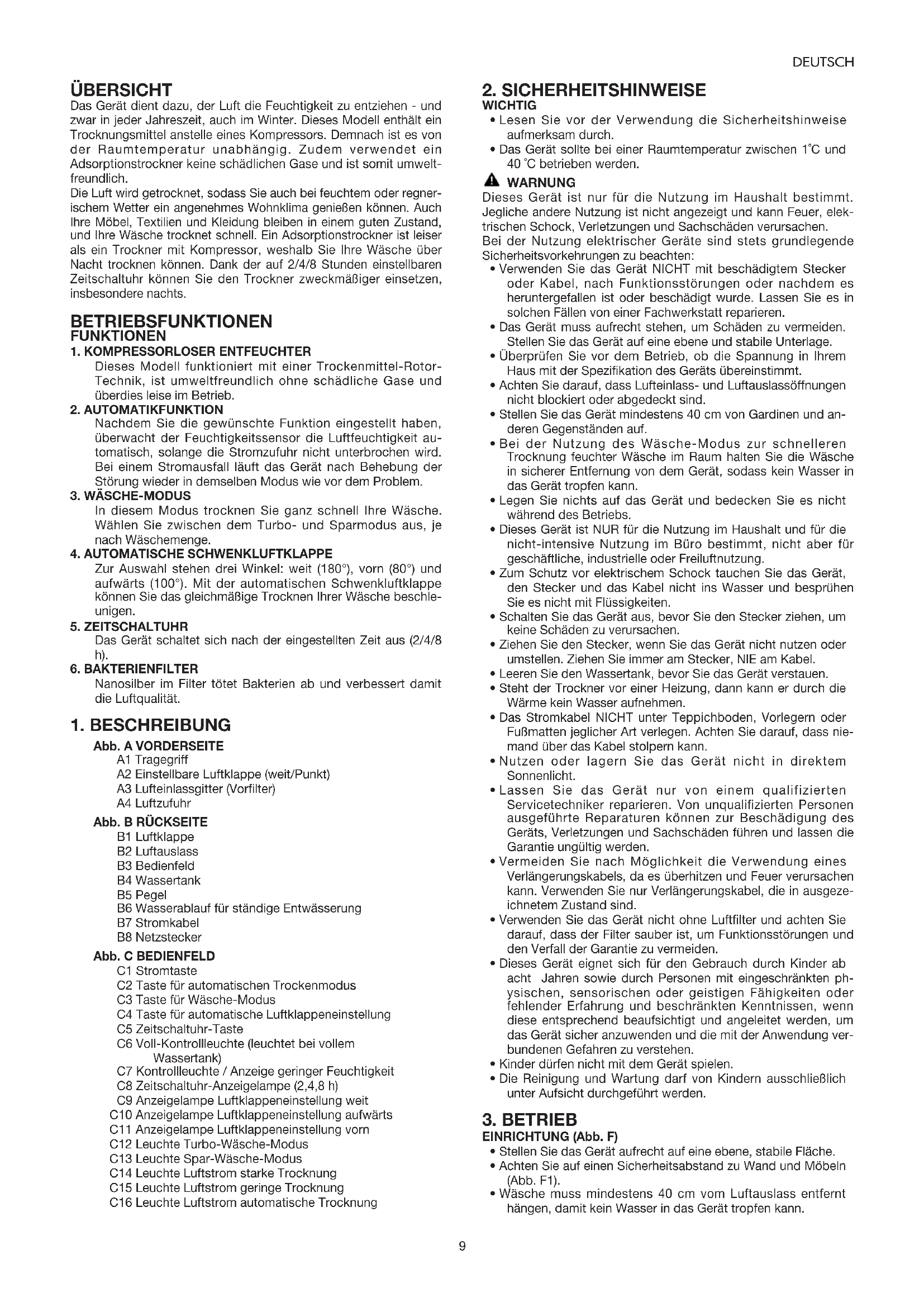 Abb. A VORDERSEITE A1 Tragegriff A2 Einstellbare Luftklappe (weit/Punkt) A3 Lufteinlassgitter (Vorfilter) A4 Luftzufuhr Abb. B RÜCKSEITE B1 Luftklappe B2 Luftauslass B3 Bedienfeld B4 Wassertank B5 Pegel B6 Wasserablauf für ständige Entwässerung B7 Stromkabel B8 Netzstecker Abb. C BEDIENFELD C1 Stromtaste C2 Taste für automatischen Trockenmodus C3 Taste für Wäsche-Modus C4 Taste für automatische Luftklappeneinstellung C5 Zeitschaltuhr-Taste C6 Voll-Kontrollleuchte (leuchtet bei vollem Wassertank) C7 Kontrollleuchte / Anzeige geringer Feuchtigkeit C8 Zeitschaltuhr-Anzeigelampe (2,4,8 h) C9 Anzeigelampe Luftklappeneinstellung weit C10 Anzeigelampe Luftklappeneinstellung aufwärts C11 Anzeigelampe Luftklappeneinstellung vorn C12 Leuchte Turbo-Wäsche-Modus C13 Leuchte Spar-Wäsche-Modus C14 Leuchte Luftstrom starke Trocknung C15 Leuchte Luftstrom geringe Trocknung C16 Leuchte Luftstrom automatische Trocknung